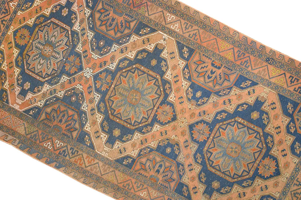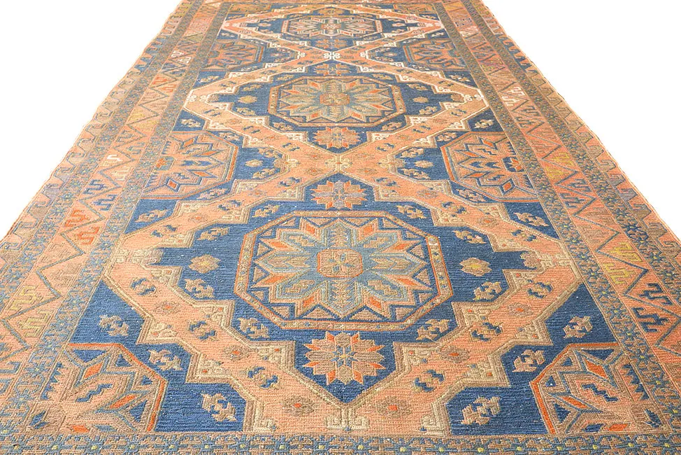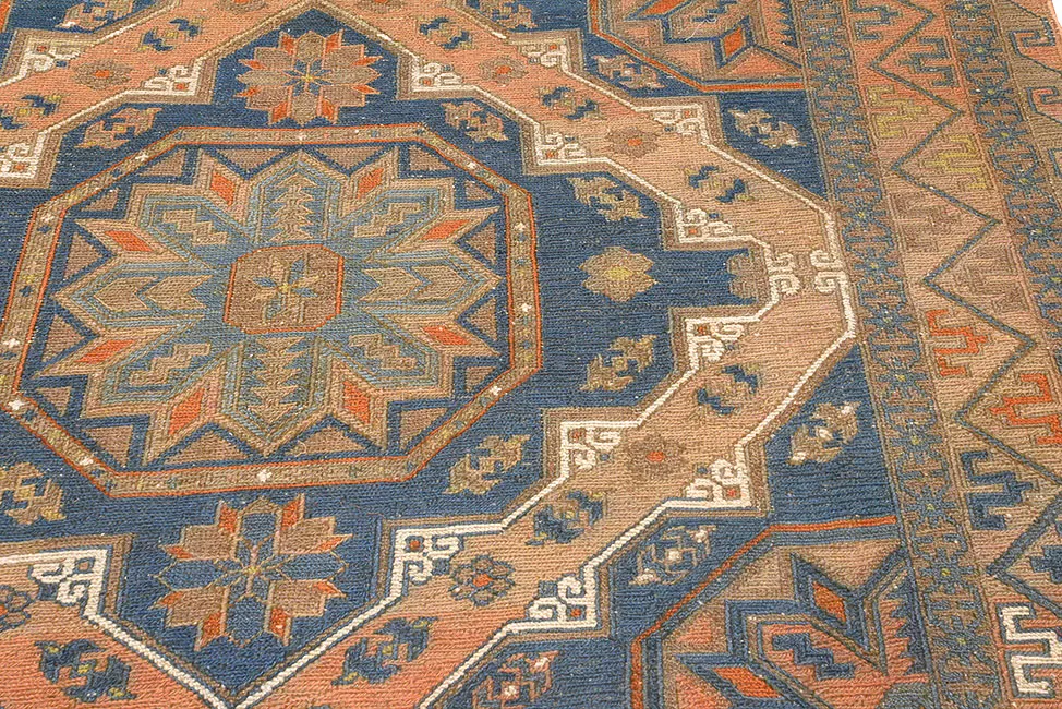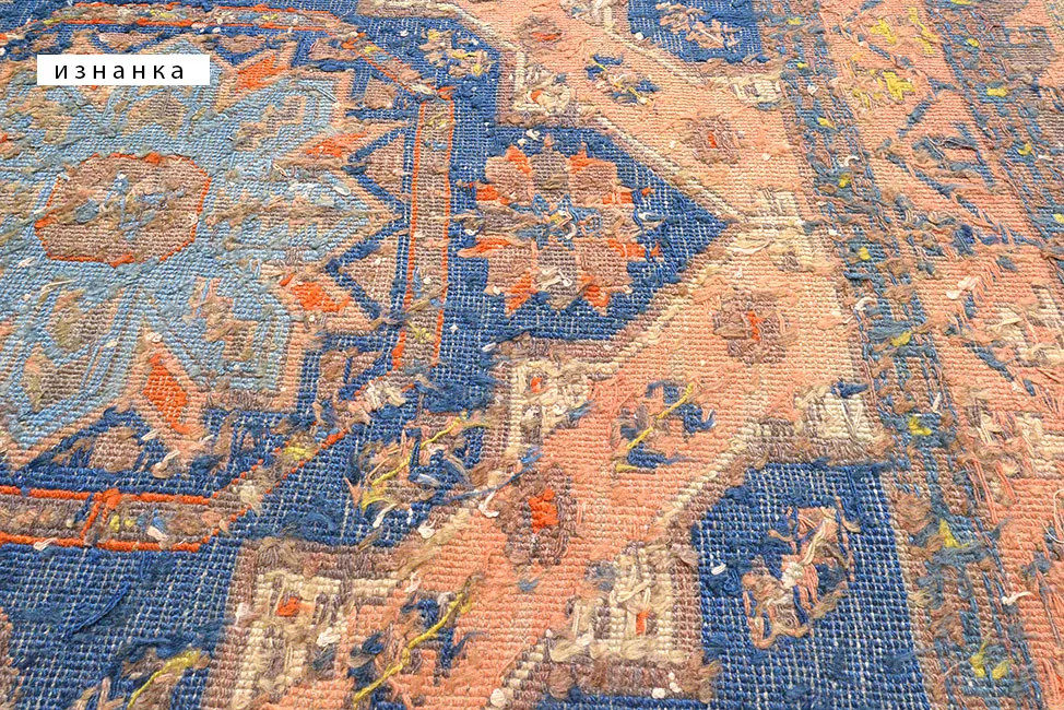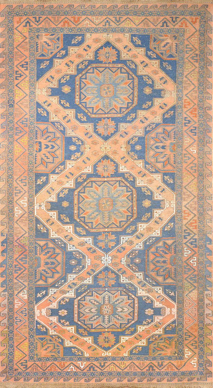 Ковер ручной работы без ворса (сумах). Соткан в Дербенте (Дагестан, РФ) в 50-х годах ХХ века. Традиционная технология ручного ковроткачества. Высококачественная шерсть и натуральные красители. Висел на стене. В отличном состоянии. Практичен для активной напольной эксплуатации.
