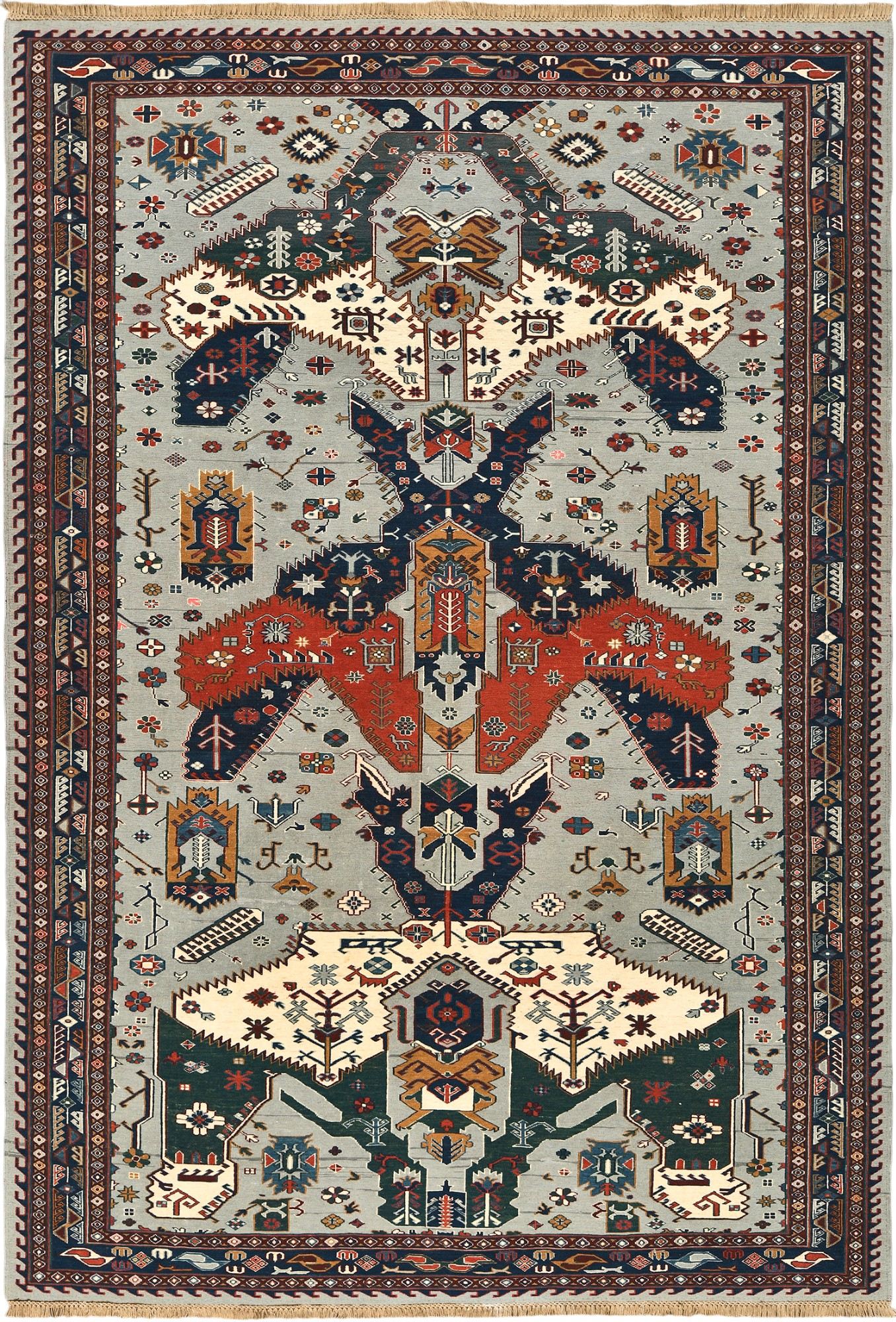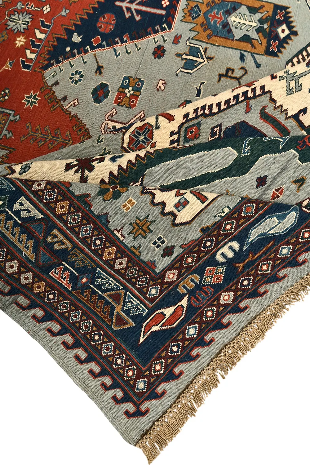 Безворсовый ковер-сумах Dragon из Пакистана выполнен вручную из натуральной шерсти и украшен ярким геометрическим рисунком с восточными мотивами. Его насыщенные оттенки и необычный орнамент создают атмосферу уюта и подчеркивают стильное оформление современного или классического интерьера.