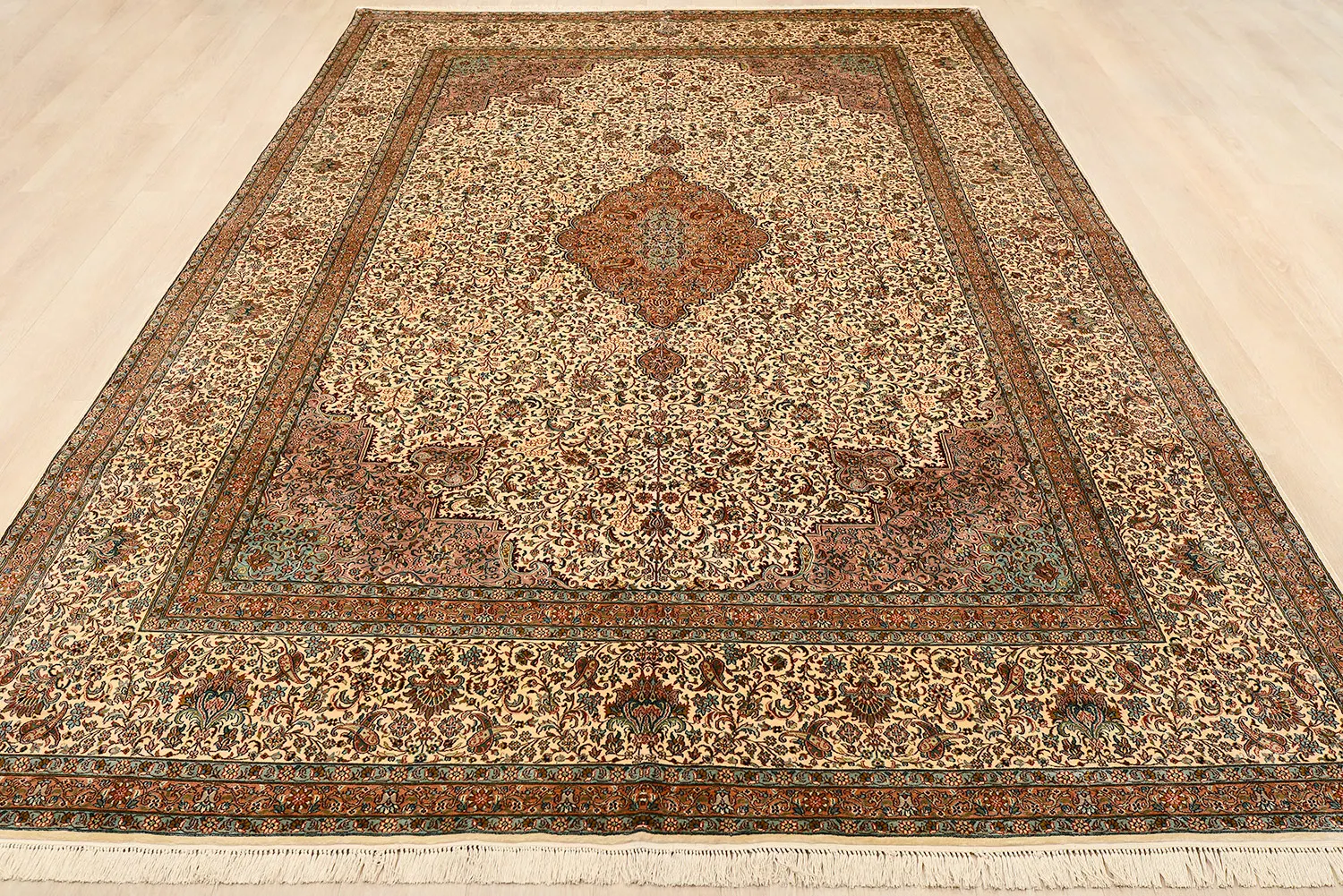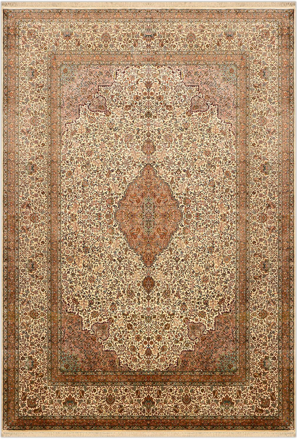 Элитный шелковый ковер ручной работы. Классический персидский орнамент в светлой цветовой гамме.