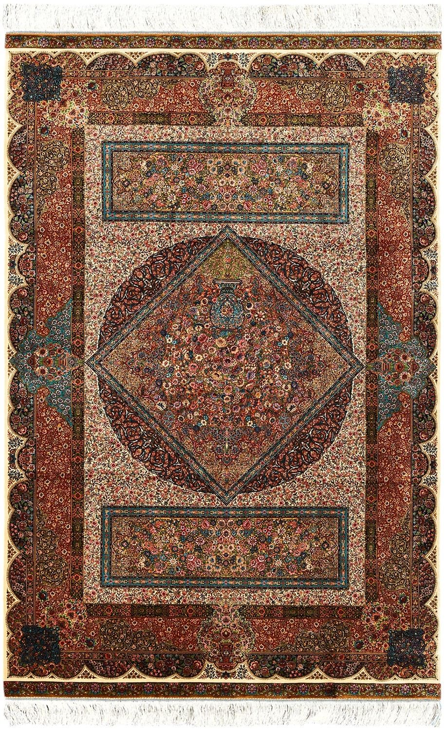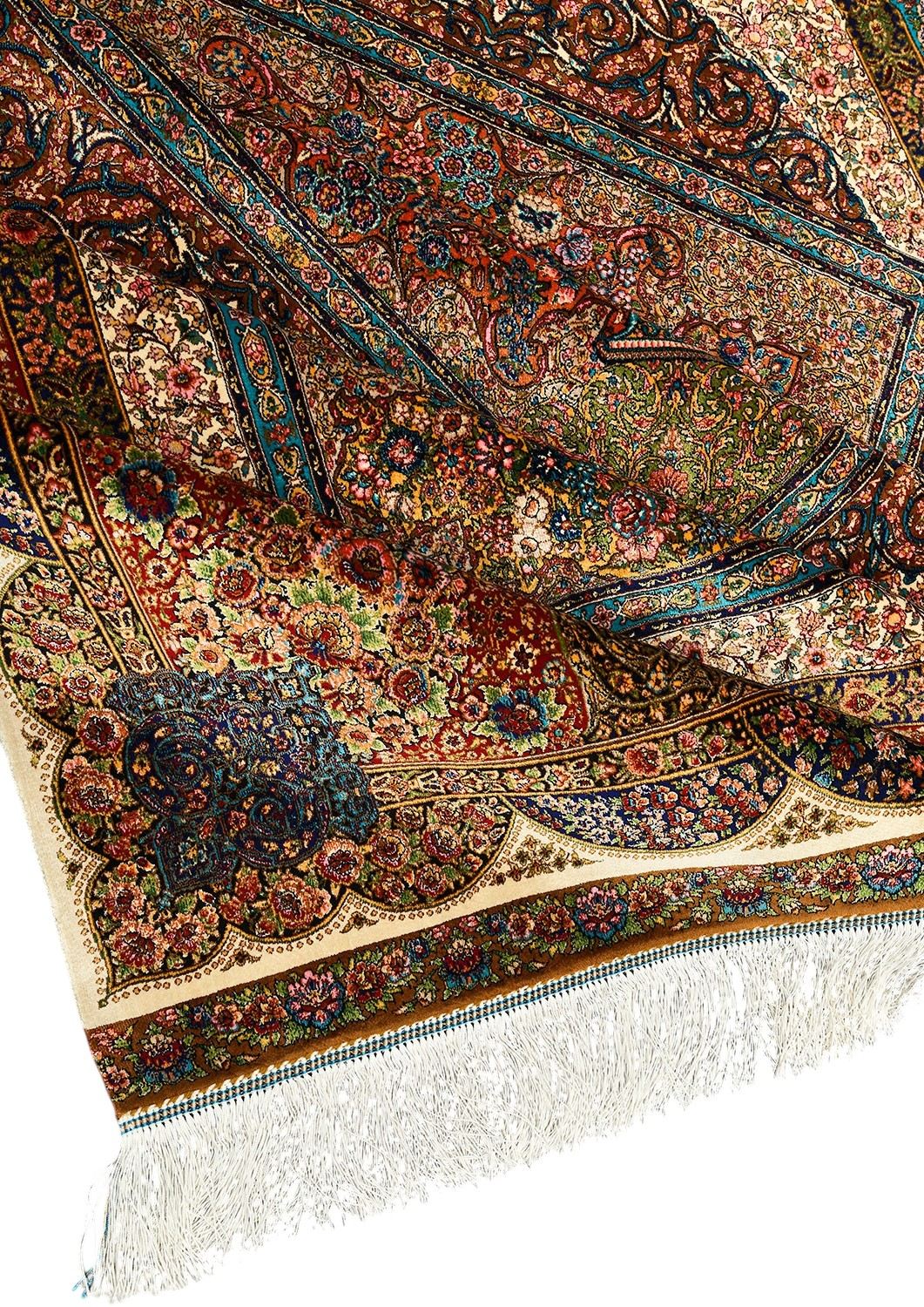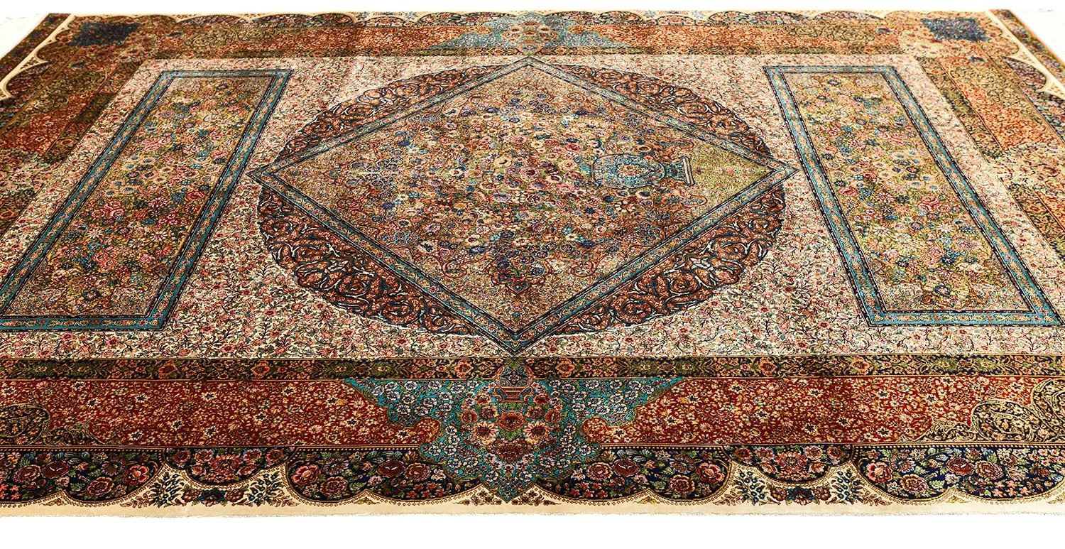 Изысканный иранский ковёр, сотканный из бамбукового и натурального шелка, завораживает своим сложным орнаментом. Ручная обработка бахромы и оверлока придаёт ему элегантности и уникальности.