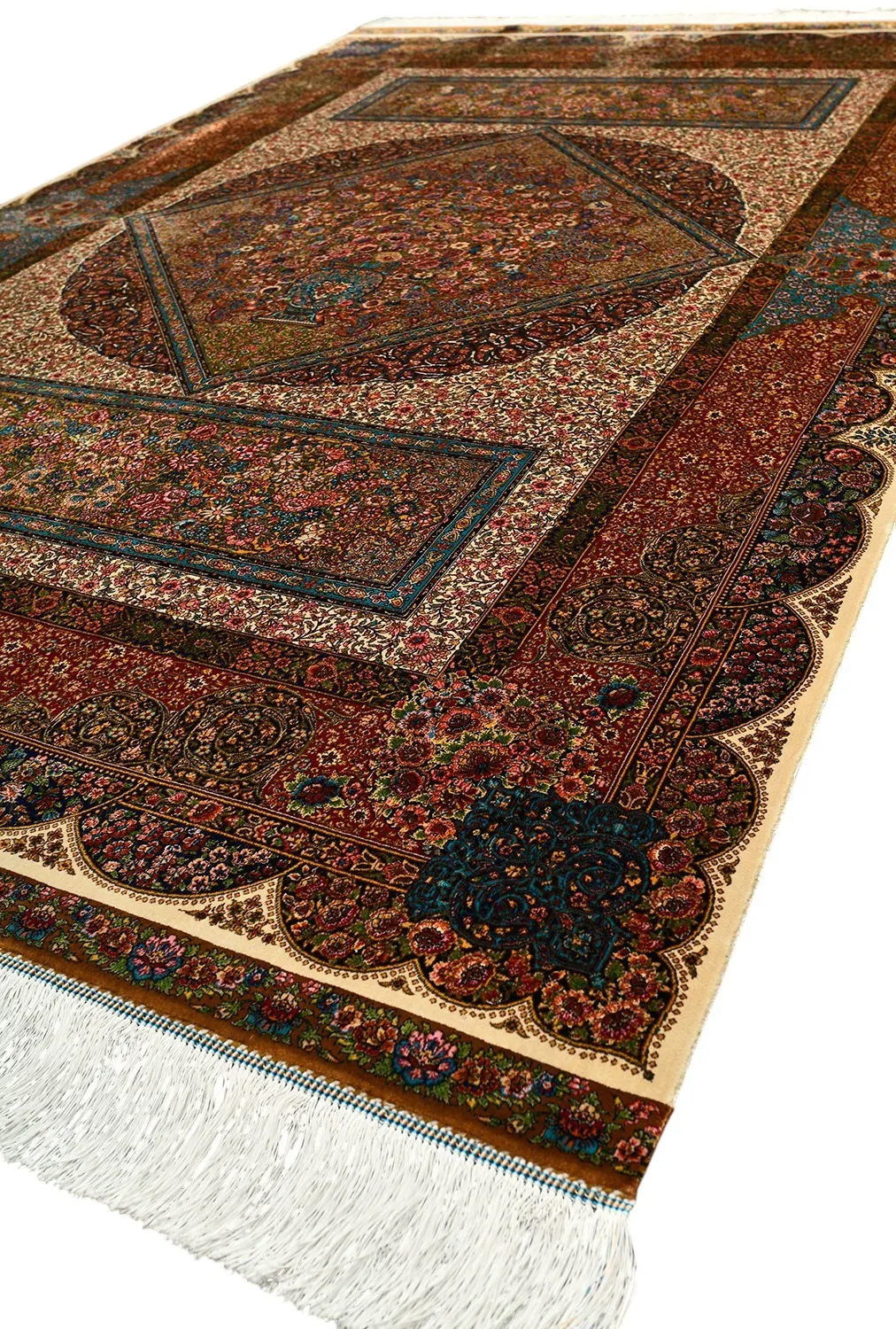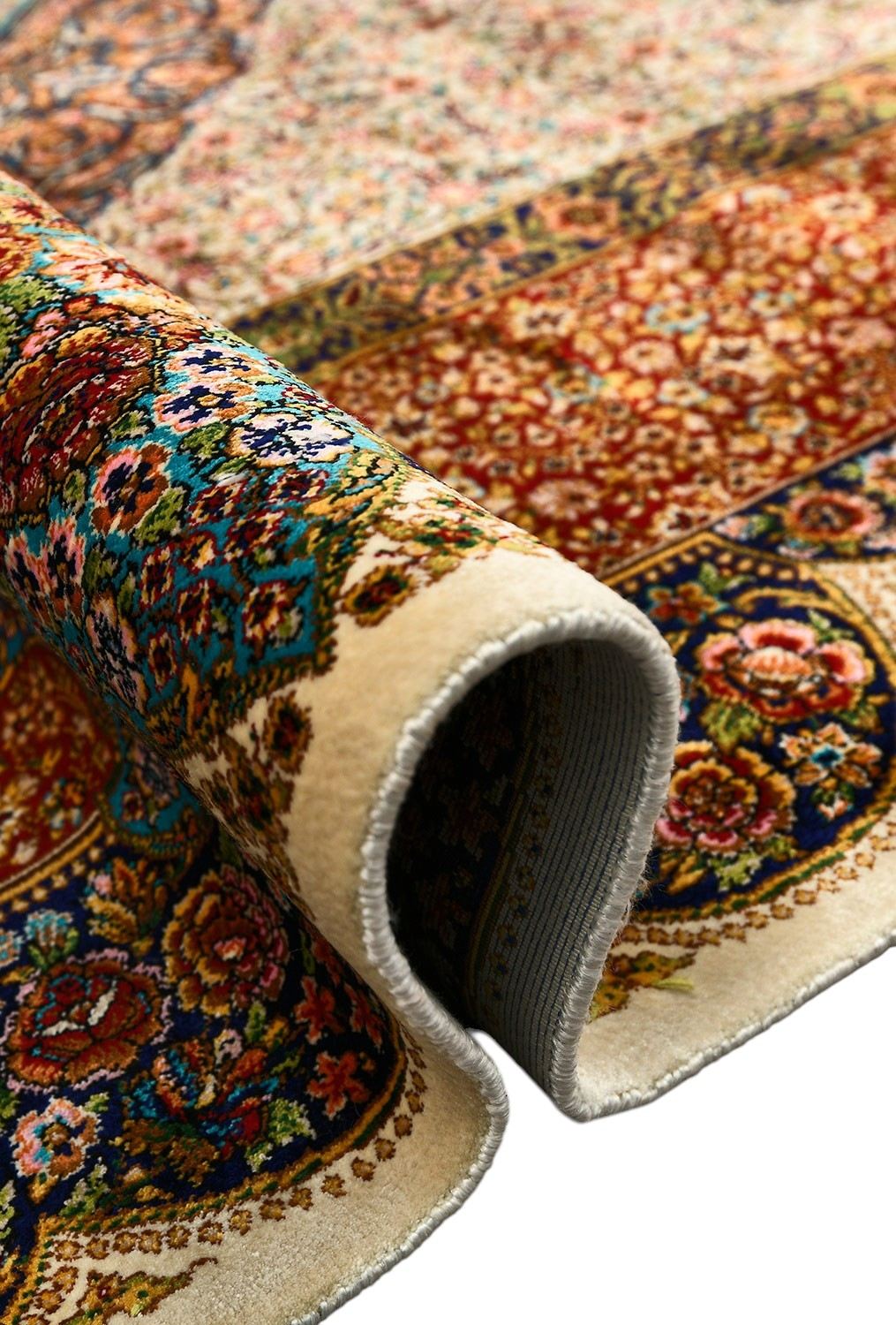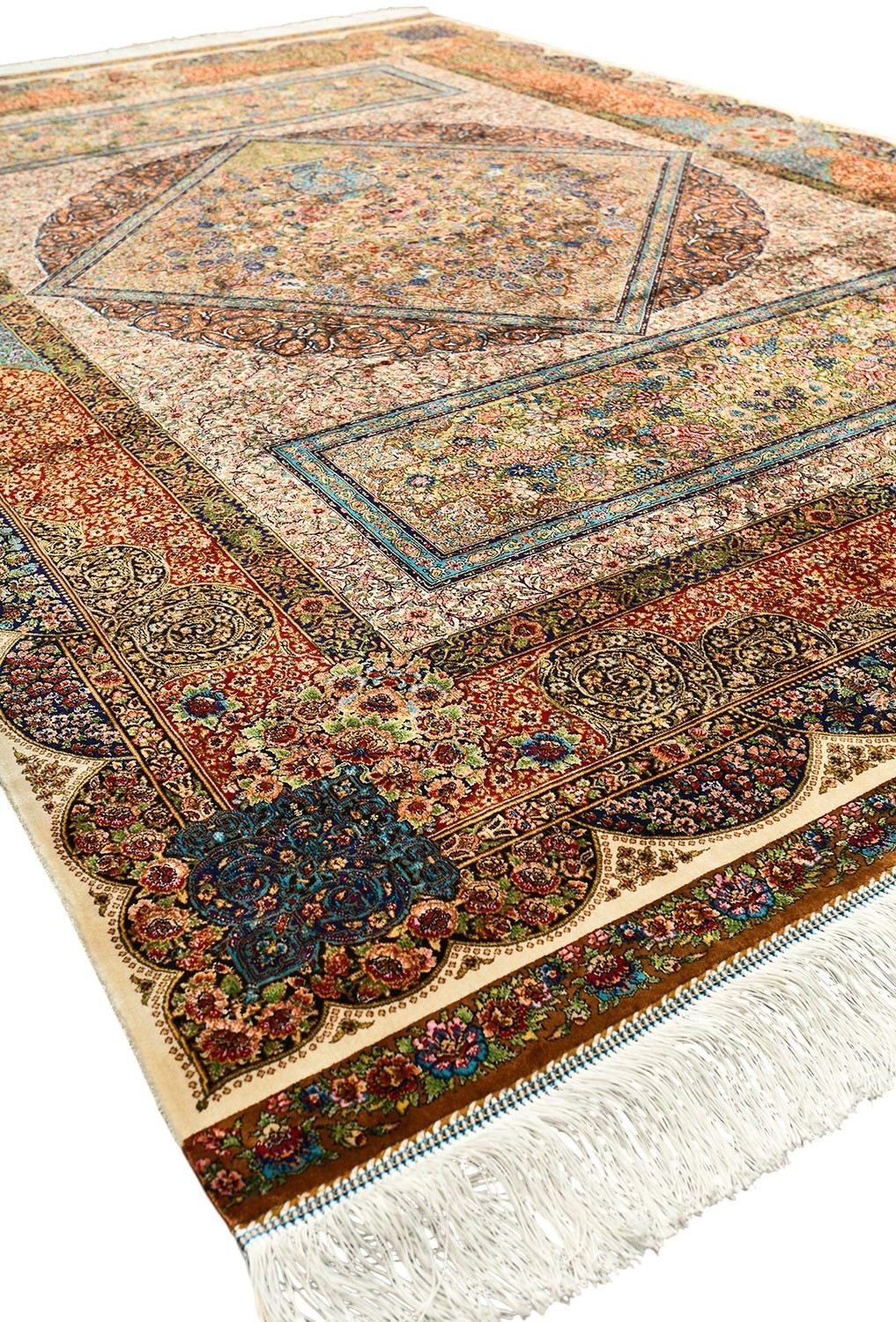 Изысканный иранский ковёр, сотканный из бамбукового и натурального шелка, завораживает своим сложным орнаментом. Ручная обработка бахромы и оверлока придаёт ему элегантности и уникальности.