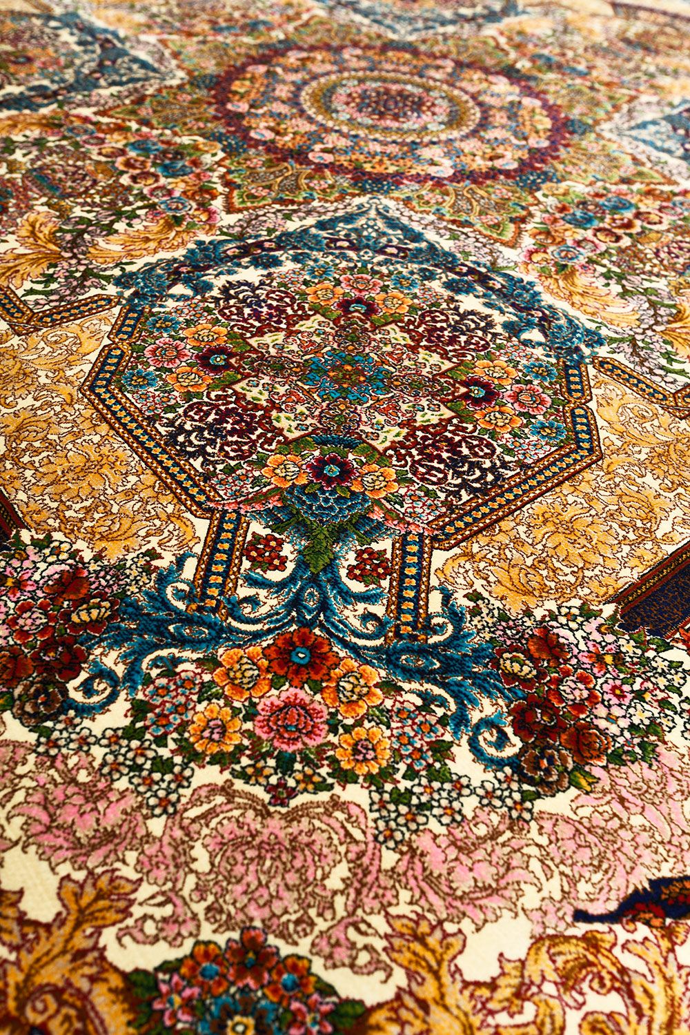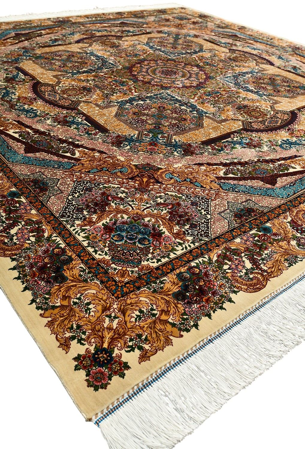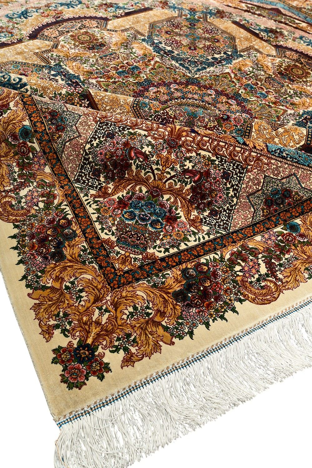 Этот премиальный иранский ковёр из бамбукового и натурального шелка завораживает своим сложным геометрическим узором и насыщенными цветами. Ручная обработка бахромы и оверлока добавляет ему утонченности и роскоши.