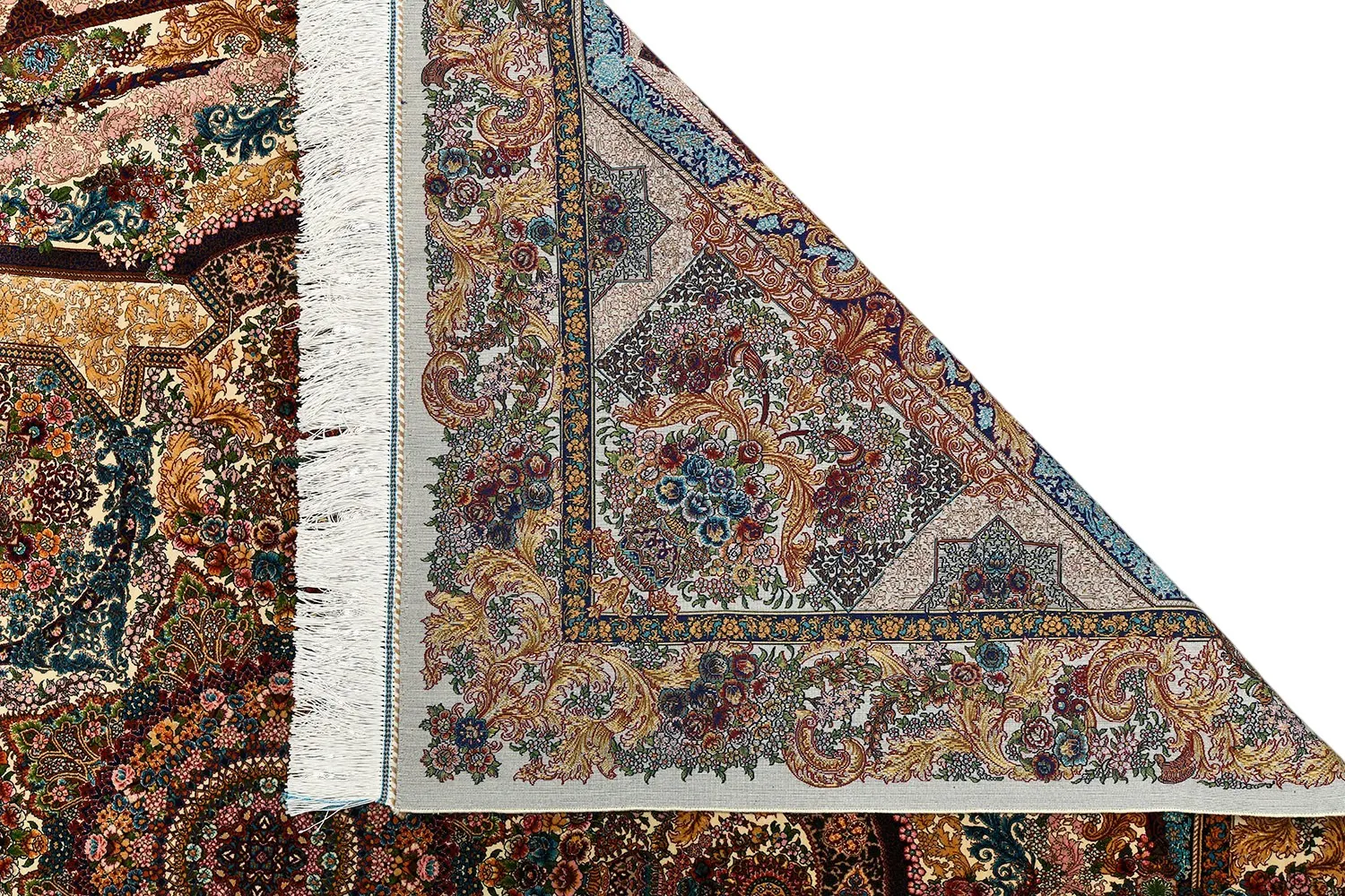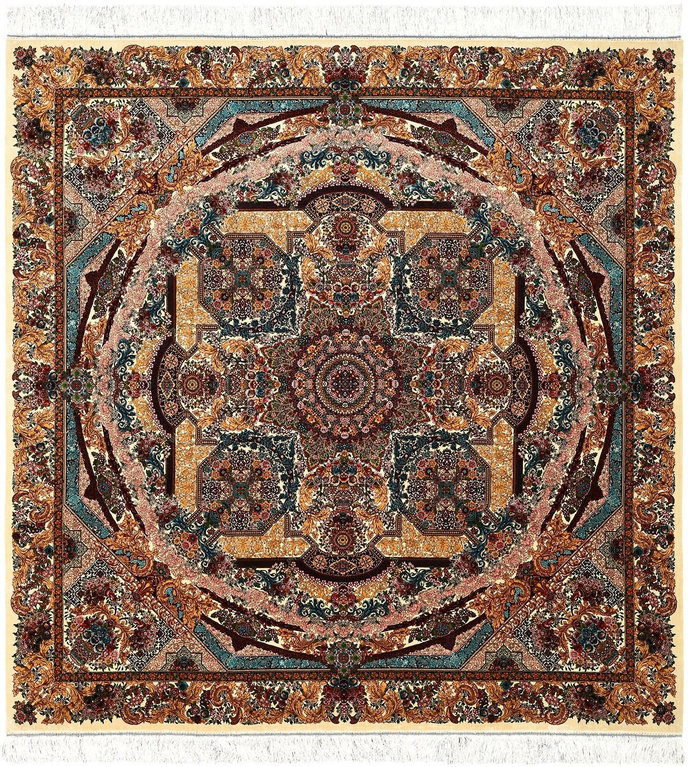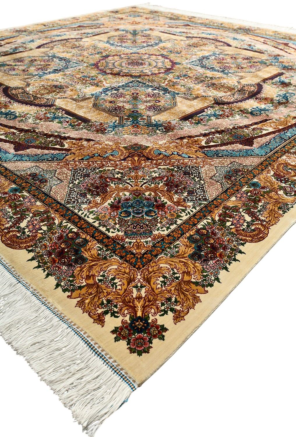 Этот премиальный иранский ковёр из бамбукового и натурального шелка завораживает своим сложным геометрическим узором и насыщенными цветами. Ручная обработка бахромы и оверлока добавляет ему утонченности и роскоши.