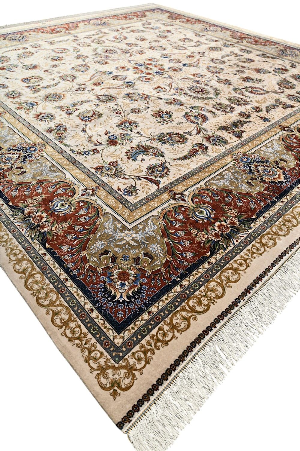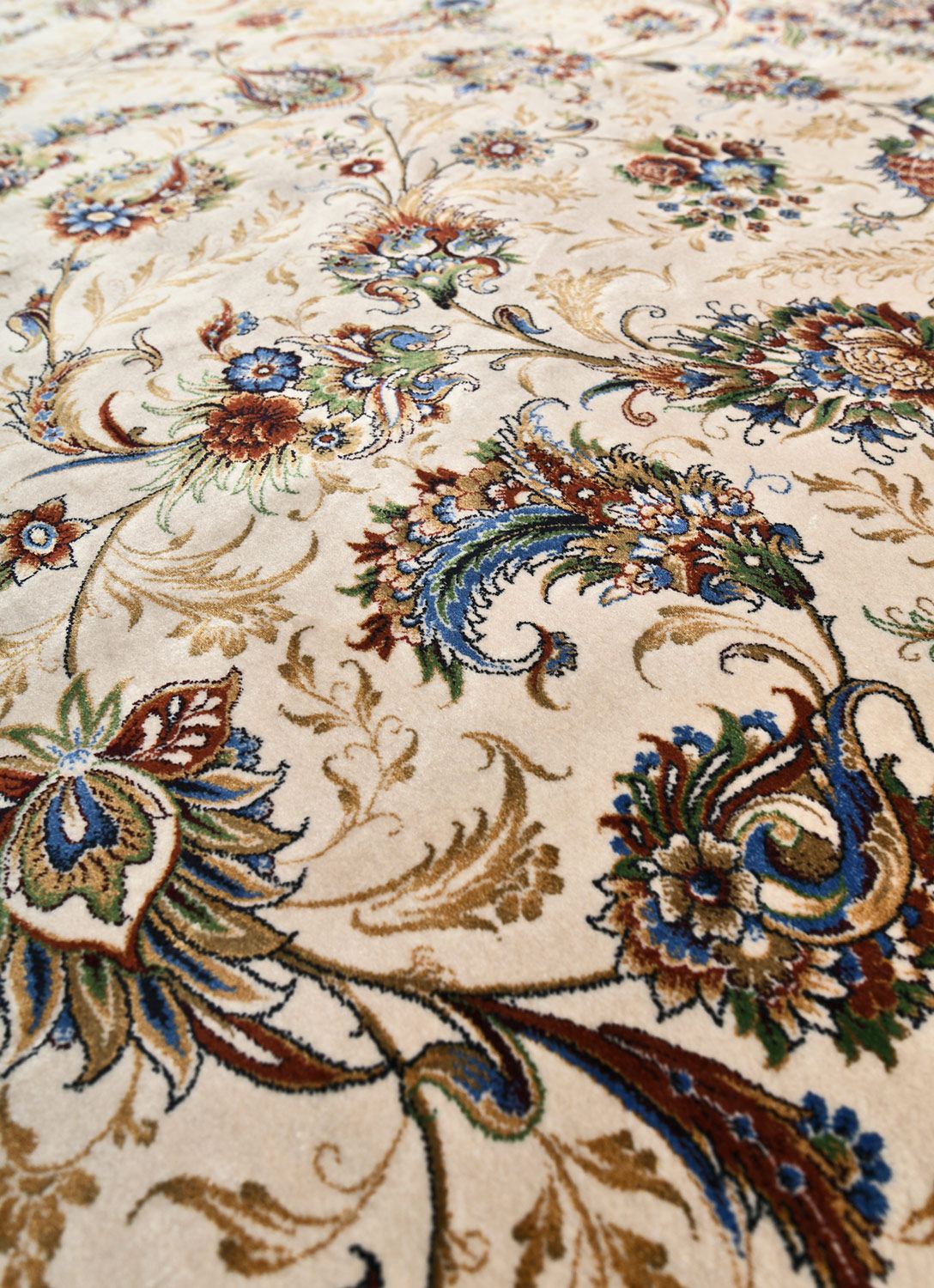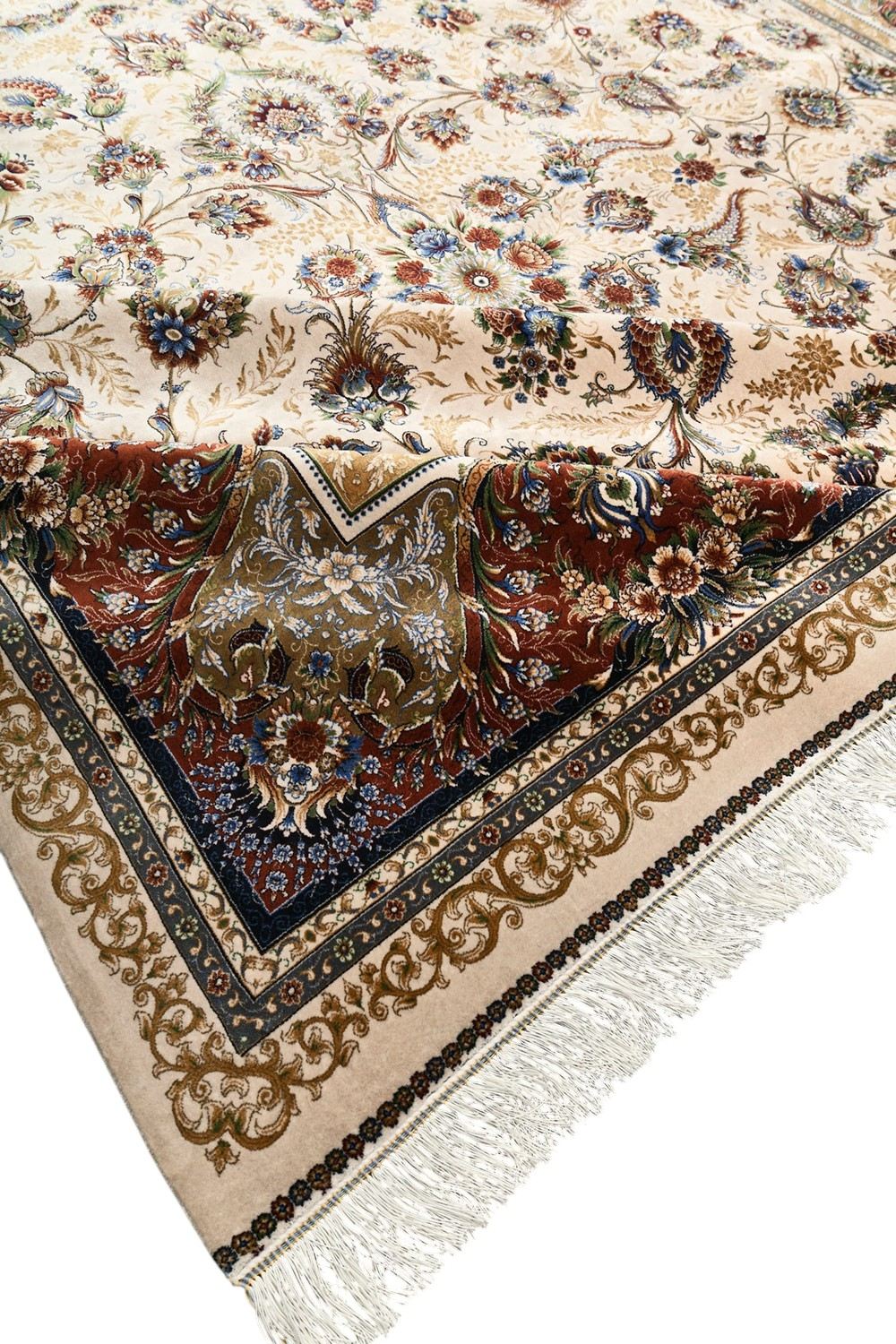 Этот премиальный иранский машинный ковёр изысканно выполнен из бамбукового и натурального шелка. Он украшен богатым, детализированным узором с цветочными мотивами, обрамленными элегантным бордюром. Вручную обработанная бахрома и оверлок добавляют ковру исключительную утончённость и роскошь, подчёркивая его статус как произведения искусства.