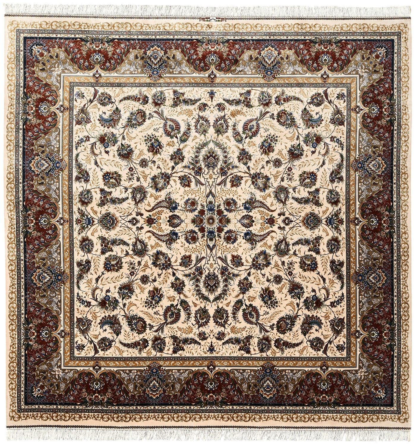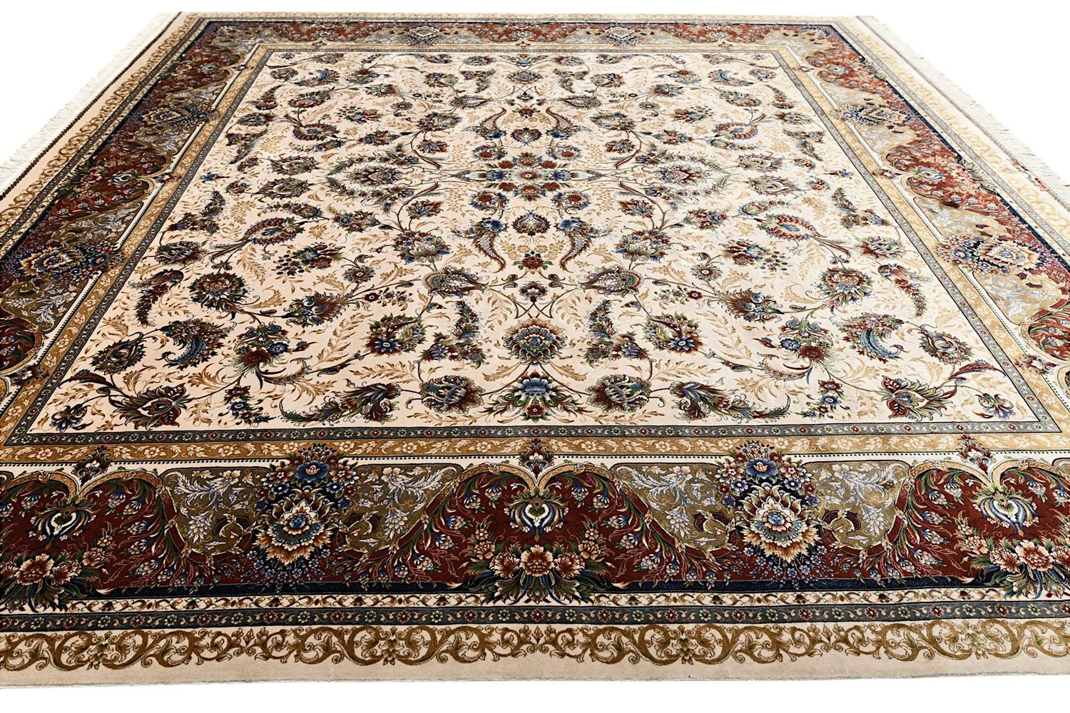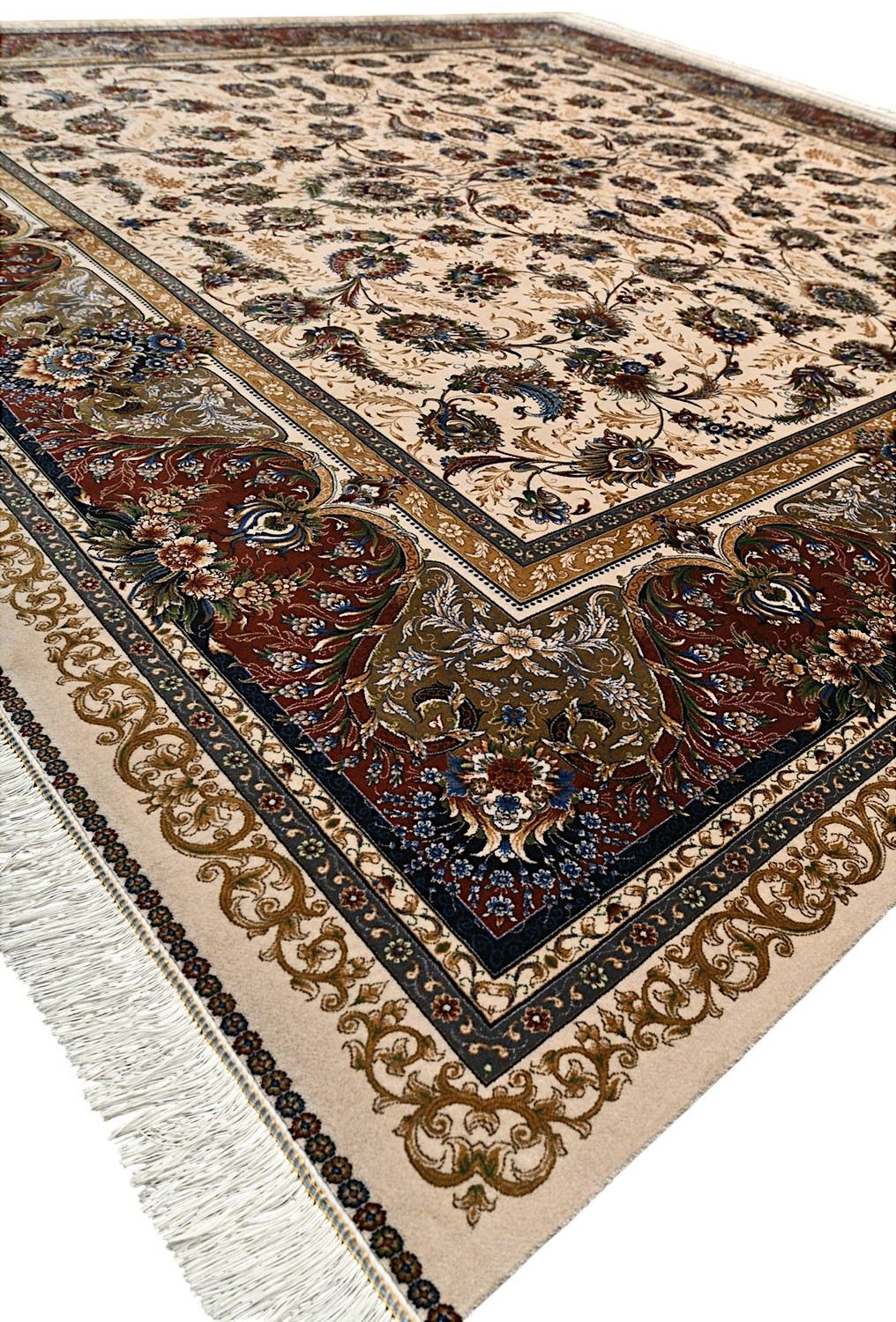 Этот премиальный иранский машинный ковёр изысканно выполнен из бамбукового и натурального шелка. Он украшен богатым, детализированным узором с цветочными мотивами, обрамленными элегантным бордюром. Вручную обработанная бахрома и оверлок добавляют ковру исключительную утончённость и роскошь, подчёркивая его статус как произведения искусства.