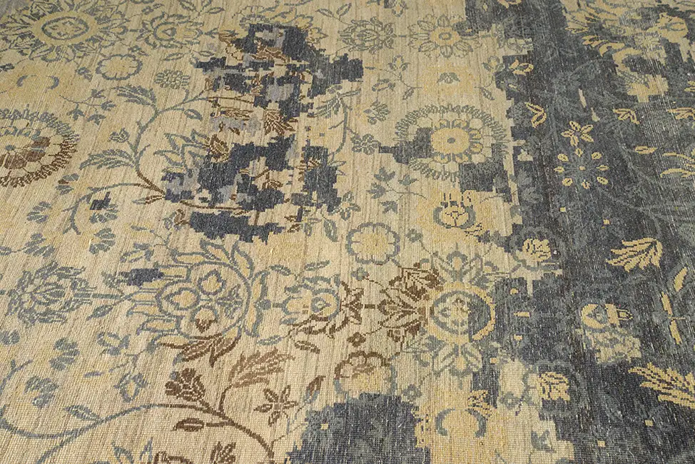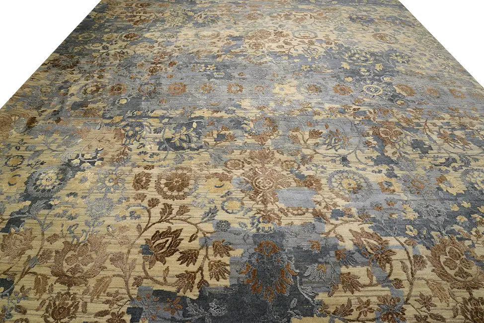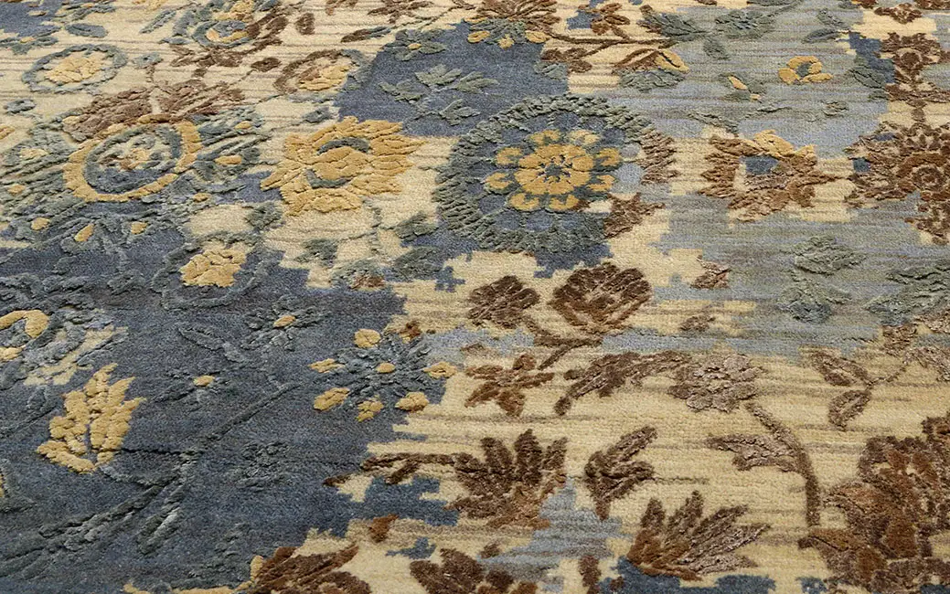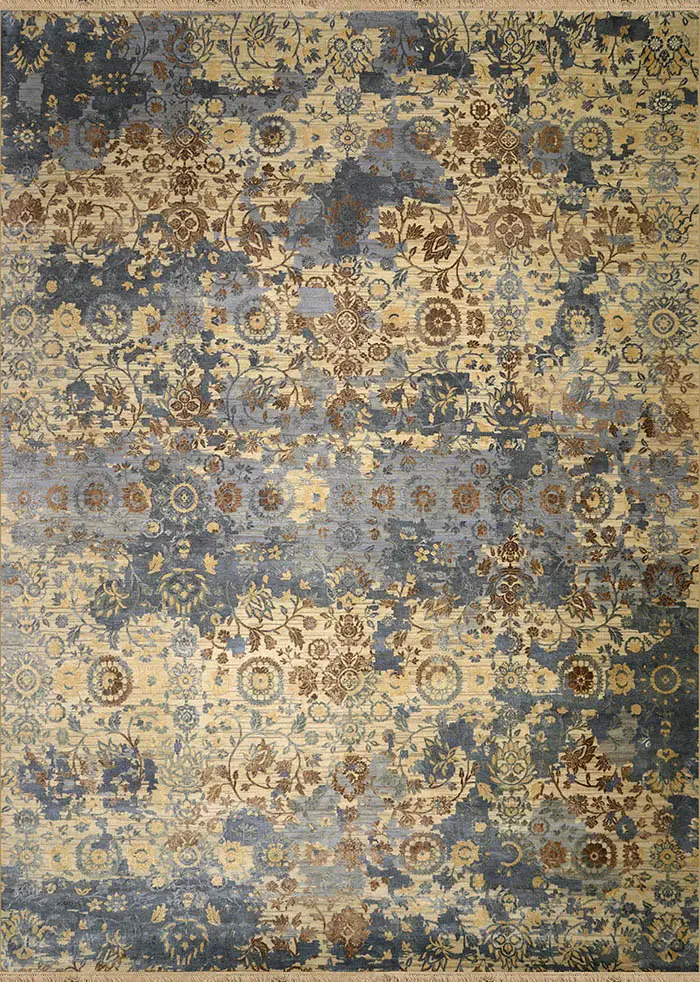 Дизайнерский ковер "Мильфлер" соткан из шерсти и шелка имеет разноуровневую стрижку ворса. В орнаменте использованы актуальные элементы стертого рисунка и неоднородного окраса.
