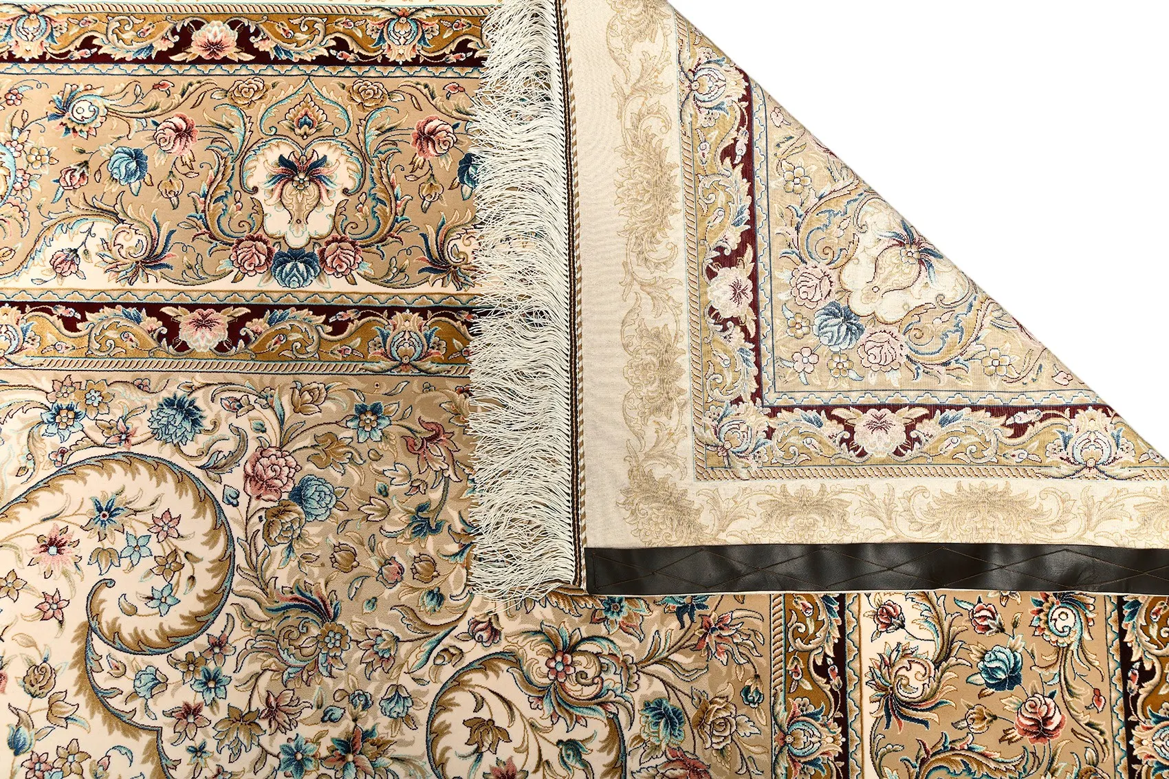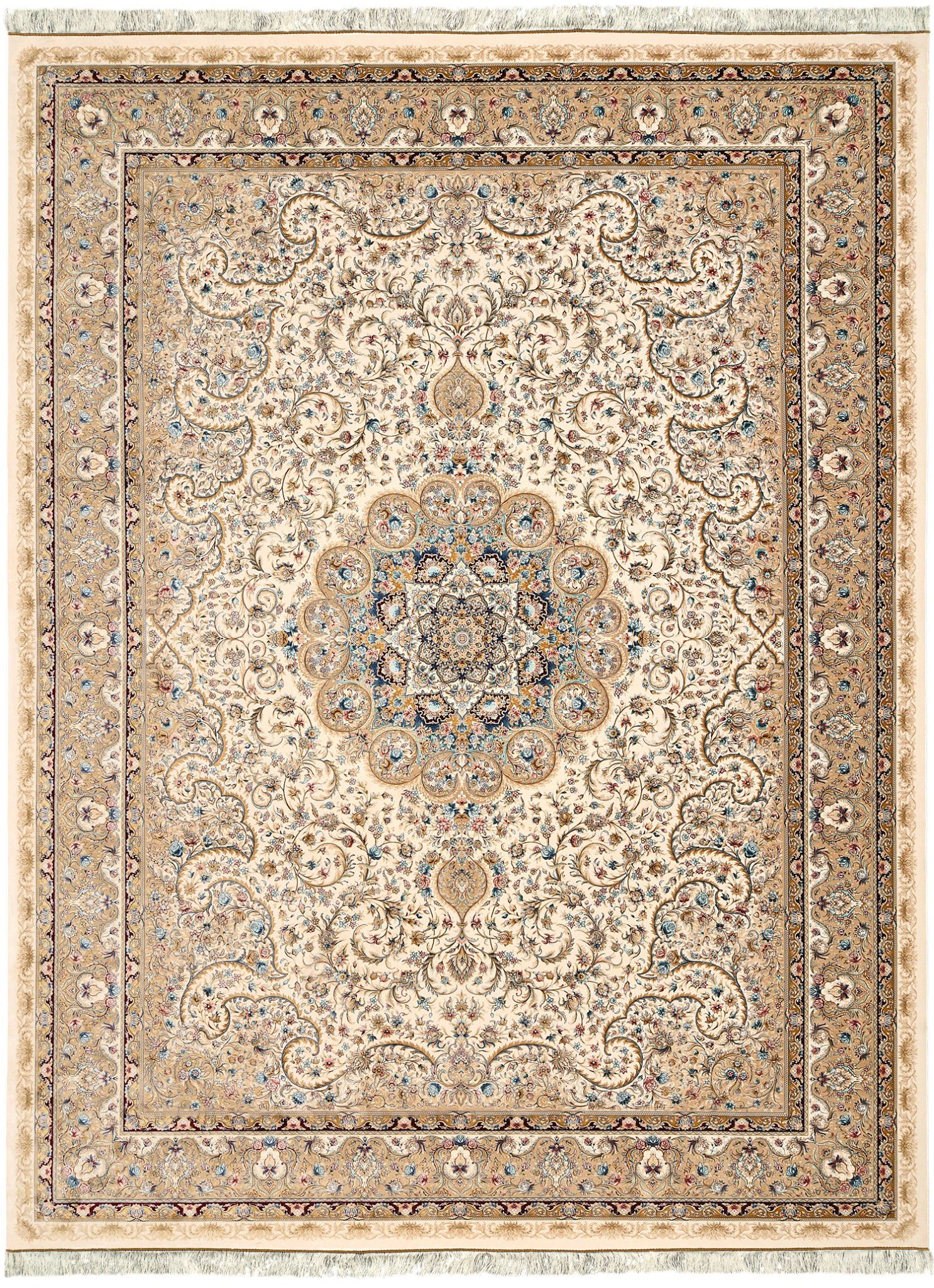 Ковёр изготовлен на машинном станке с ручной отделкой бахромы и ручной окантовкой.