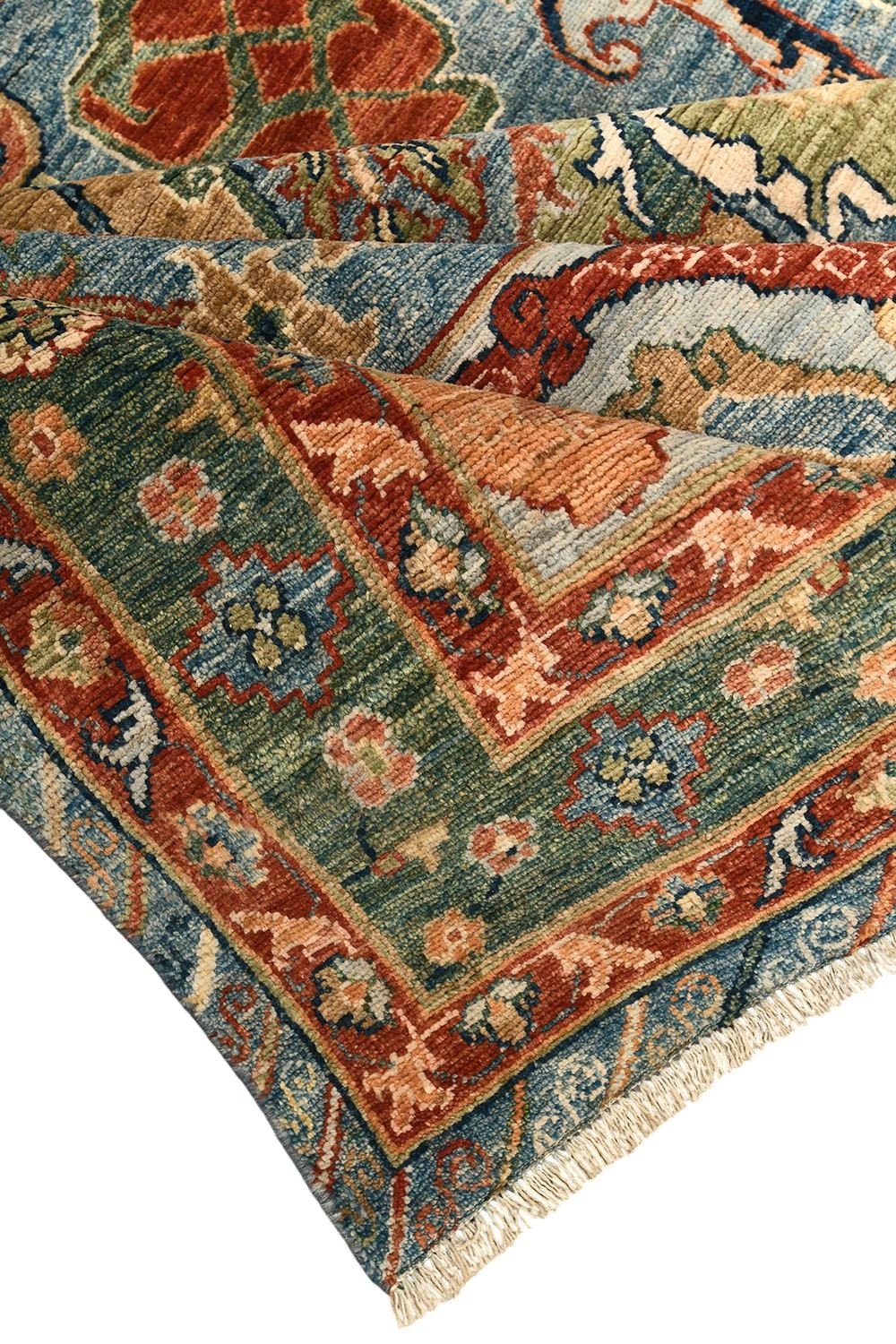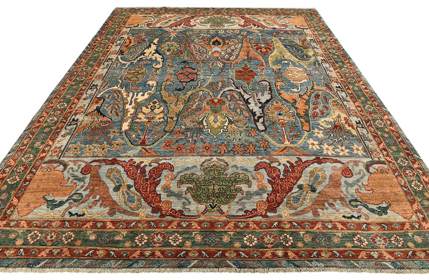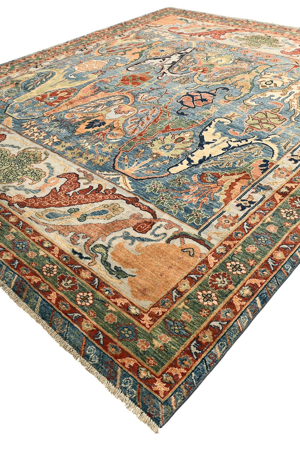 Этот пакистанский ковер Bijar выполнен в насыщенной палитре голубых, зеленых и терракотовых оттенков, украшен изящными растительными мотивами и выразительным бордюром. Ковер соткан вручную из шерстяной нити веретенной крутки по старинной технологии, что обеспечивает прочность и изысканную фактуру. Натуральные красители придают ему глубину и благородство, делая этот ковер настоящим акцентом интерьера.