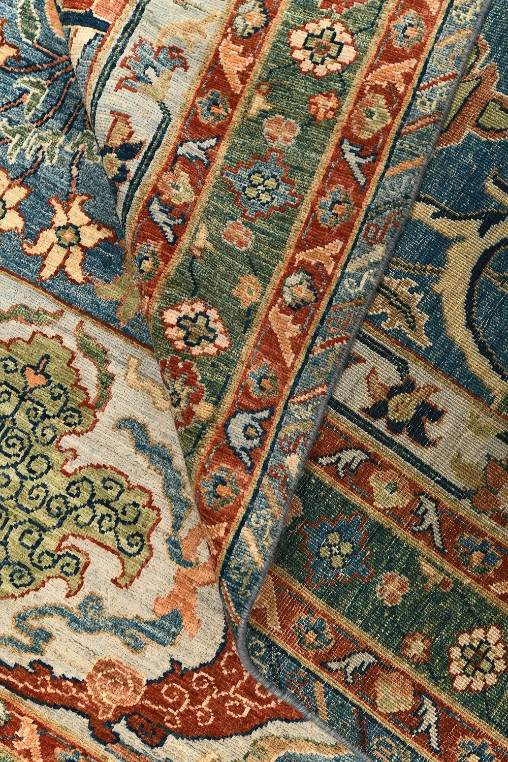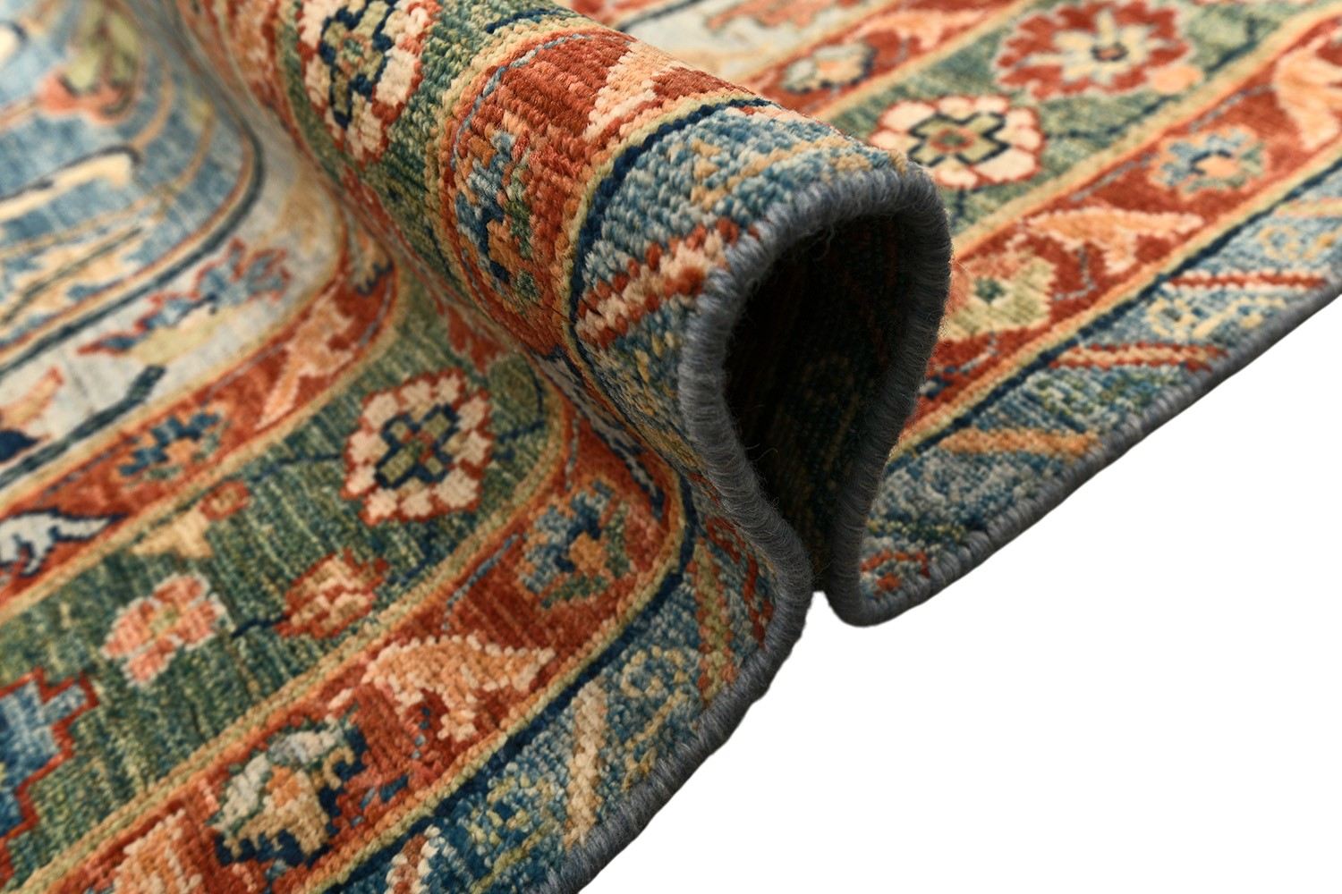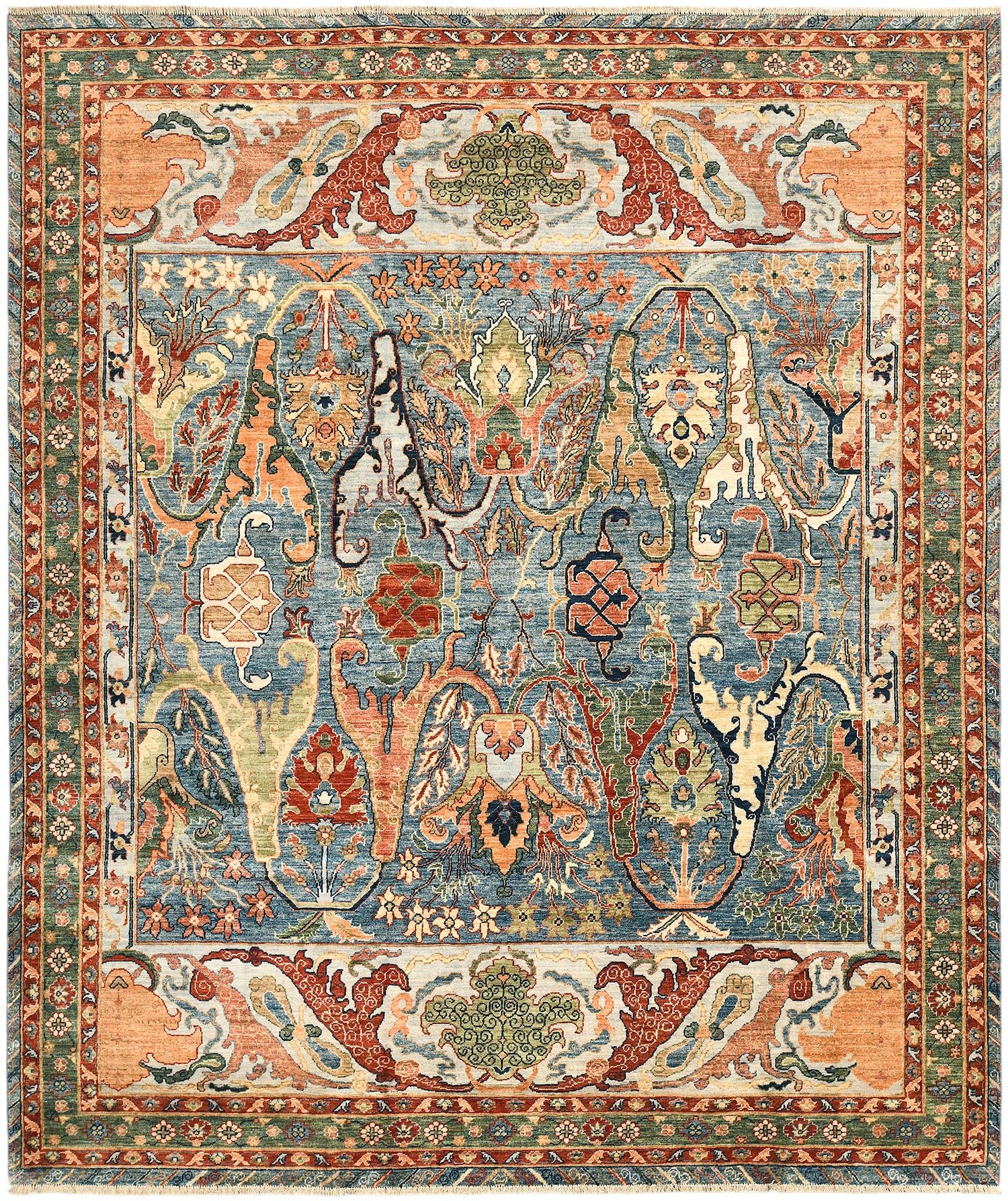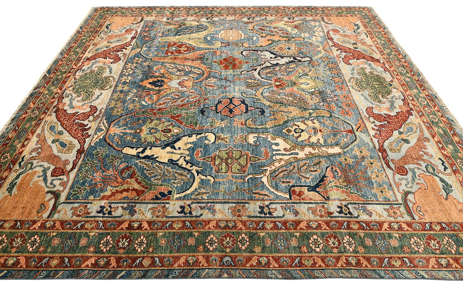 Этот пакистанский ковер Bijar выполнен в насыщенной палитре голубых, зеленых и терракотовых оттенков, украшен изящными растительными мотивами и выразительным бордюром. Ковер соткан вручную из шерстяной нити веретенной крутки по старинной технологии, что обеспечивает прочность и изысканную фактуру. Натуральные красители придают ему глубину и благородство, делая этот ковер настоящим акцентом интерьера.