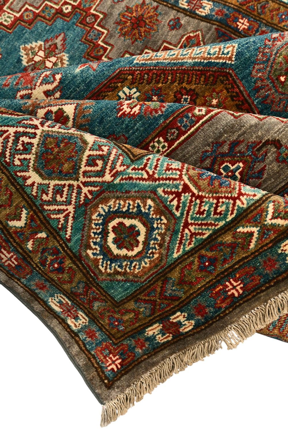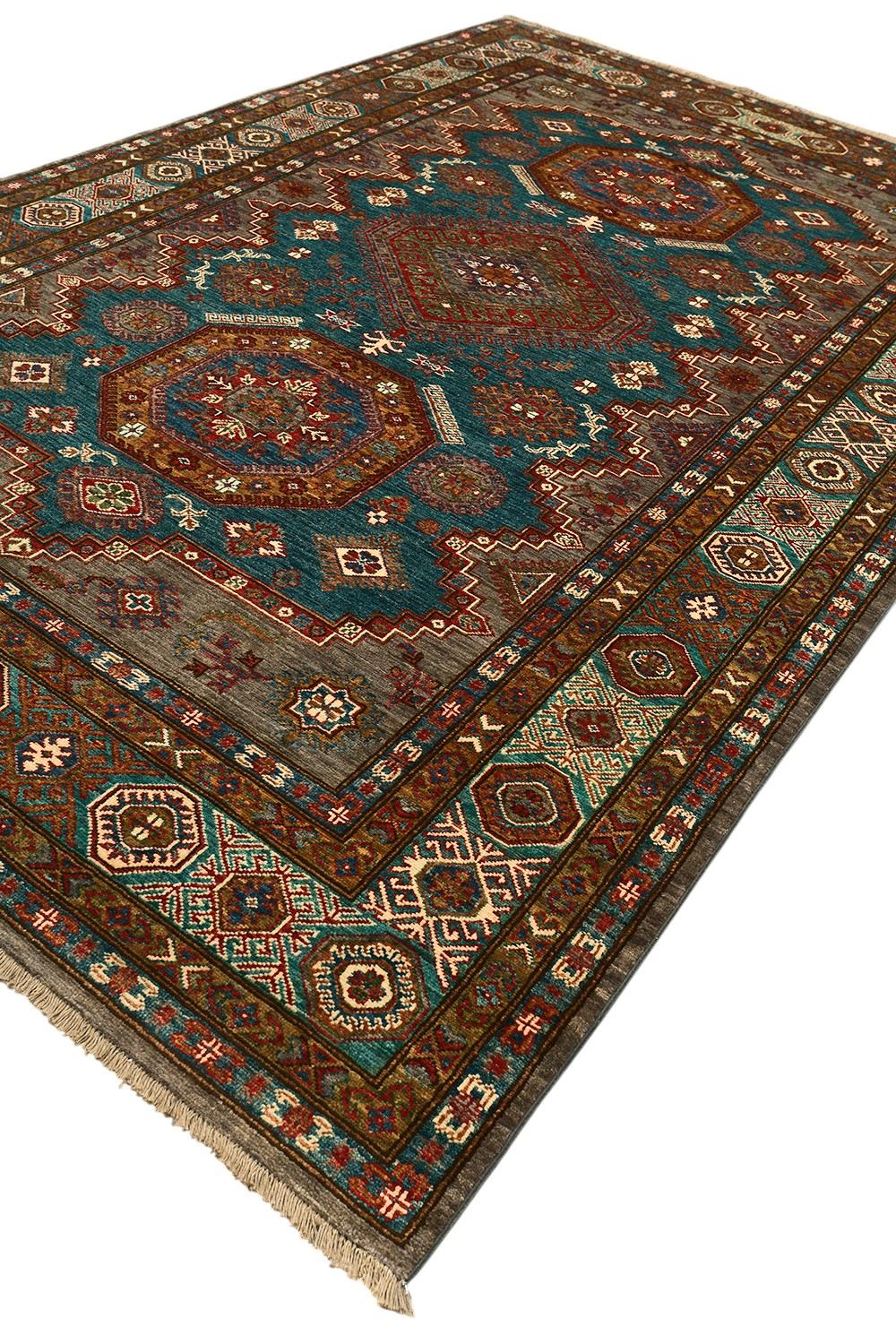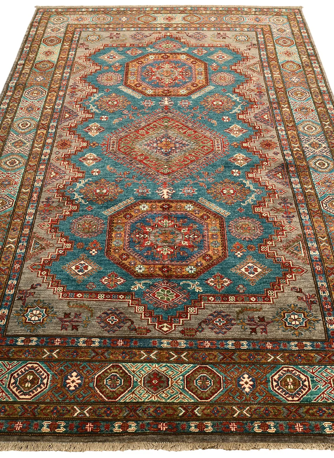 Пакистанский шерстяной ковер Kazakh выполнен вручную и украшен традиционным геометрическим узором в насыщенных бирюзовых, красных и бежевых оттенках. Его яркий и симметричный орнамент подчеркивает восточный колорит и добавляет интерьеру особую энергетику. Такой ковер станет эффектным акцентом в гостиной, столовой или кабинете, сочетая эстетику и долговечность.