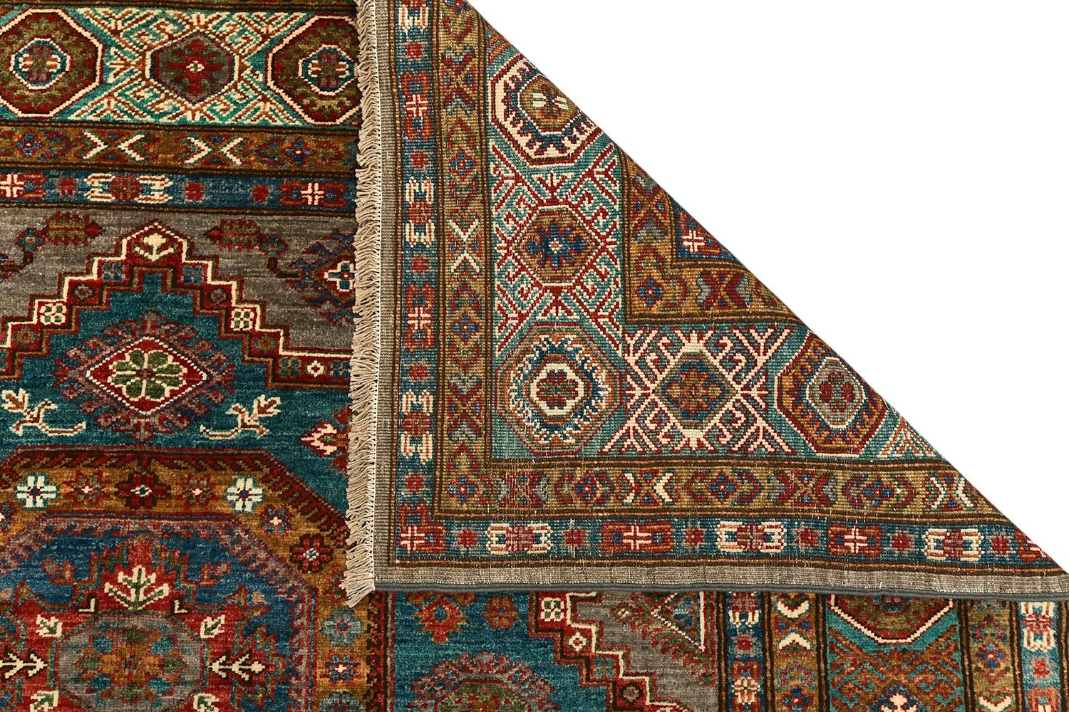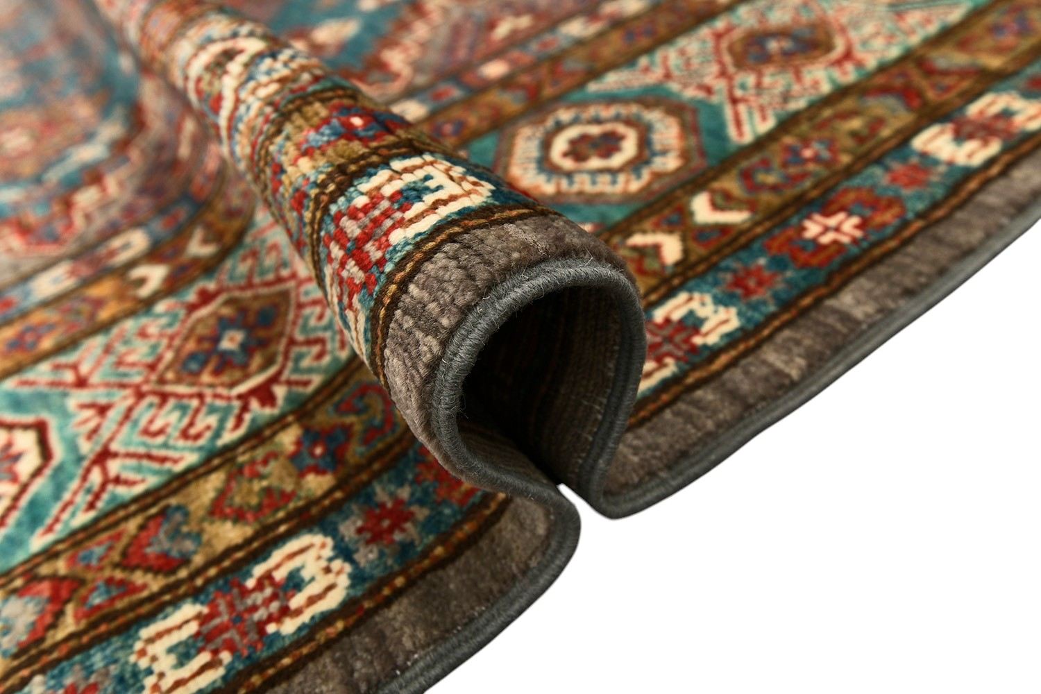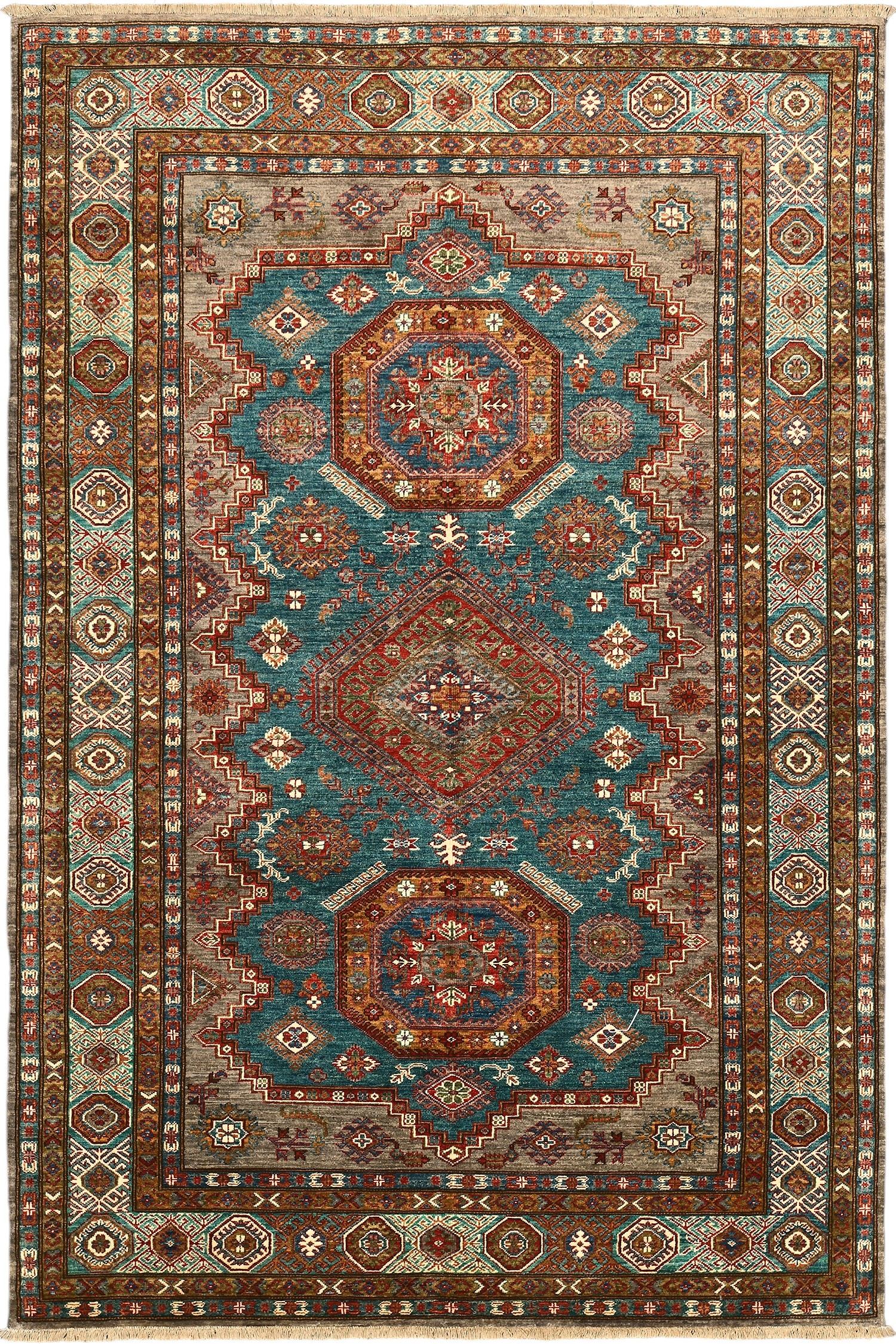 Пакистанский шерстяной ковер Kazakh выполнен вручную и украшен традиционным геометрическим узором в насыщенных бирюзовых, красных и бежевых оттенках. Его яркий и симметричный орнамент подчеркивает восточный колорит и добавляет интерьеру особую энергетику. Такой ковер станет эффектным акцентом в гостиной, столовой или кабинете, сочетая эстетику и долговечность.