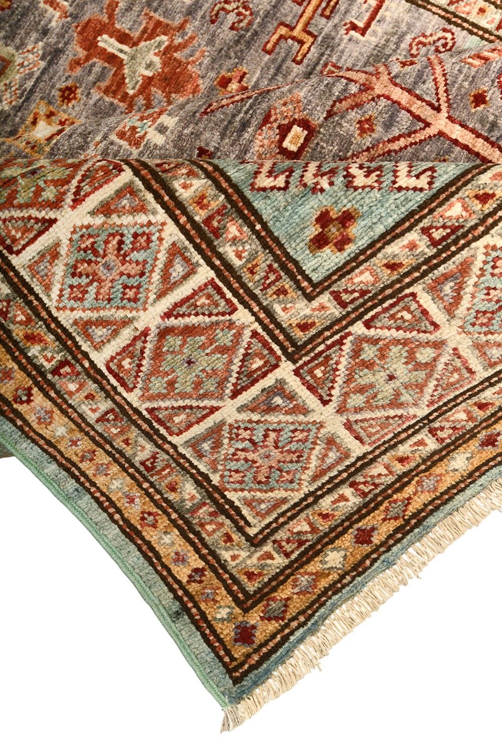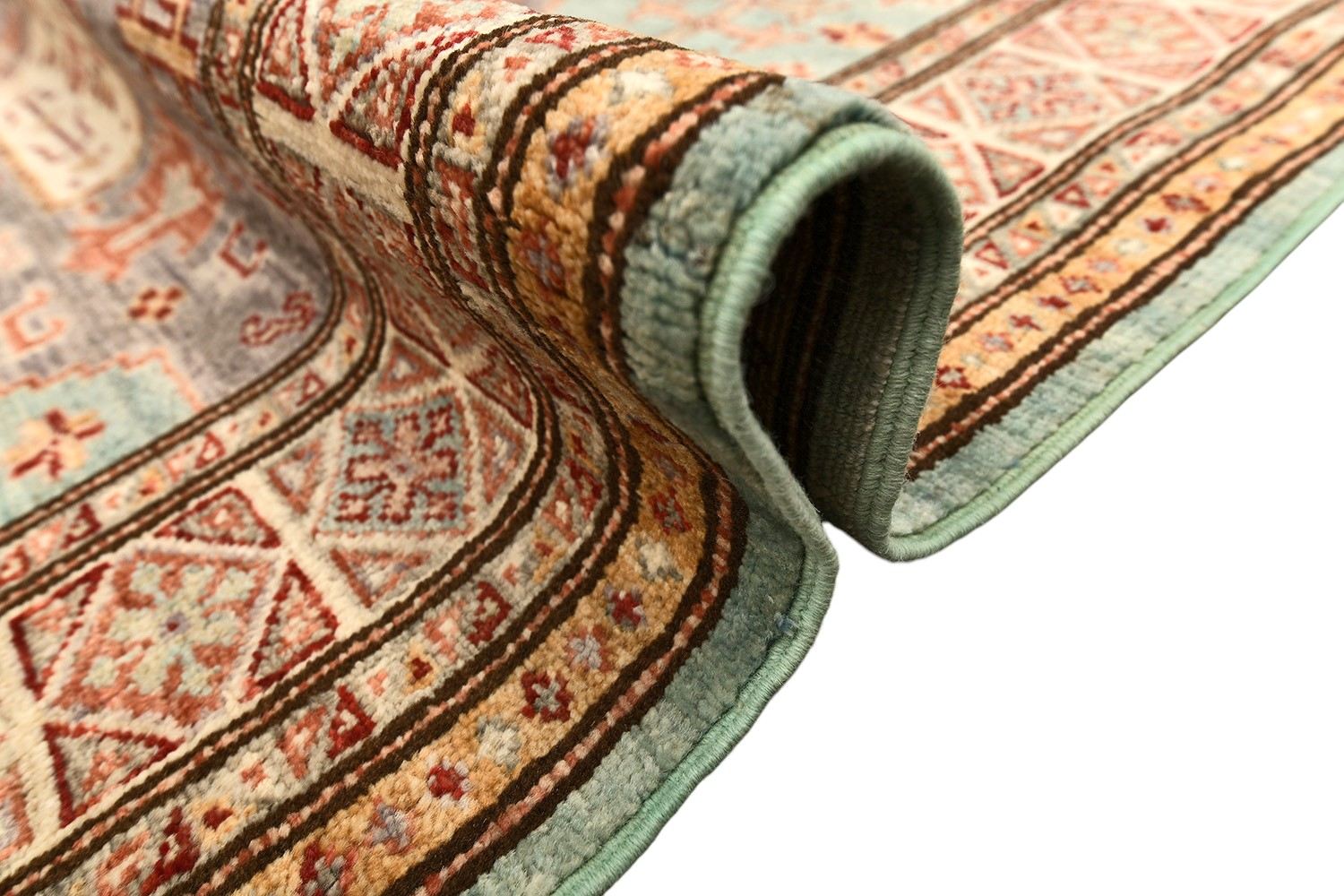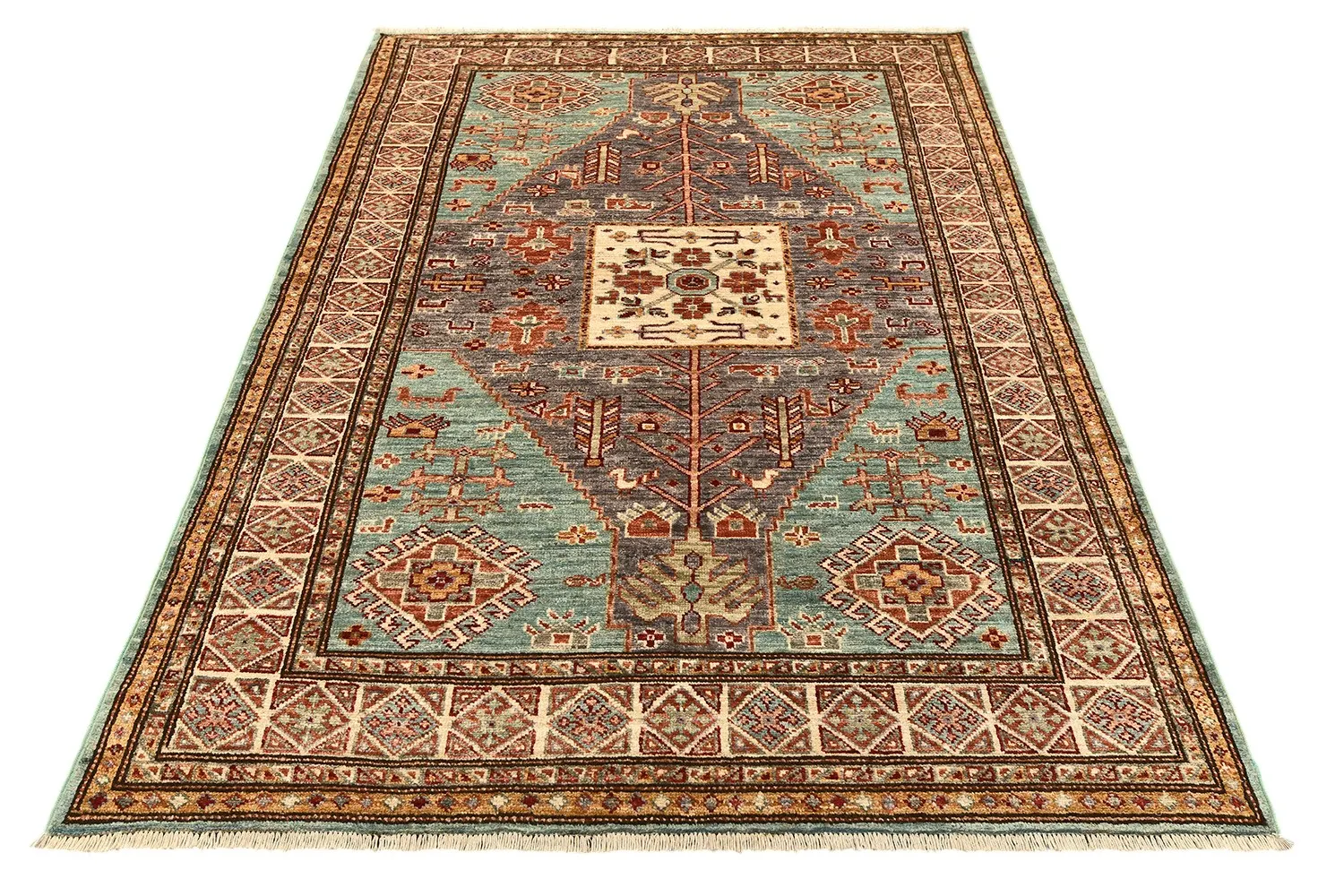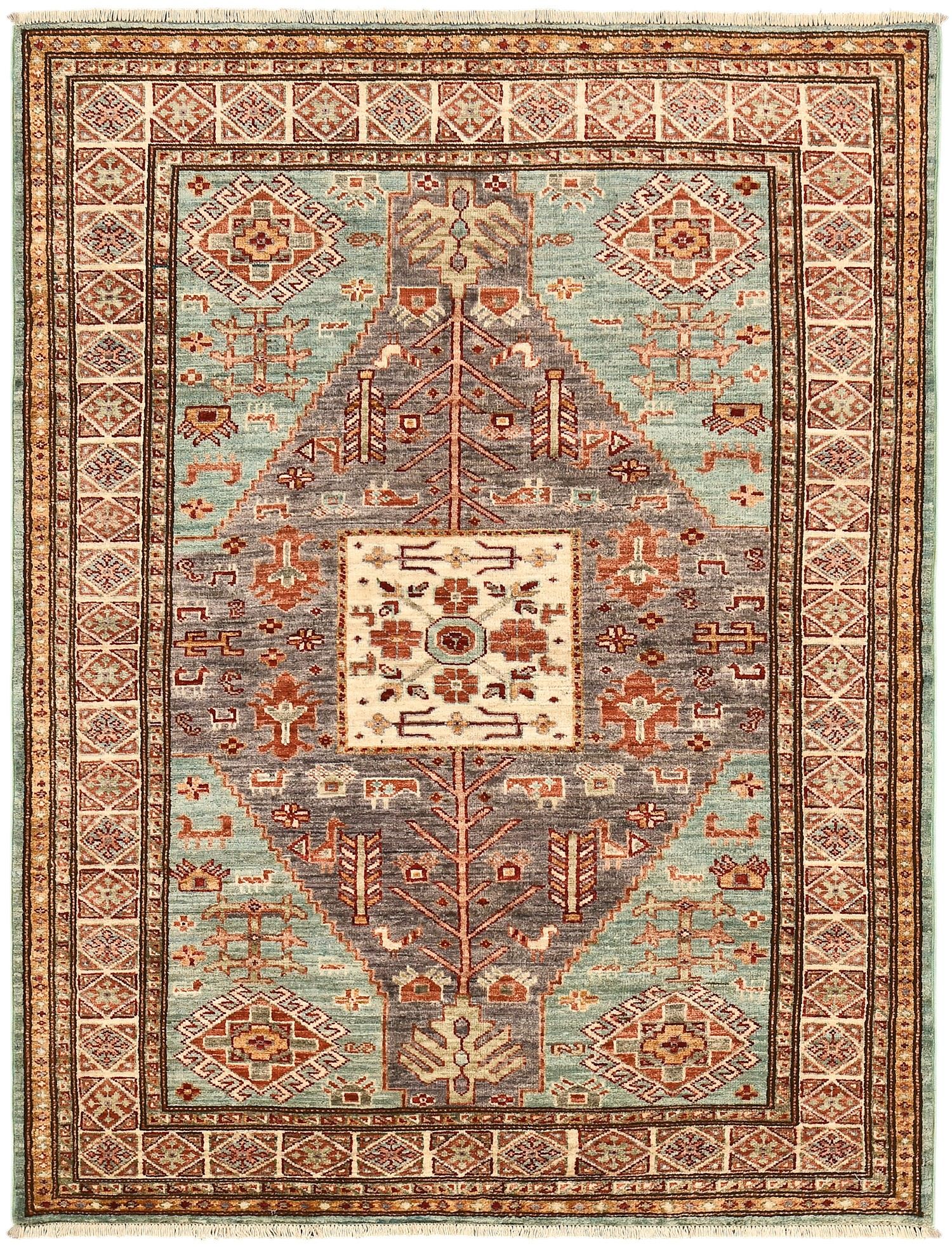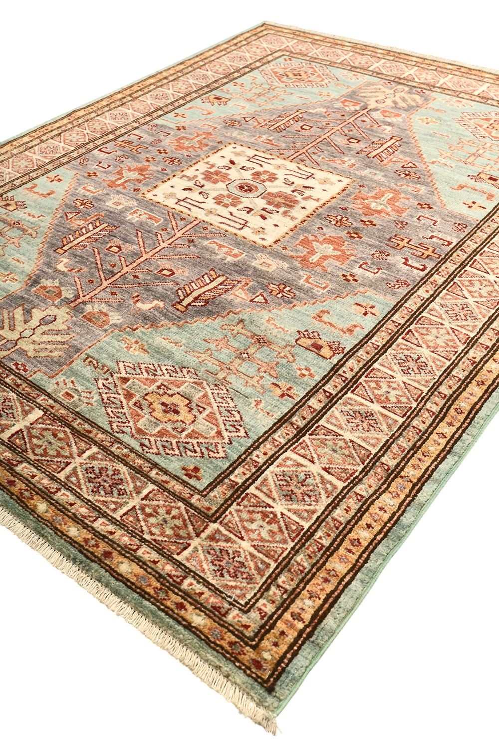 Ковер Kazakh из Пакистана выполнен вручную из натуральной шерсти премиального качества. Его традиционный геометрический узор в сочетании с мягкой цветовой палитрой мятного, серого и бежевого оттенков придает интерьеру изысканность и тепло, подчеркивая аутентичную восточную эстетику.