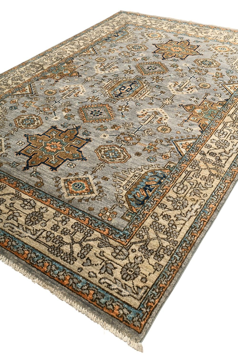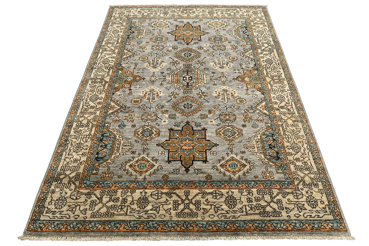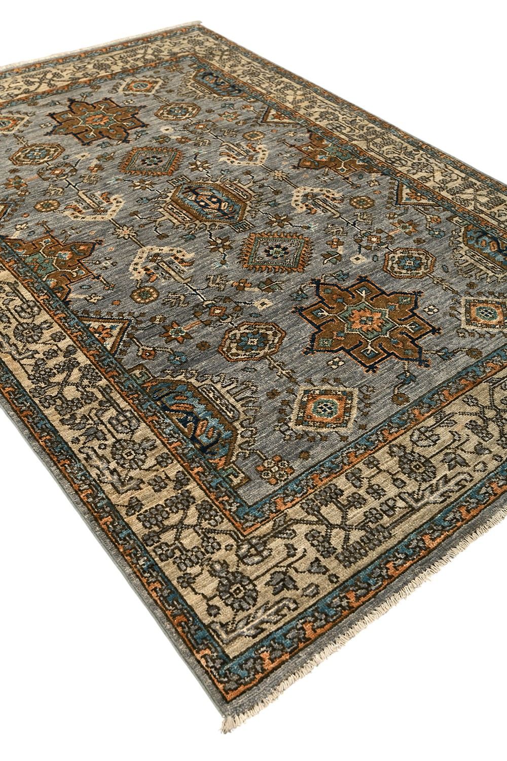 Ковер Kazakh из Пакистана соткан вручную из натуральной шерсти высокого качества. Его геометрический орнамент и утонченная цветовая гамма серого, голубого и терракотового оттенков создают изысканный акцент в любом интерьере, подчеркивая восточную эстетику и уют.
