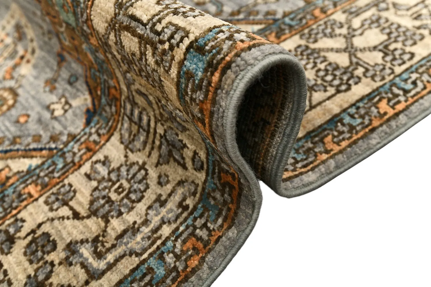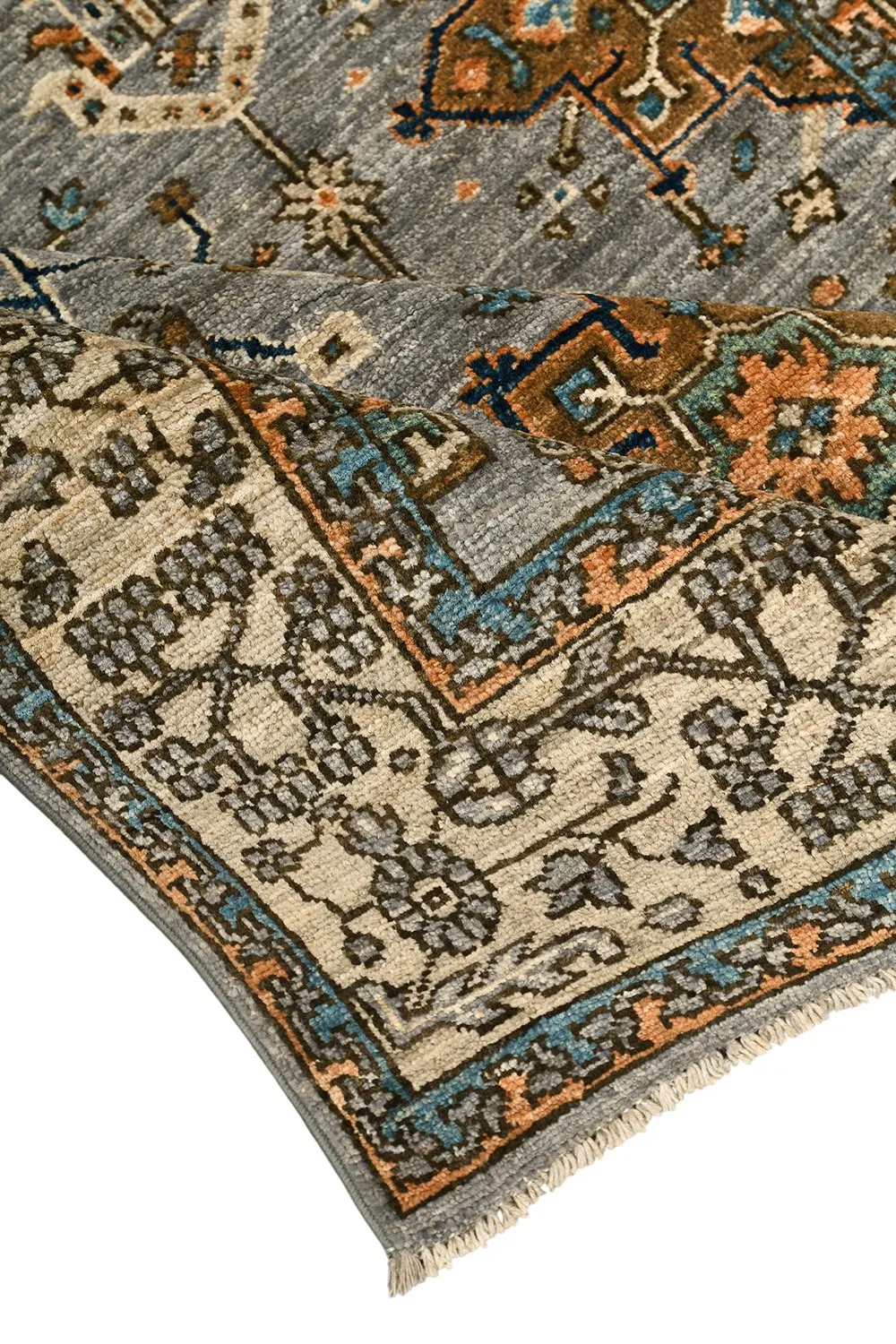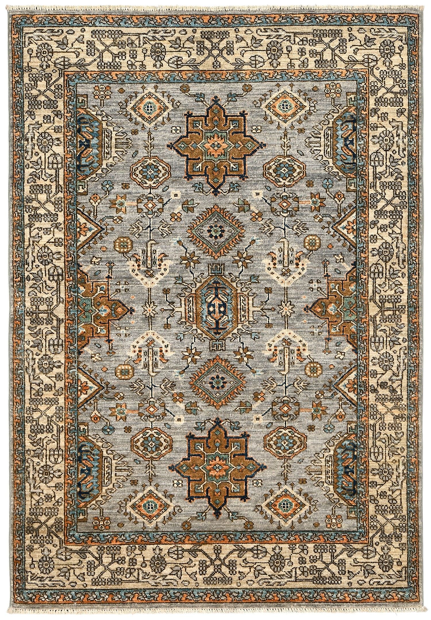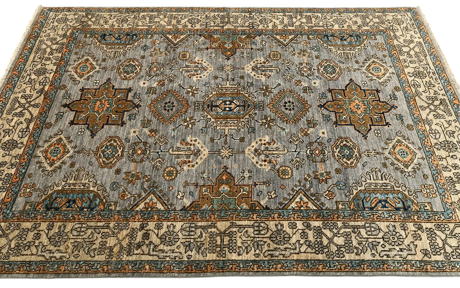 Ковер Kazakh из Пакистана соткан вручную из натуральной шерсти высокого качества. Его геометрический орнамент и утонченная цветовая гамма серого, голубого и терракотового оттенков создают изысканный акцент в любом интерьере, подчеркивая восточную эстетику и уют.