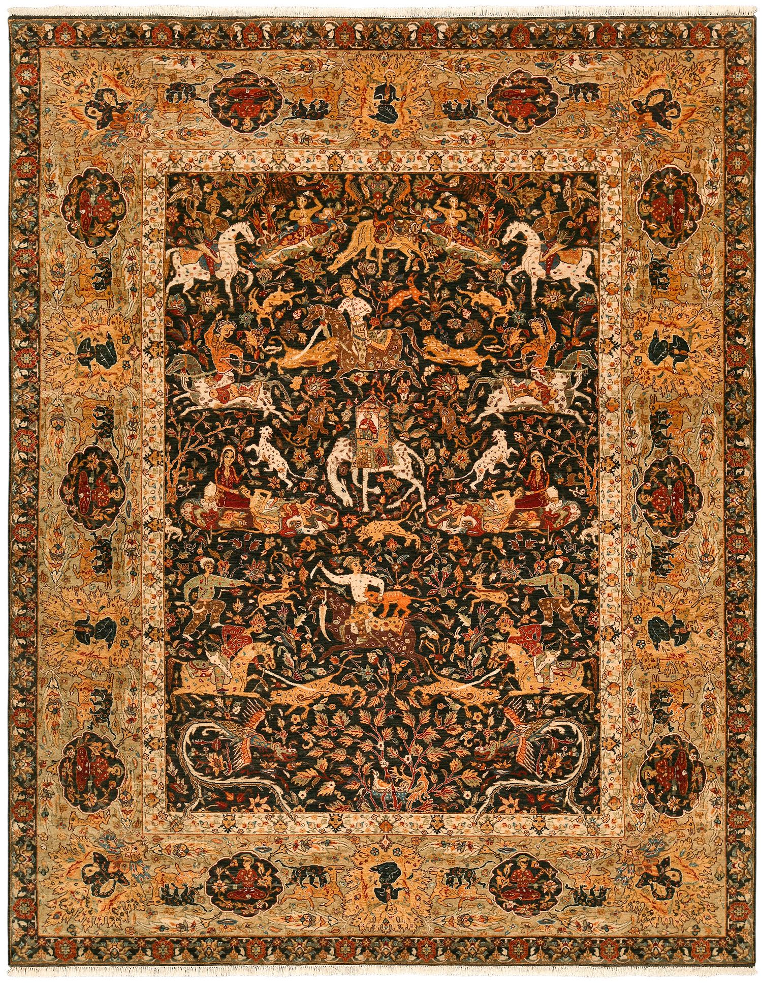 Эксклюзивный ковер Royal Hunting из 100% натуральной шерсти высокой узелковой плотности представляет собой истинное произведение искусства. Центральное поле украшено изысканными охотничьими сценами с всадниками, животными и мифологическими существами, выполненными в традициях персидского ковроткачества. Богатая цветовая палитра с преобладанием благородных оттенков золота, терракоты и темно-синего создает атмосферу царственной роскоши. Высокая плотность узелков обеспечивает невероятную детализацию рисунка и исключительную долговечность изделия. Этот ковер станет центральным элементом интерьера и подчеркнет утонченный вкус владельца.RetryClaude can make mistakes. Please double-check responses.