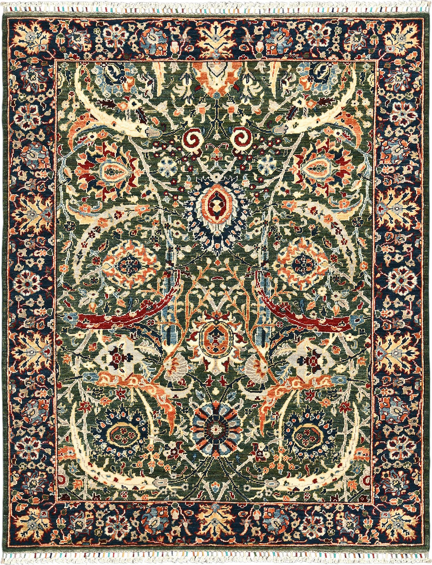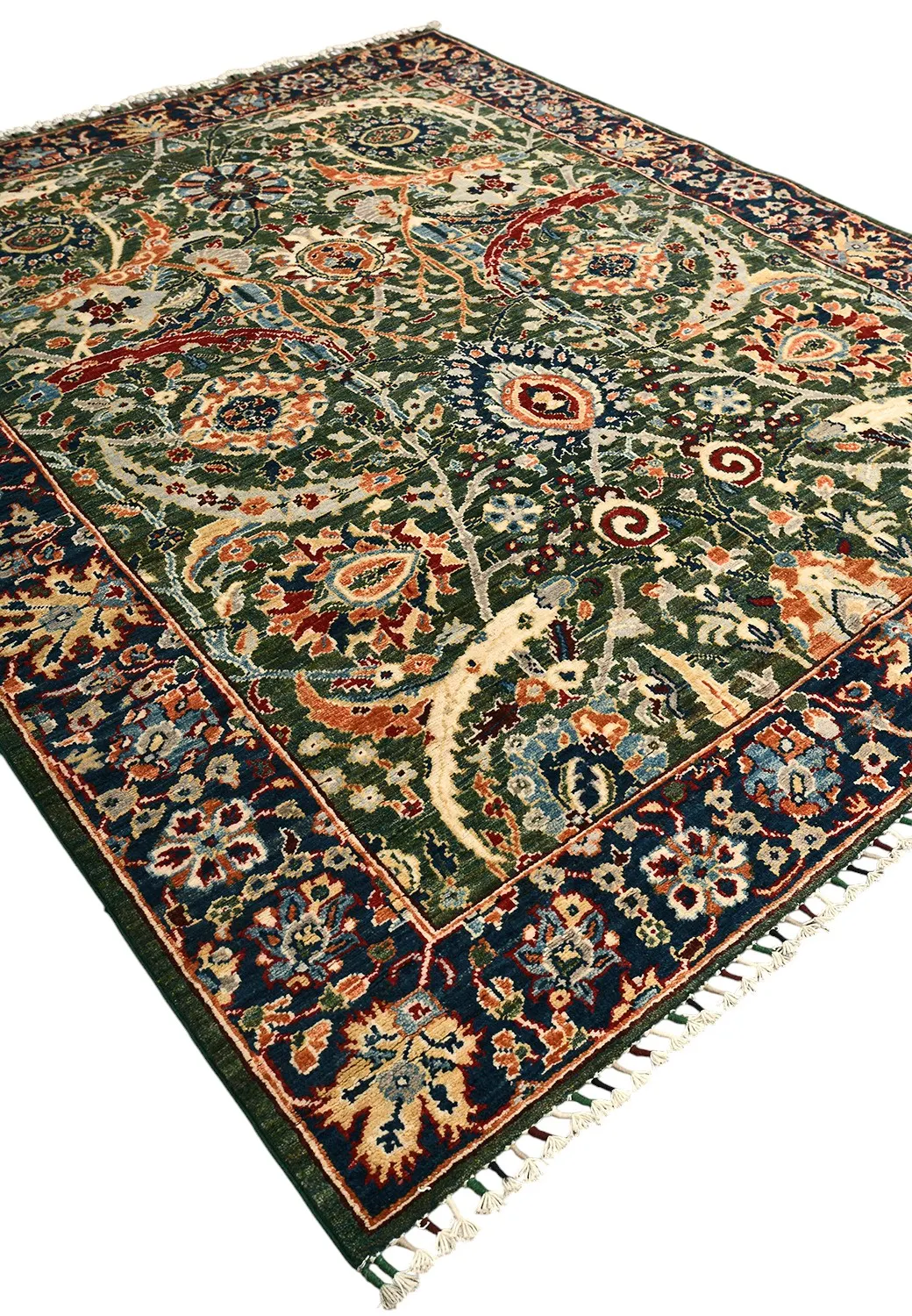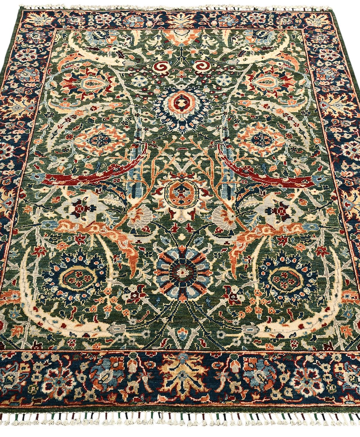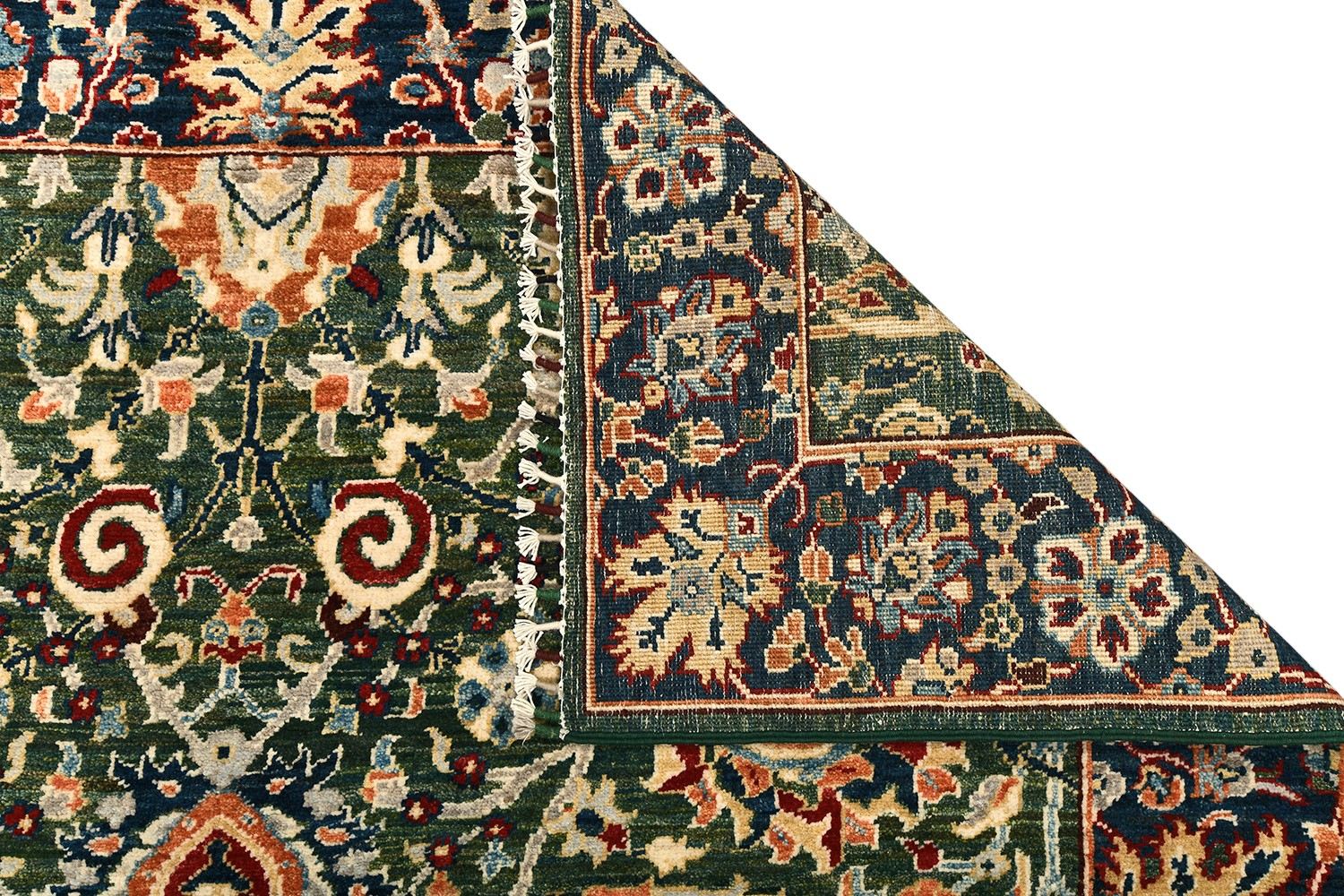Пакистанский шерстяной ковер Safavid выполнен вручную и украшен сложным восточным орнаментом в зеленой палитре с акцентами красного, синего и кремового. Его изысканный рисунок напоминает традиционные персидские ковры и придаёт интерьеру атмосферу богатства и гармонии. Такой ковер станет выразительным центром комнаты, подчеркивающим утончённый вкус хозяев.
