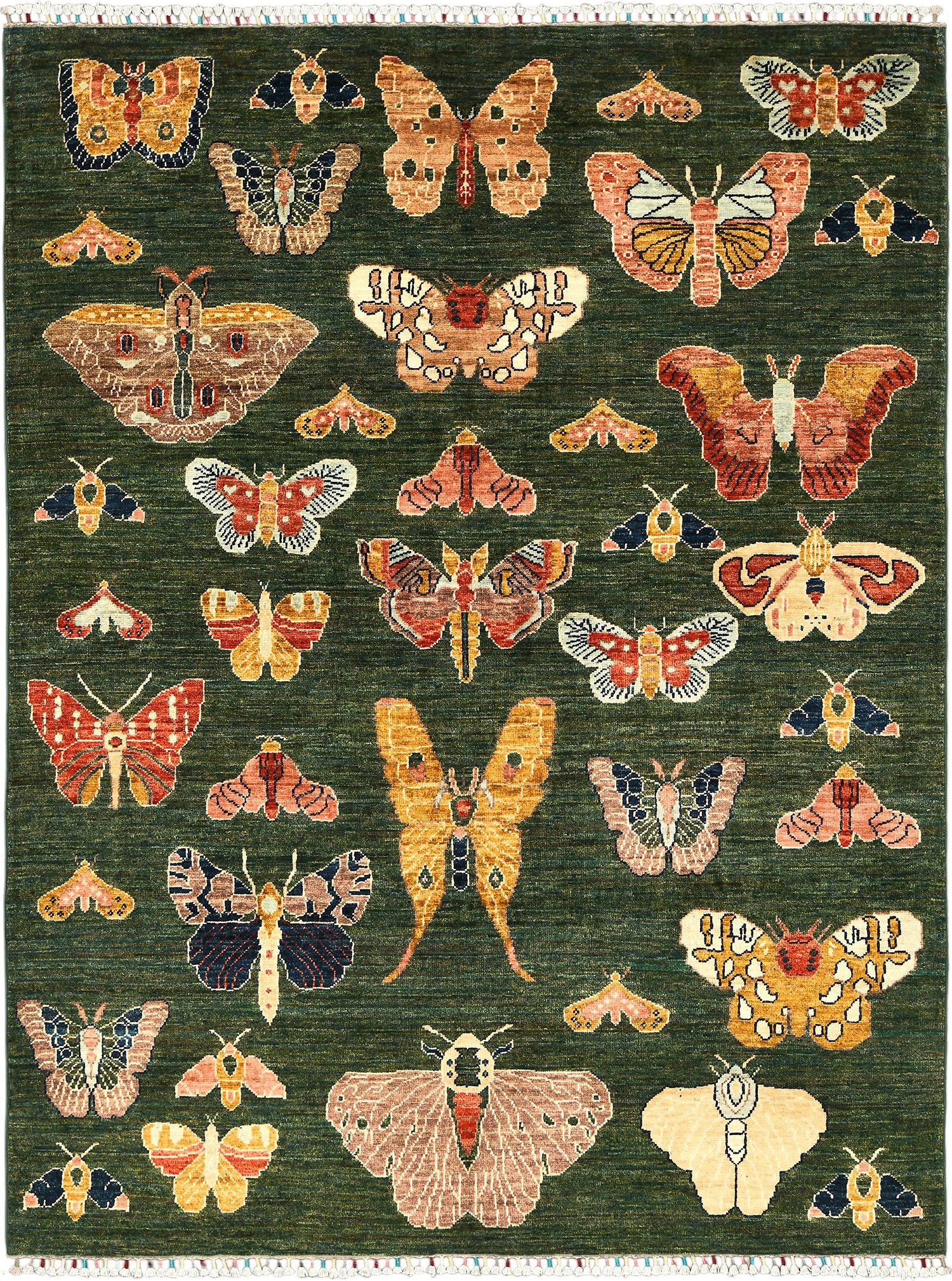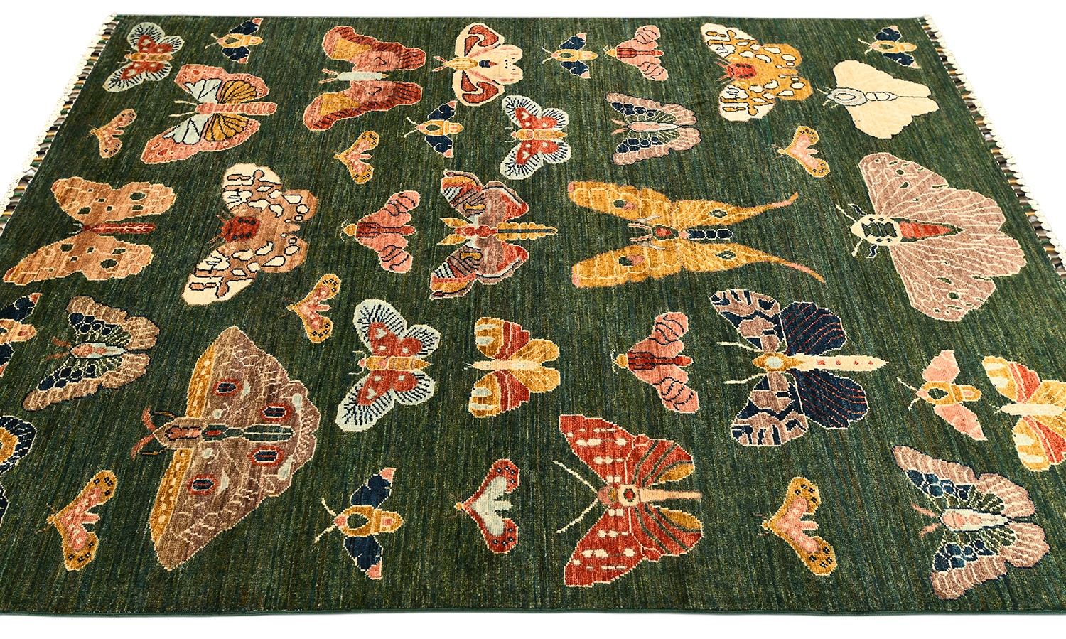 Пакистанский шерстяной ковер Ziegler выполнен вручную из натуральной шерсти и украшен оригинальным рисунком бабочек на насыщенном зеленом фоне. Яркие детали и необычный орнамент придают интерьеру индивидуальность, свежесть и художественный шарм. Такой ковер станет эффектным акцентом в современном или эклектичном пространстве.