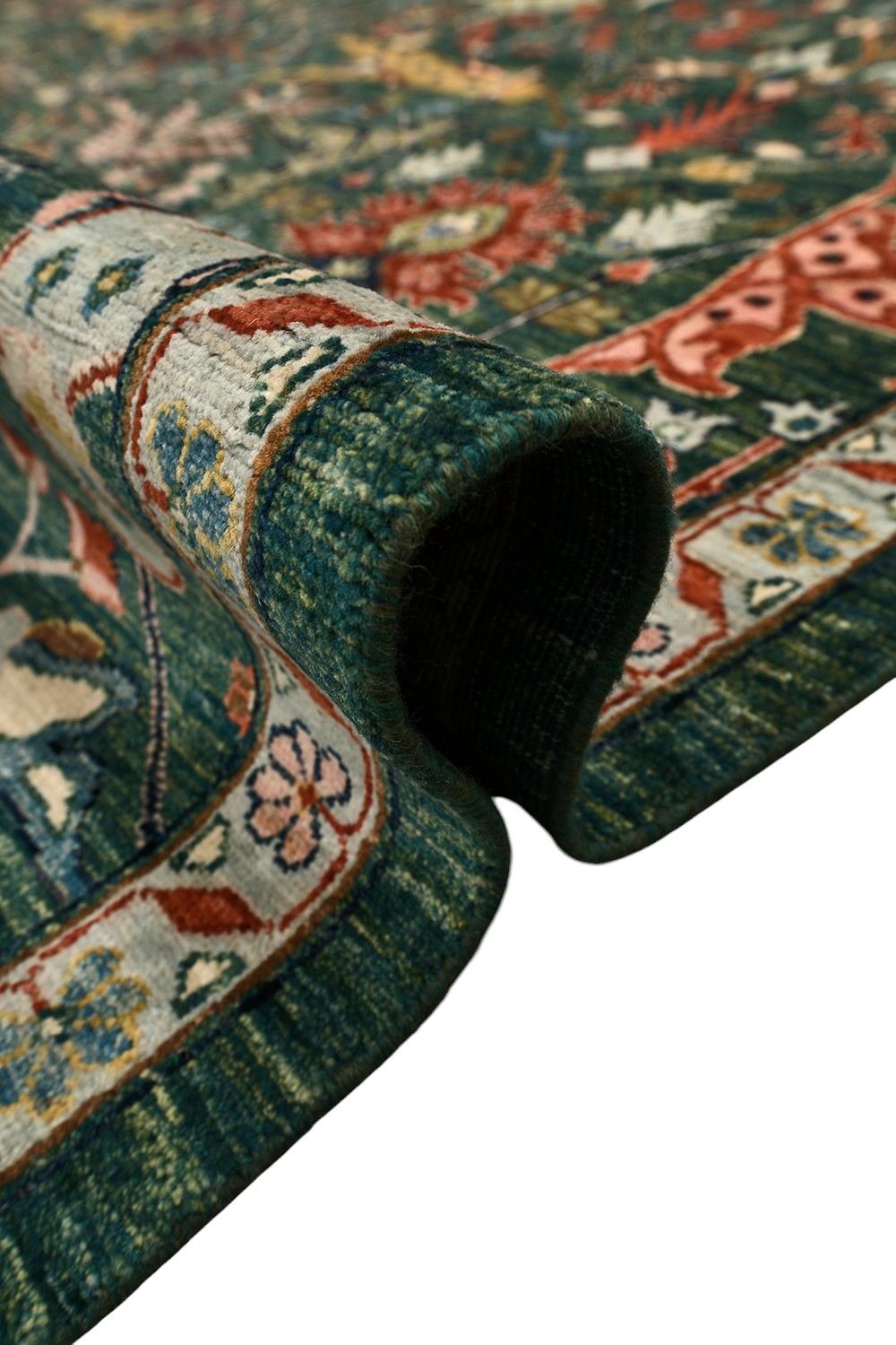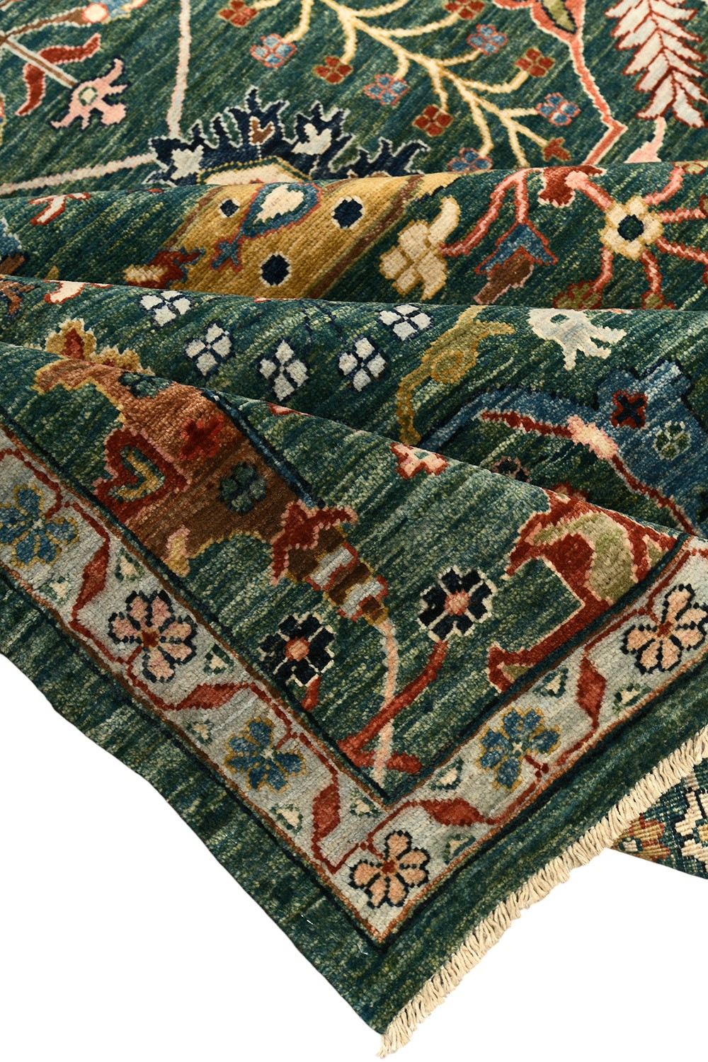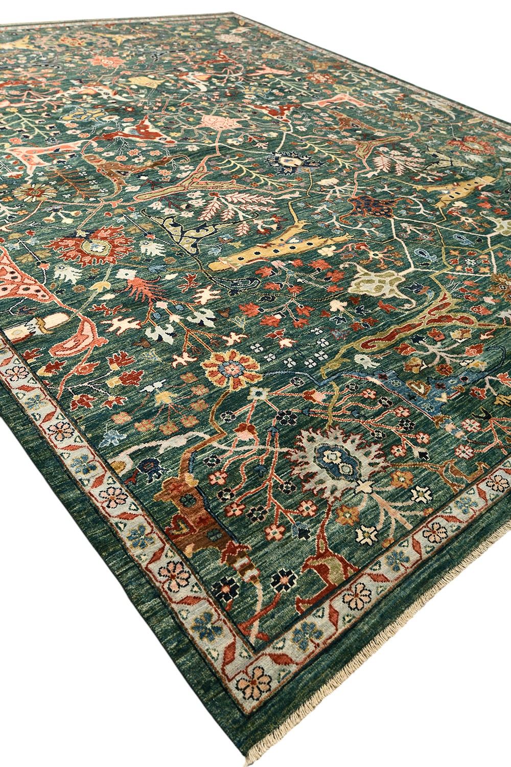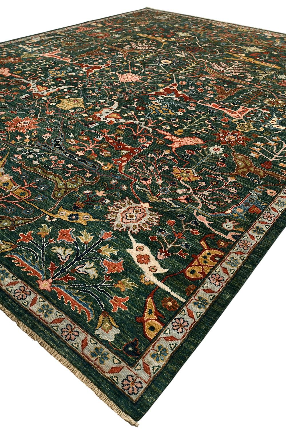 Ковер Saltani из Пакистана создан вручную из натуральной шерсти и украшен богатым орнаментом на глубоком зеленом фоне. Многоцветные узоры и гармоничные сочетания оттенков придают ему изысканность и делают прекрасным выбором для гостиной, кабинета или классического интерьера.