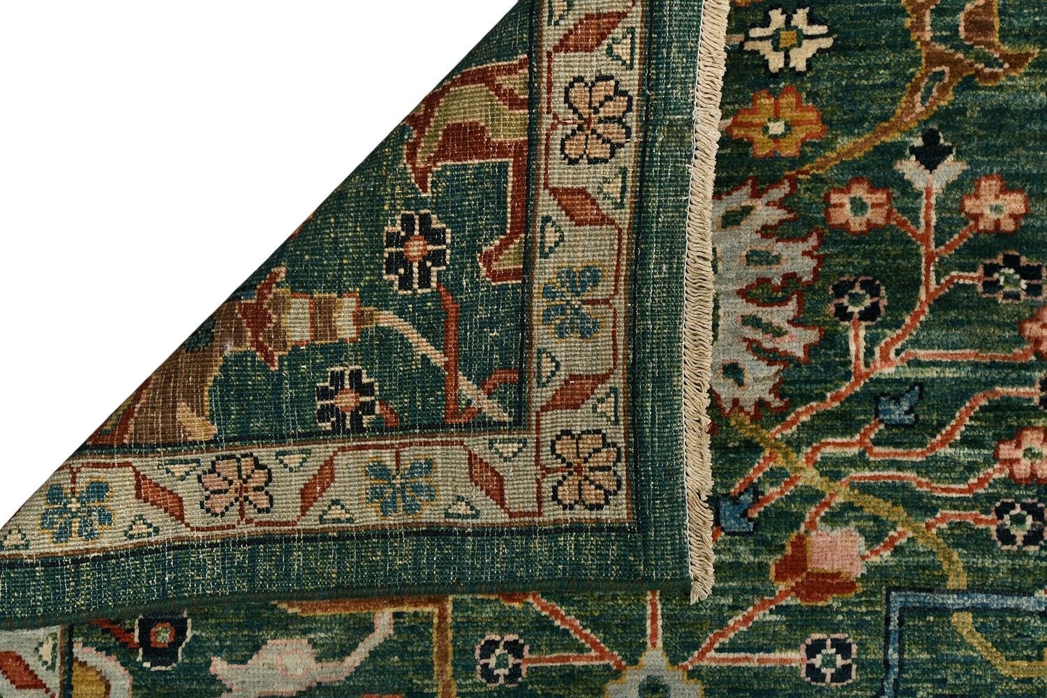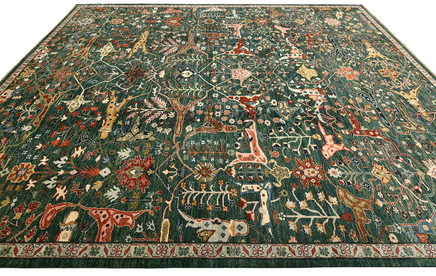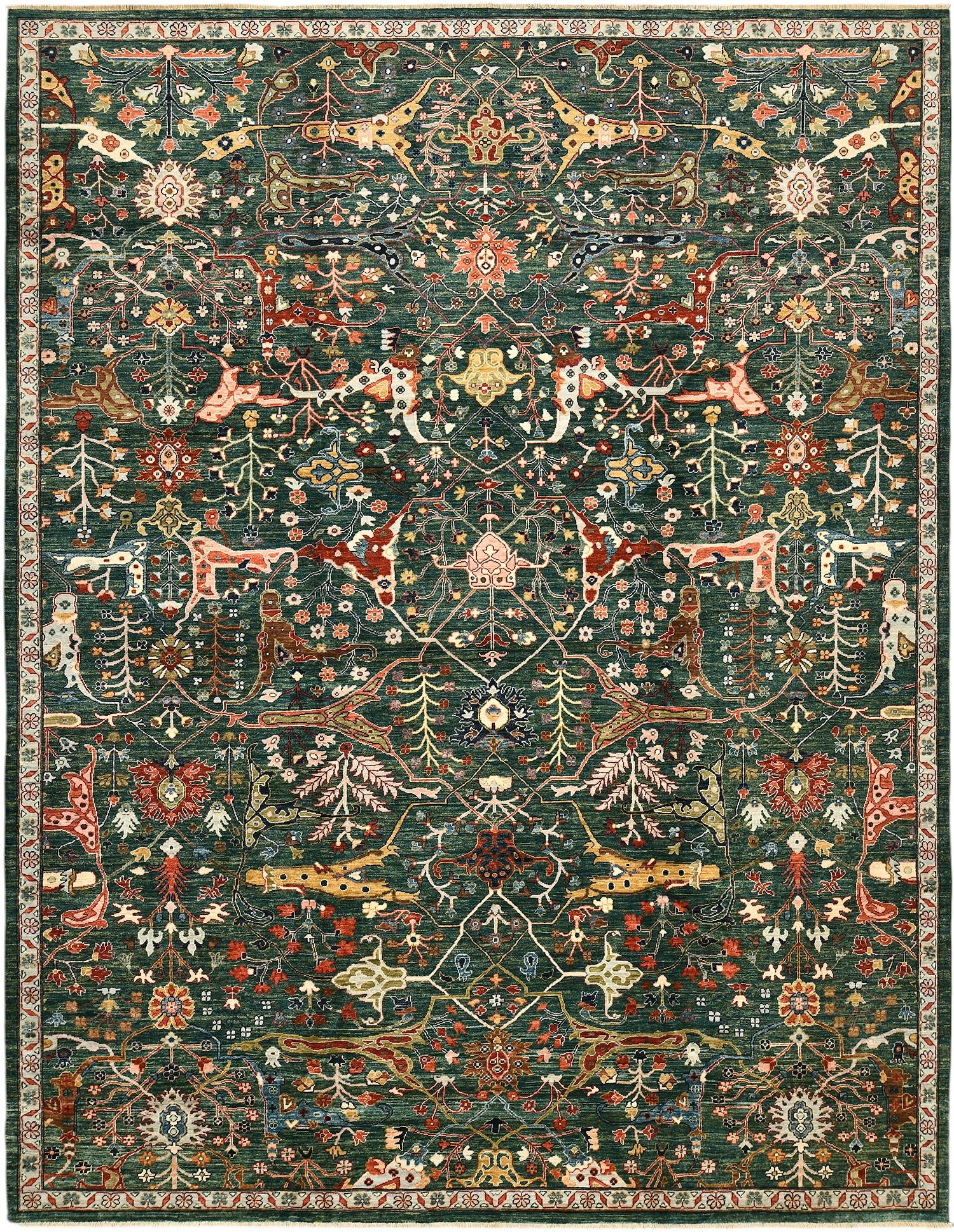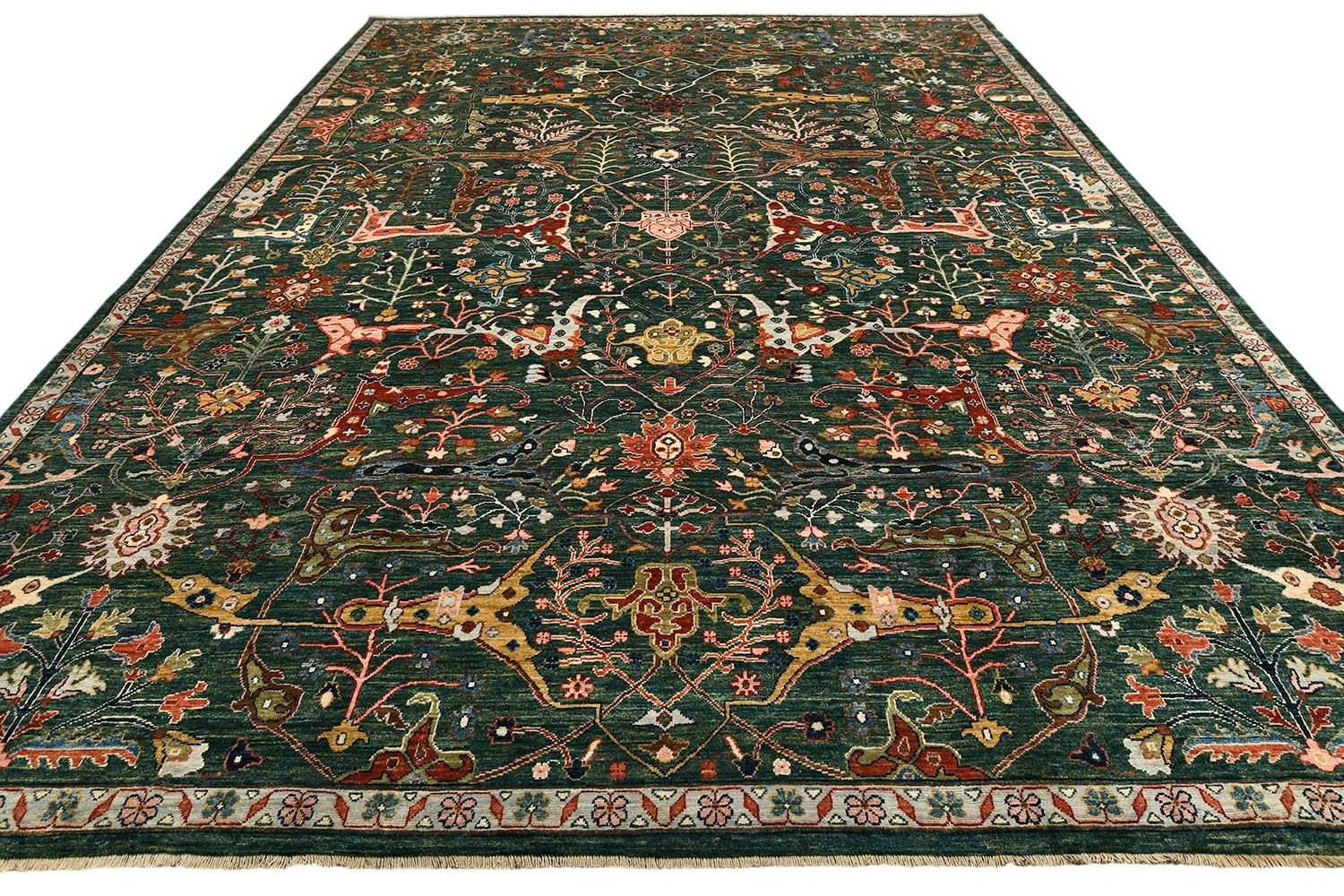 Ковер Saltani из Пакистана создан вручную из натуральной шерсти и украшен богатым орнаментом на глубоком зеленом фоне. Многоцветные узоры и гармоничные сочетания оттенков придают ему изысканность и делают прекрасным выбором для гостиной, кабинета или классического интерьера.