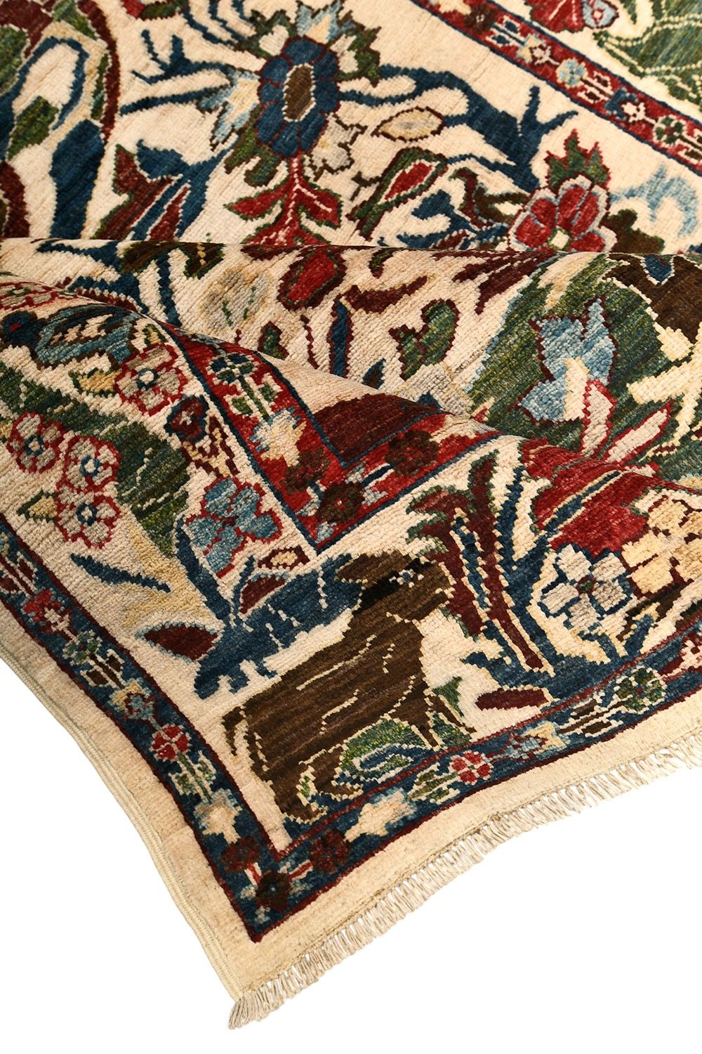 Ручной шерстяной ковер Saltani из Пакистана отличается светлой основой, украшенной сложными цветочными и традиционными восточными узорами. Его насыщенная палитра с красными, зелеными и синими оттенками создаст атмосферу тепла и уюта, подчеркивая изысканный стиль вашего дома.