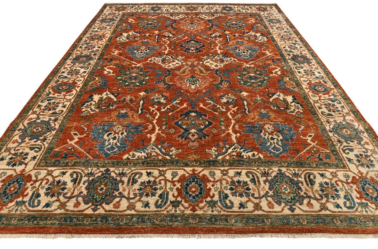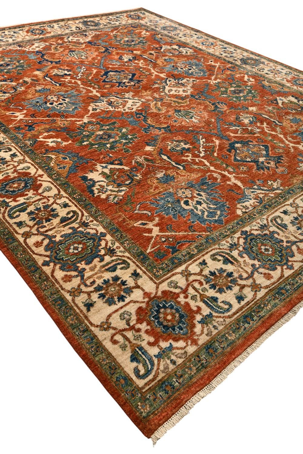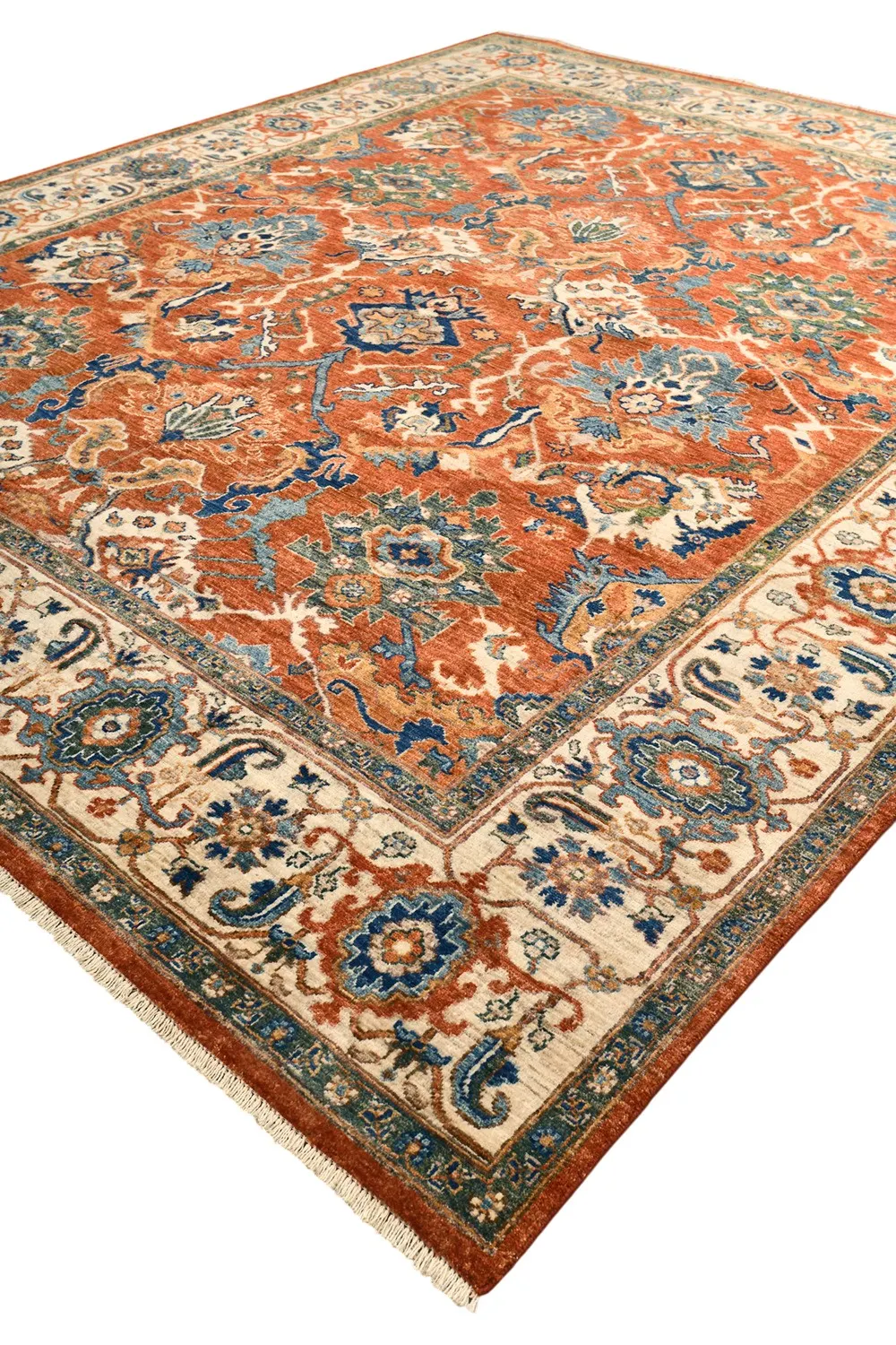 Этот пакистанский ковер Saltani ручной работы поражает выразительной терракотово-красной основой с акцентами синего, кремового и зеленого в растительном орнаменте. Изящный бордюр с цветочными мотивами гармонично обрамляет композицию. Ковер соткан из шерсти веретенной крутки и окрашен натуральными красителями, что подчеркивает его аутентичность и изысканный характер.