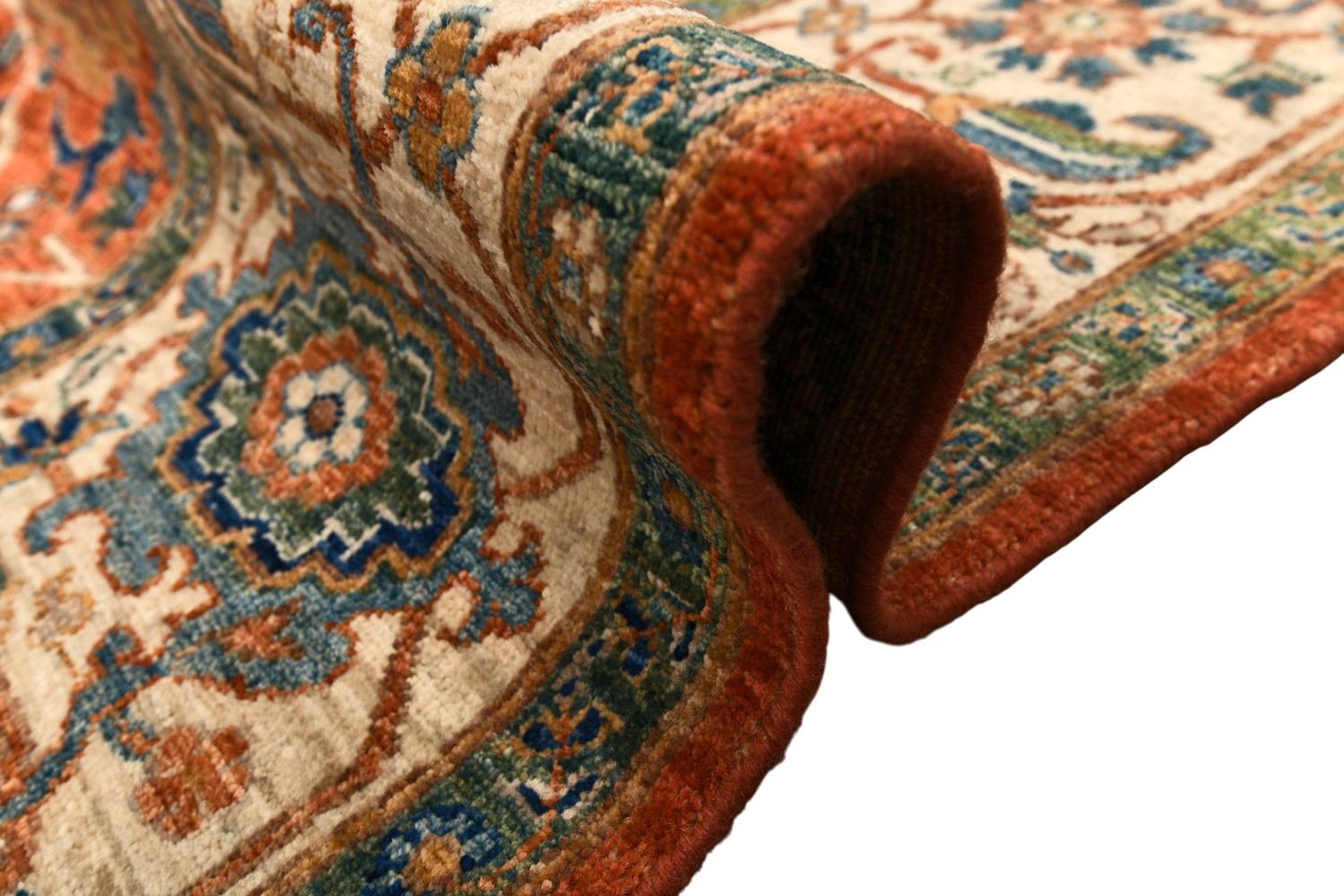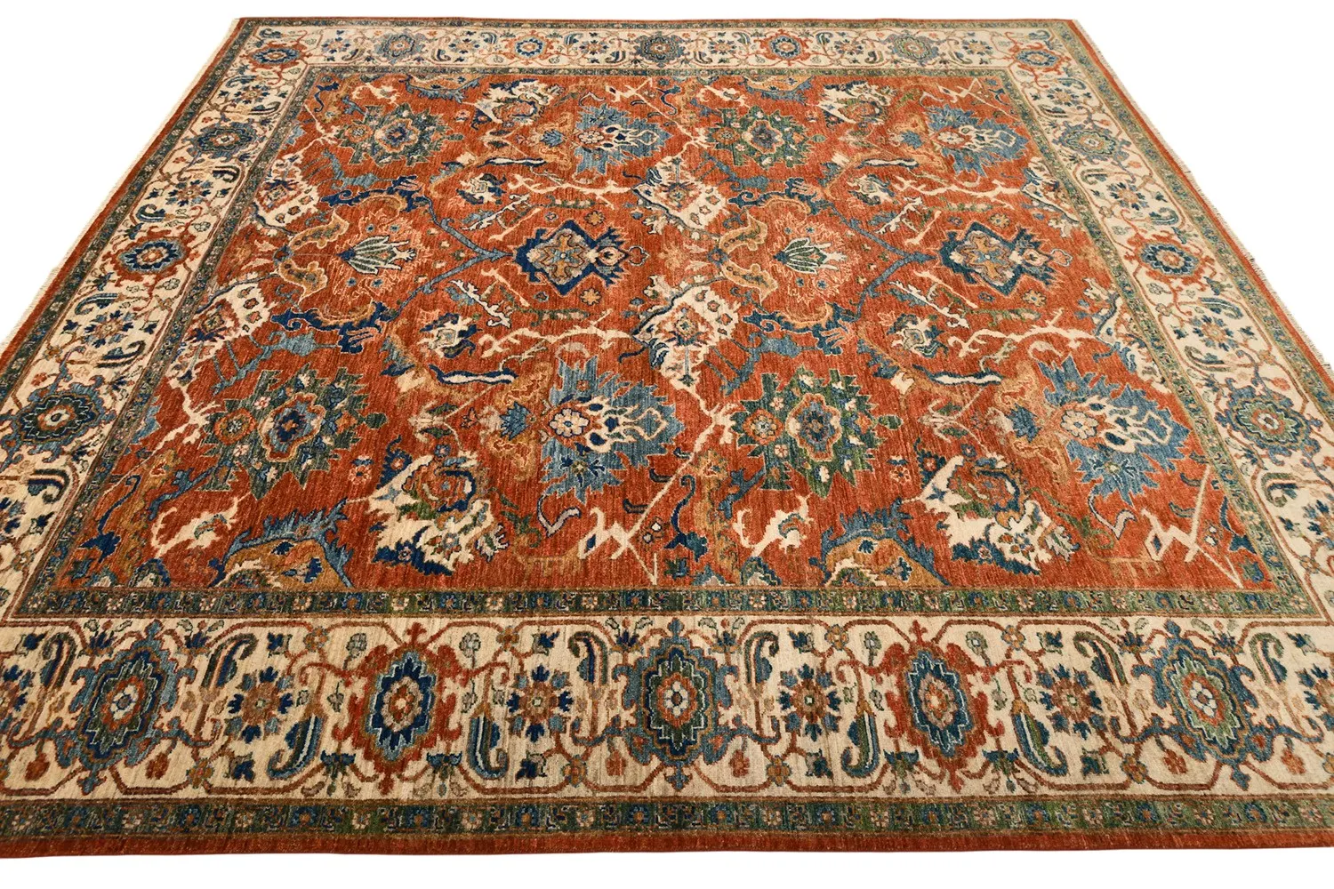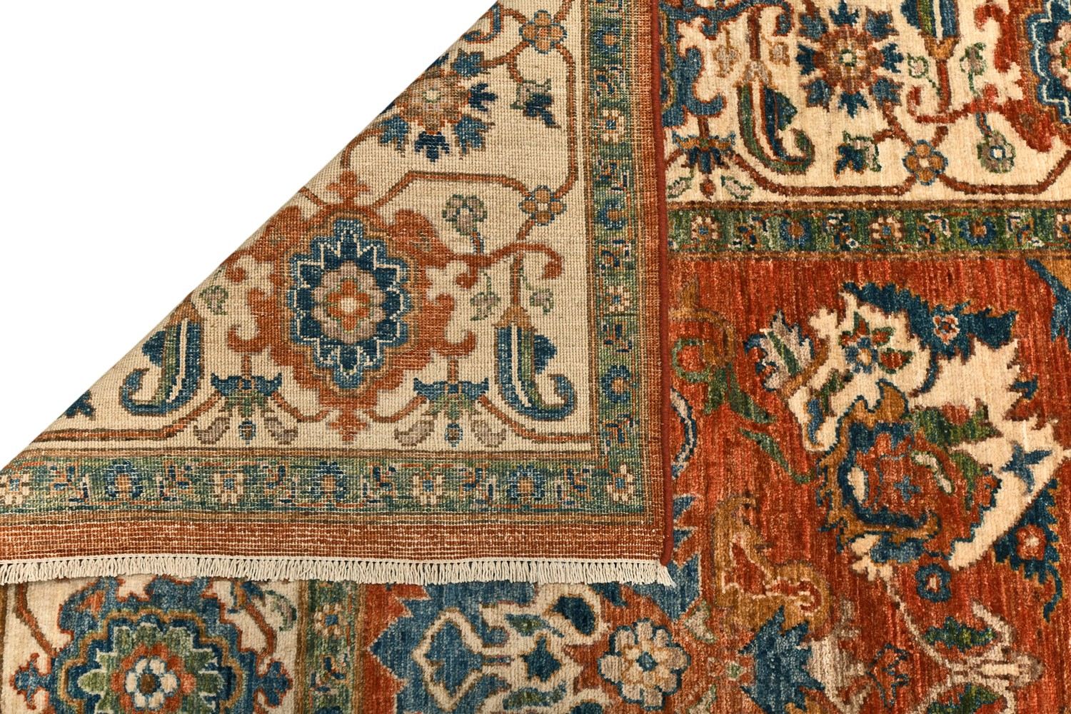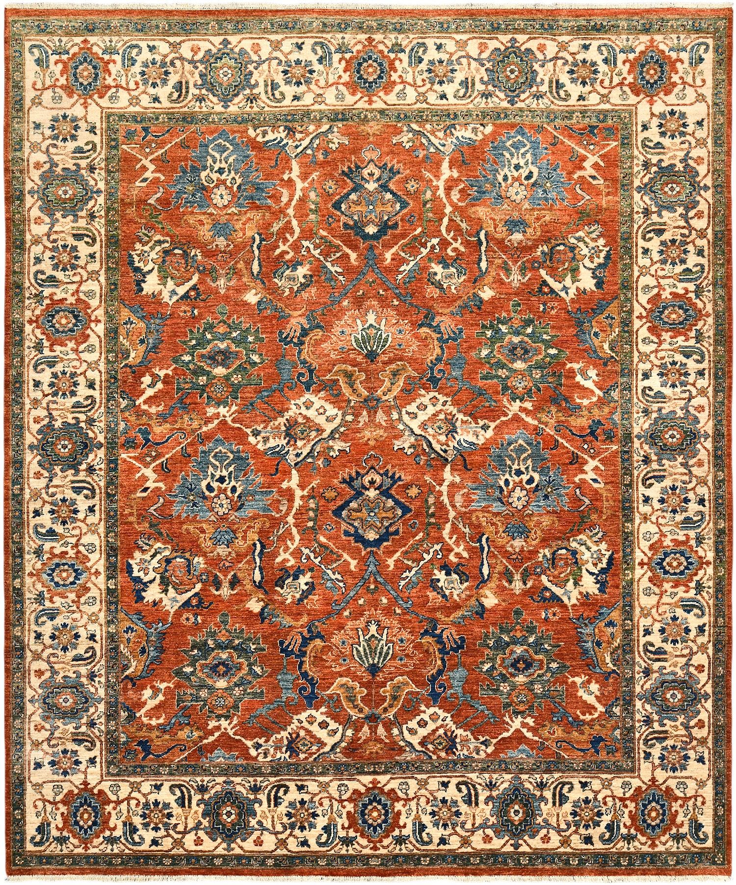 Этот пакистанский ковер Saltani ручной работы поражает выразительной терракотово-красной основой с акцентами синего, кремового и зеленого в растительном орнаменте. Изящный бордюр с цветочными мотивами гармонично обрамляет композицию. Ковер соткан из шерсти веретенной крутки и окрашен натуральными красителями, что подчеркивает его аутентичность и изысканный характер.