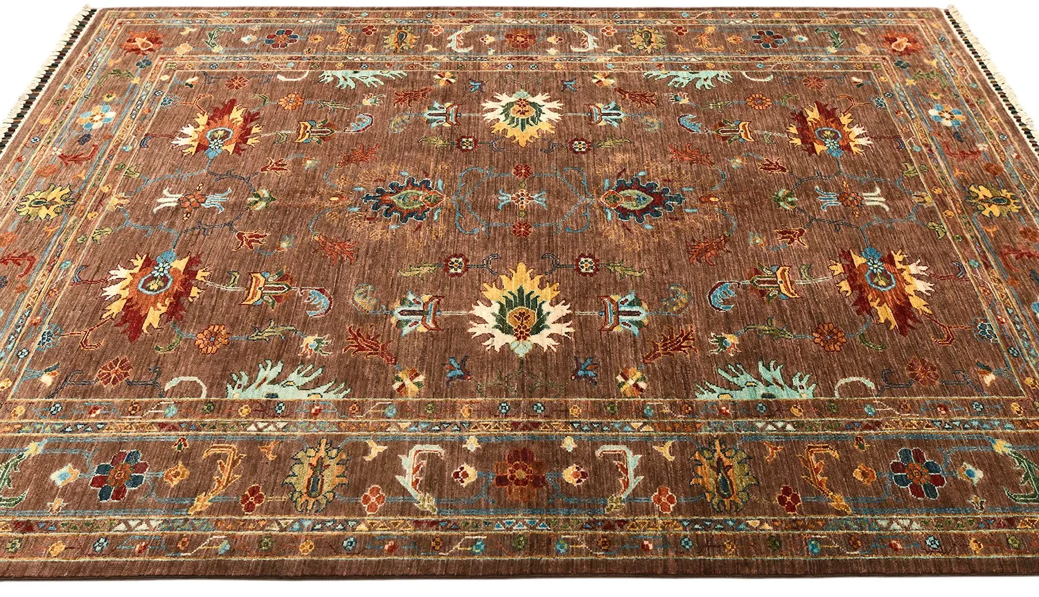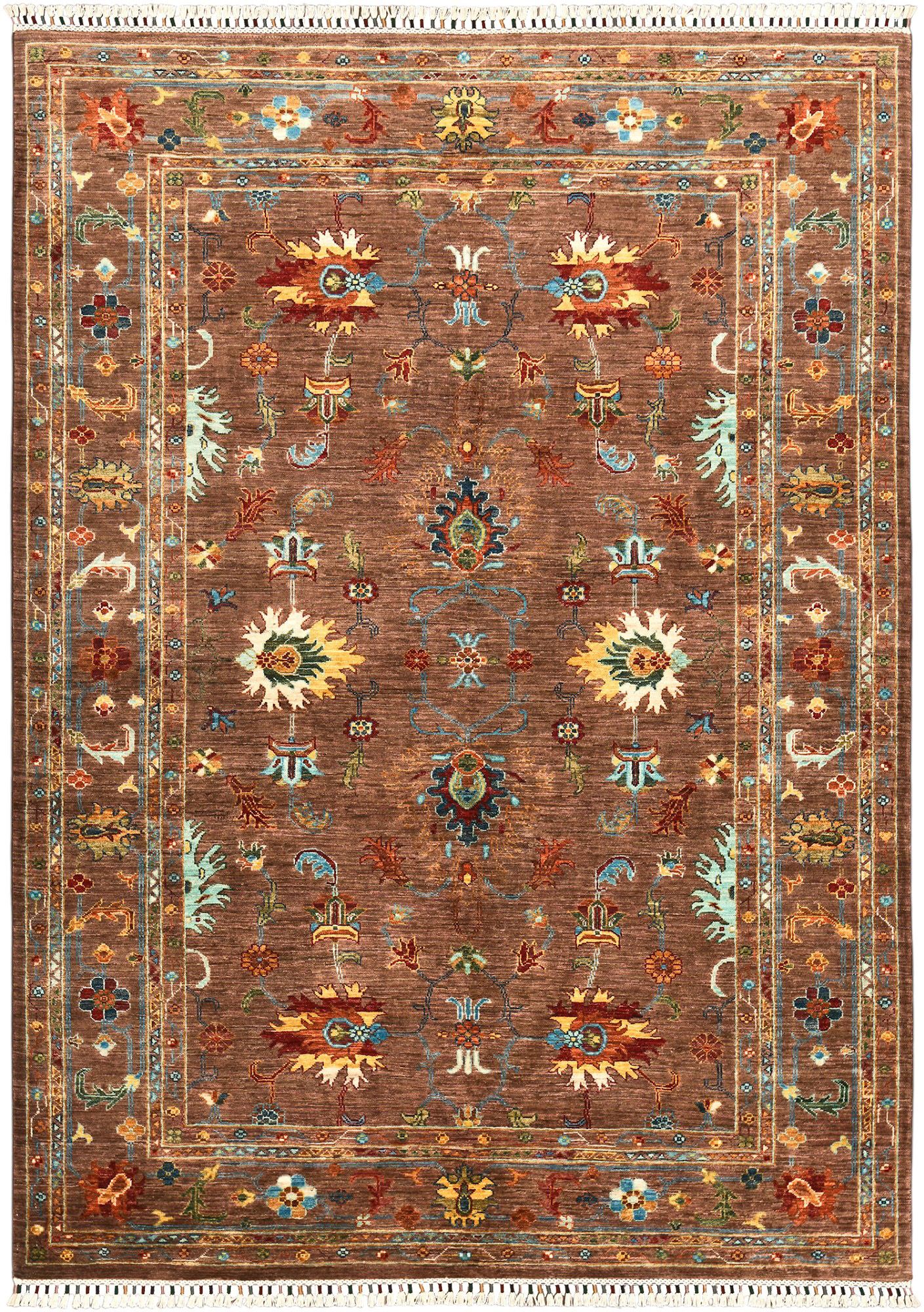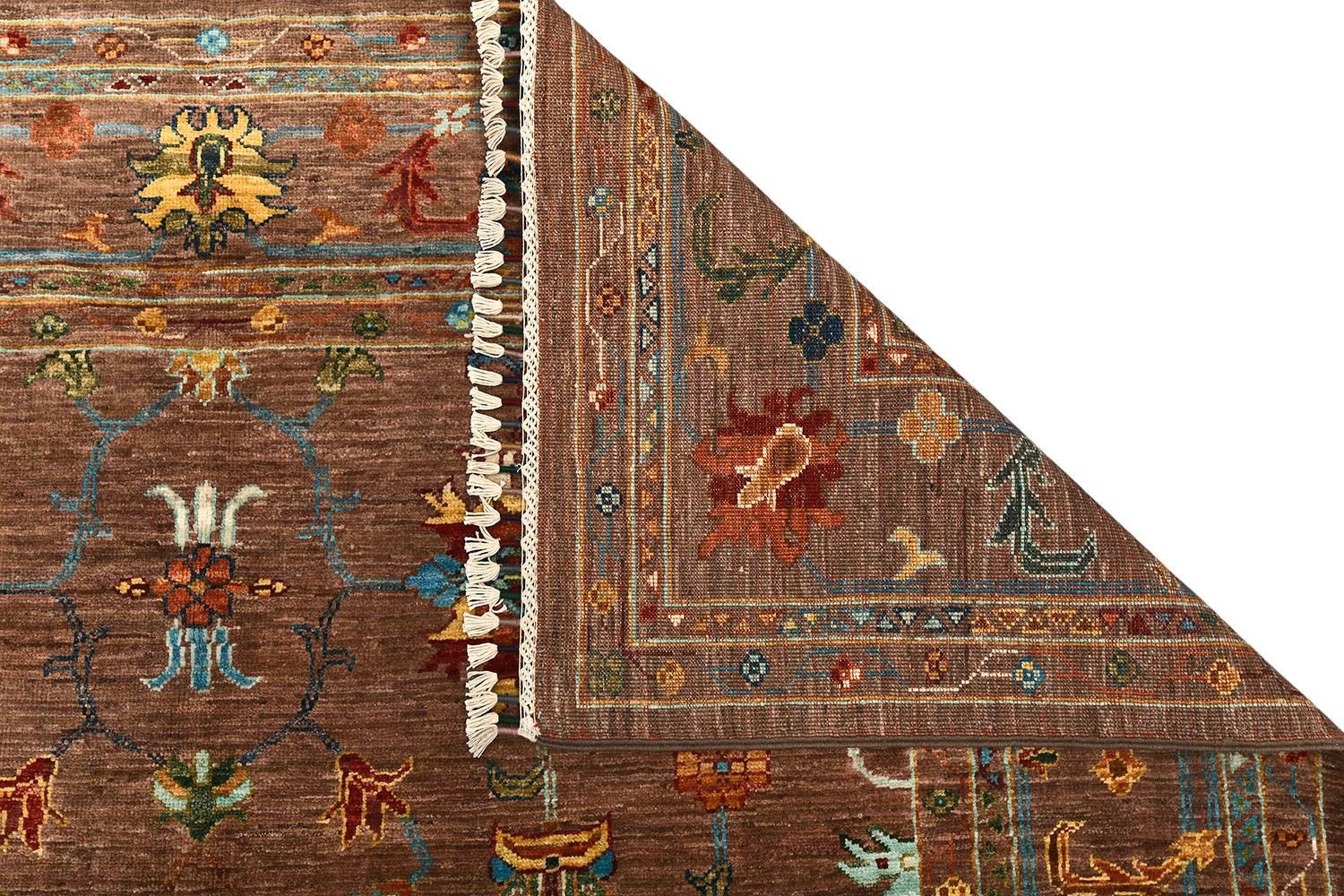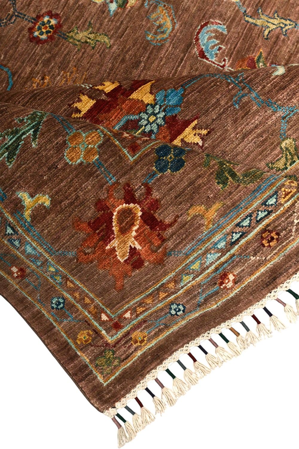 Пакистанский шерстяной ковер Ziegler выполнен вручную и украшен ярким цветочным орнаментом на глубоком коричневом фоне. Контрастные узоры в голубых, кремовых и красных тонах создают атмосферу уюта и изысканности. Такой ковер гармонично дополнит гостиную, столовую или кабинет, придавая интерьеру благородный характер.