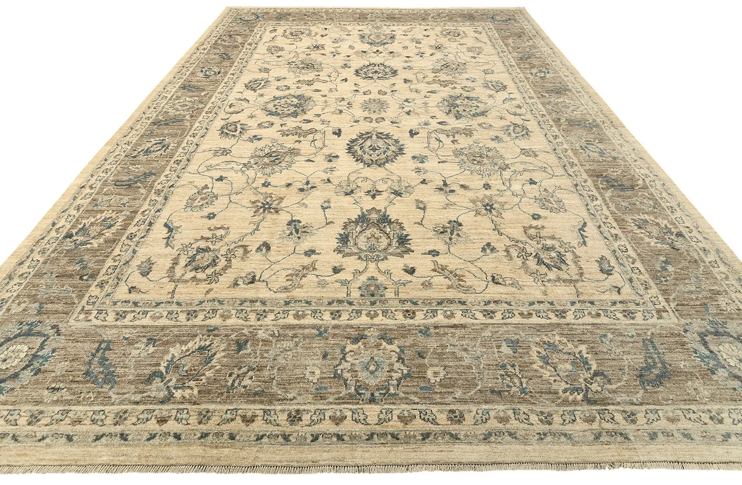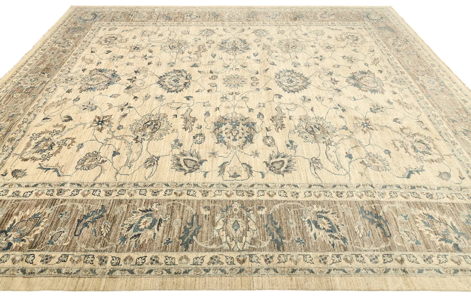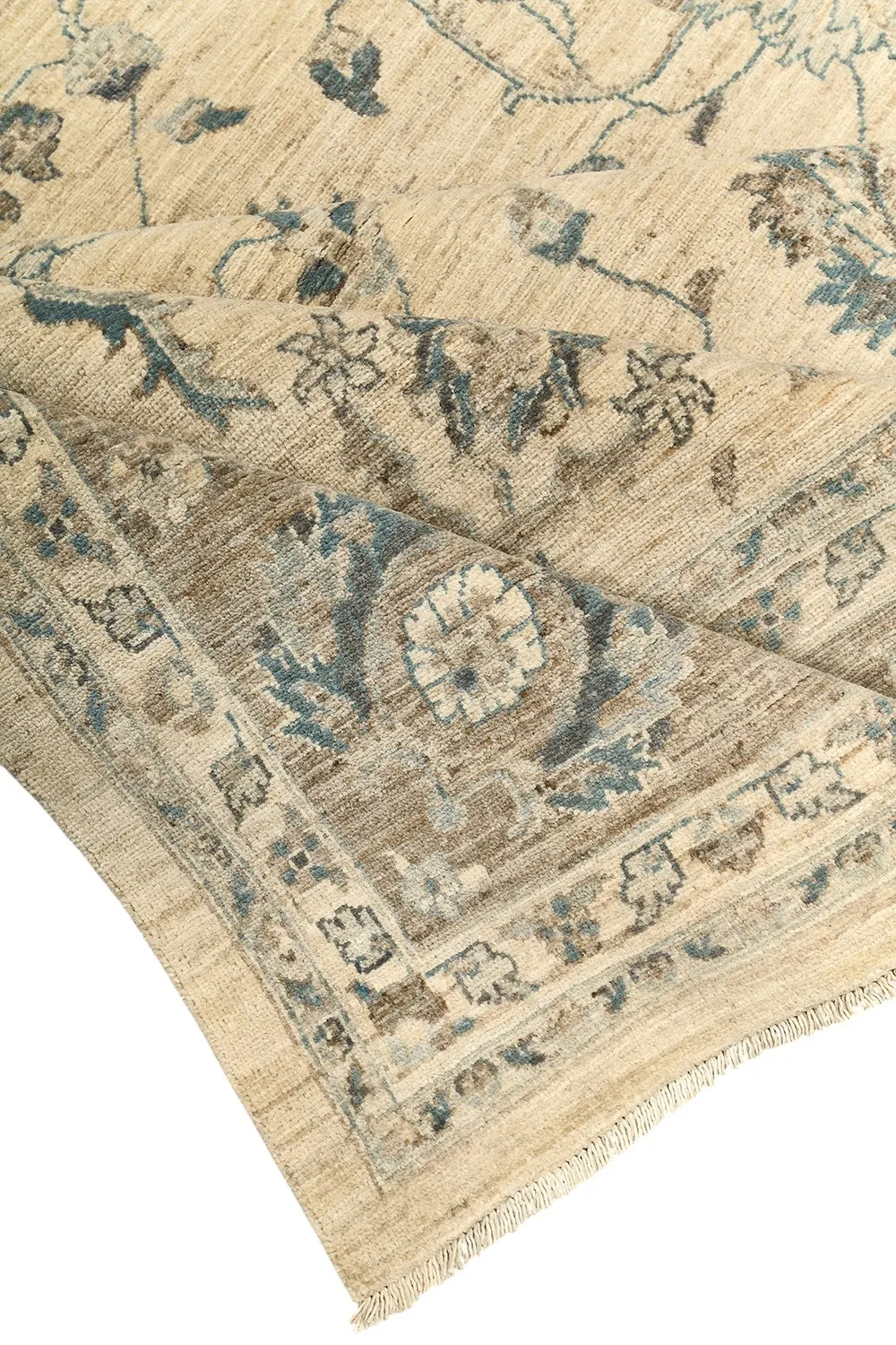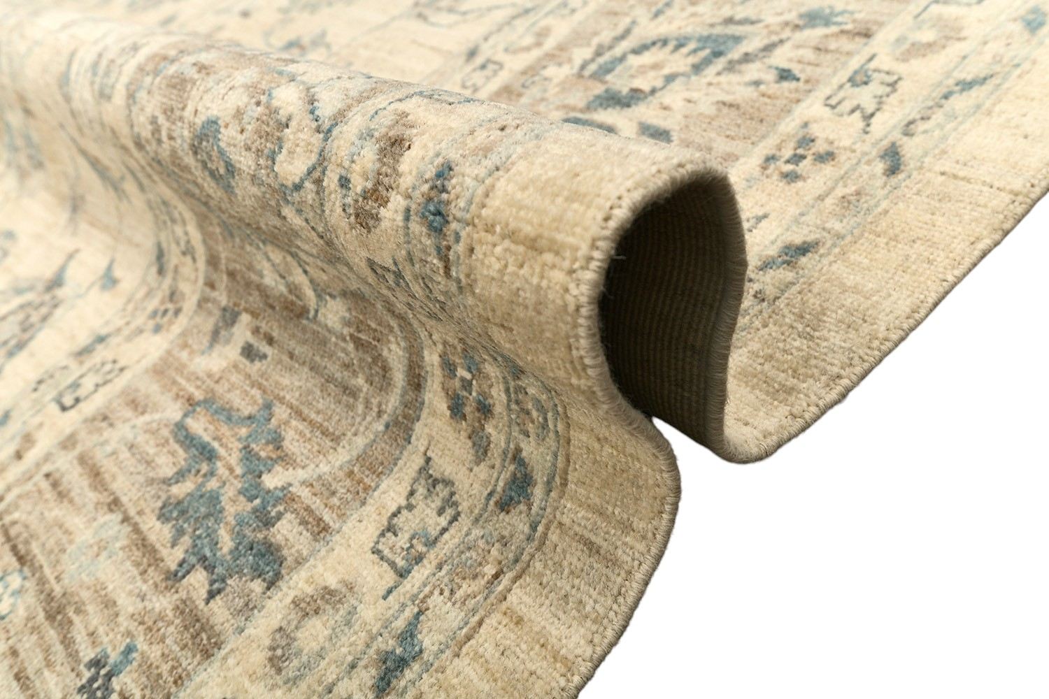 Пакистанский шерстяной ковер Ziegler ручной работы выполнен в светлой цветовой гамме с гармоничным сочетанием кремового, бежевого и голубовато-серого оттенков. Классический цветочный орнамент в восточном стиле придает ему утонченность и благородство. Благодаря мягкой шерсти и плотному узору ковер не только украсит интерьер, но и создаст атмосферу тепла и уюта.