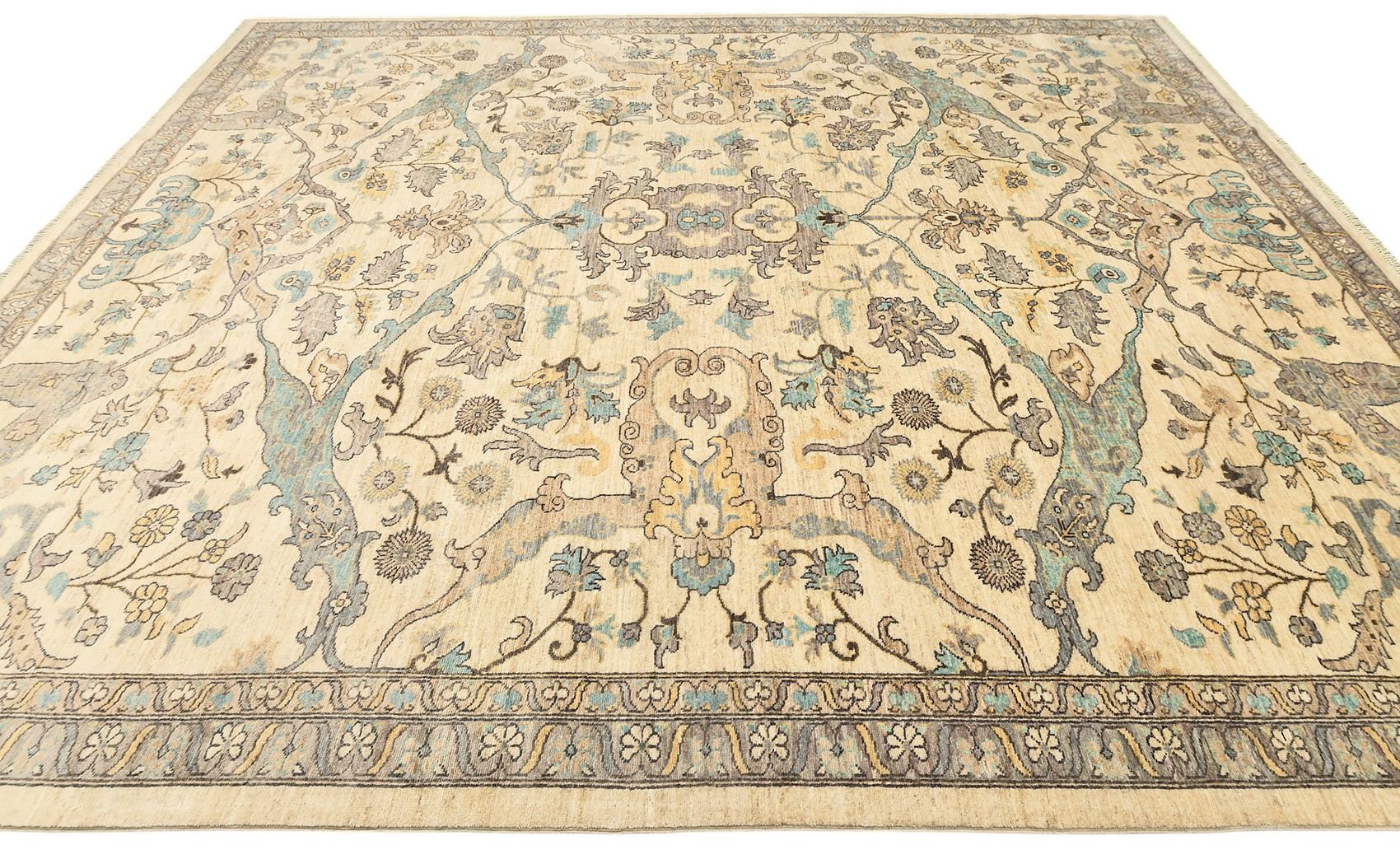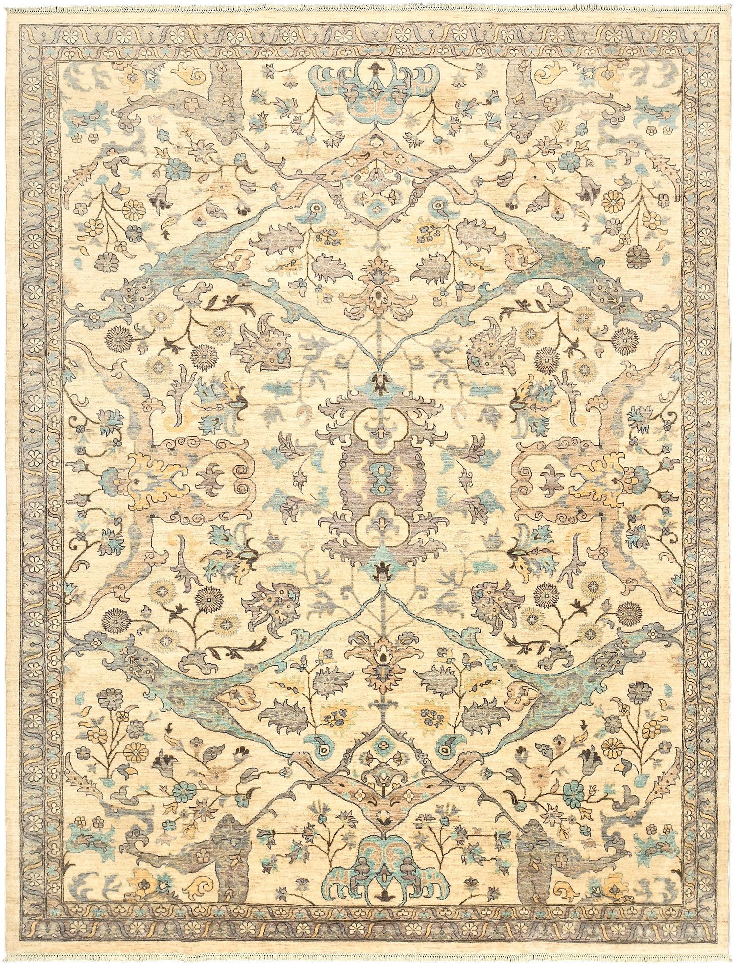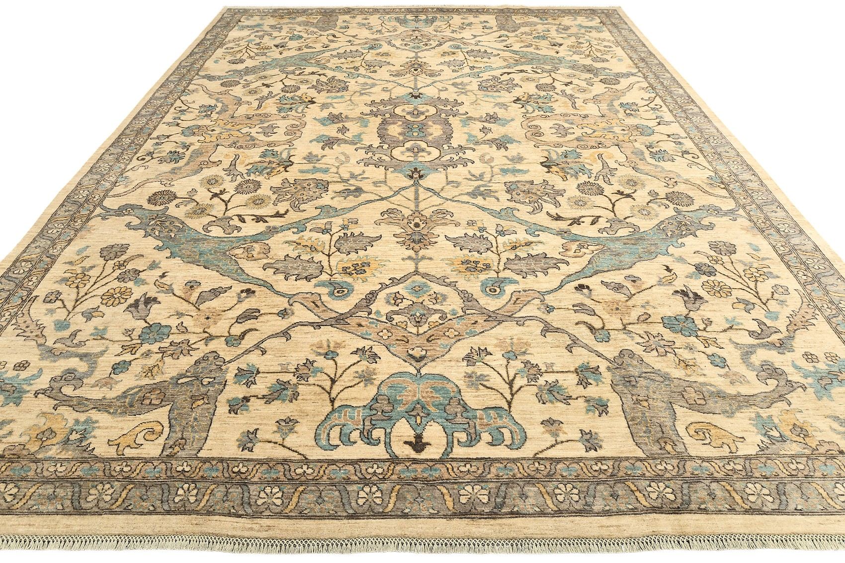 Шерстяной ковер Ziegler из Пакистана – воплощение восточной утонченности и мастерства. Его нежная бежево-кремовая основа украшена изящным растительным орнаментом с мягкими голубыми и серыми оттенками, что придает ковру свежесть и легкость. Классический симметричный рисунок подчеркивает гармонию и элегантность, делая изделие идеальным дополнением к современным и традиционным интерьерам.