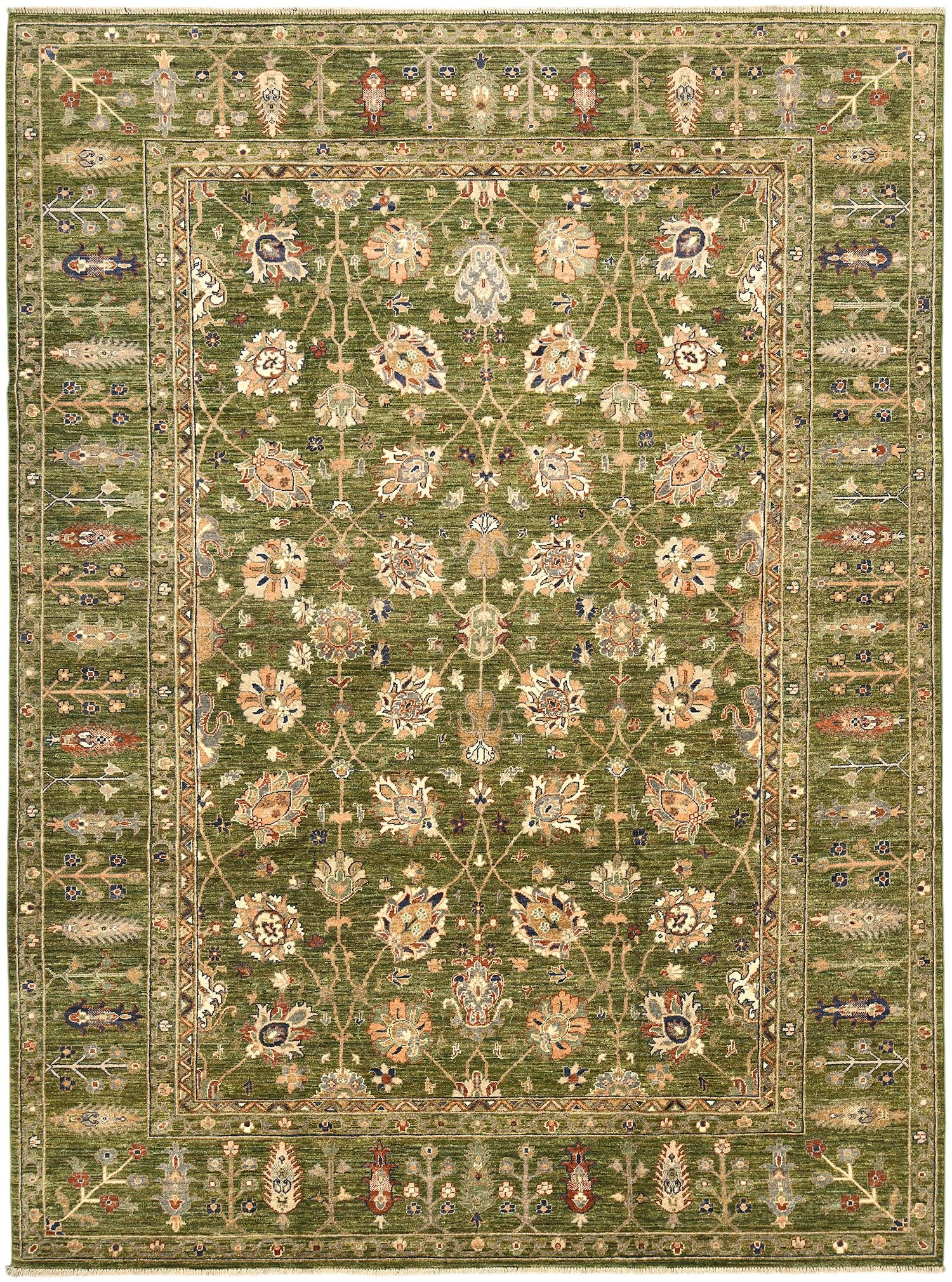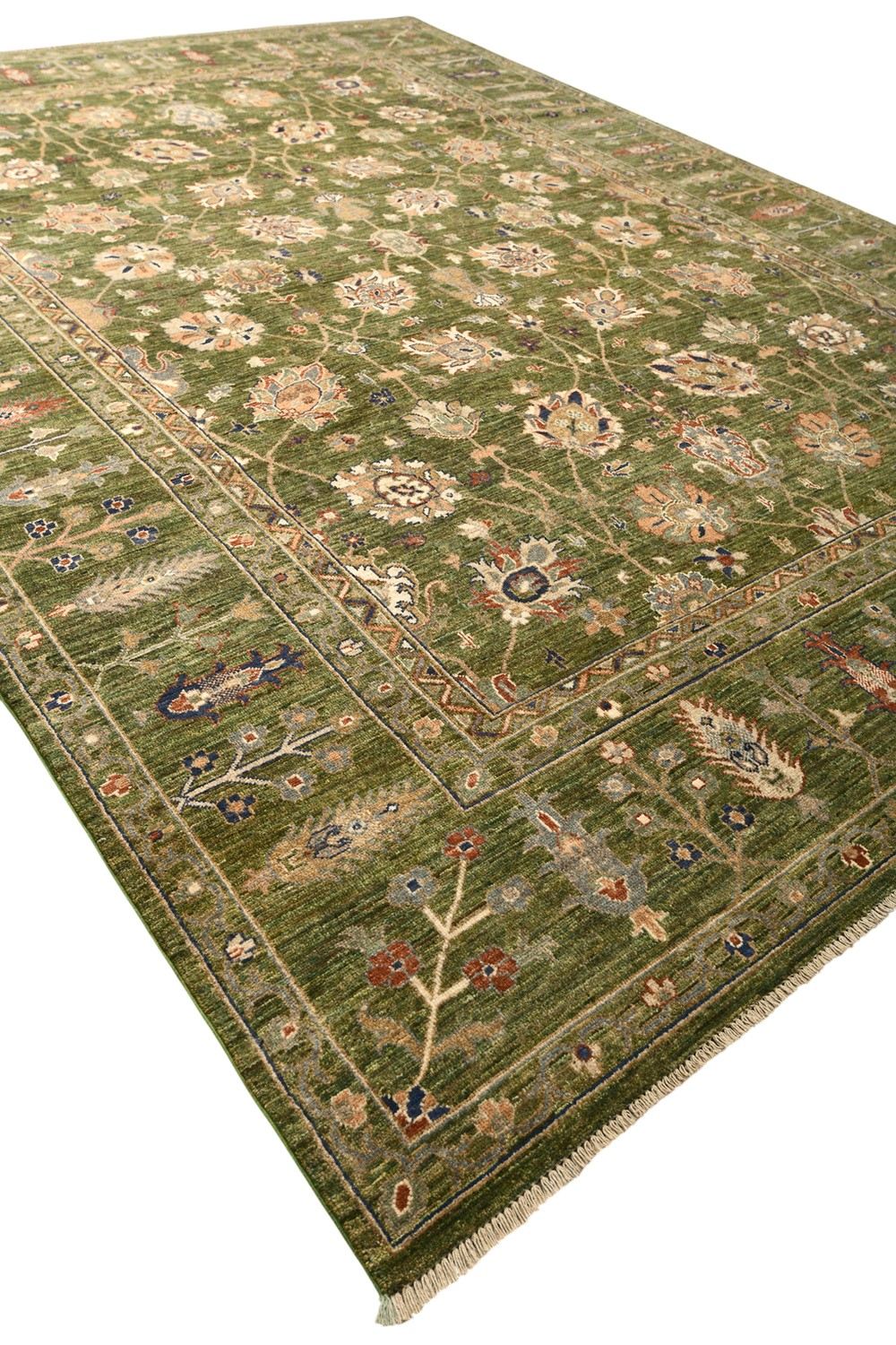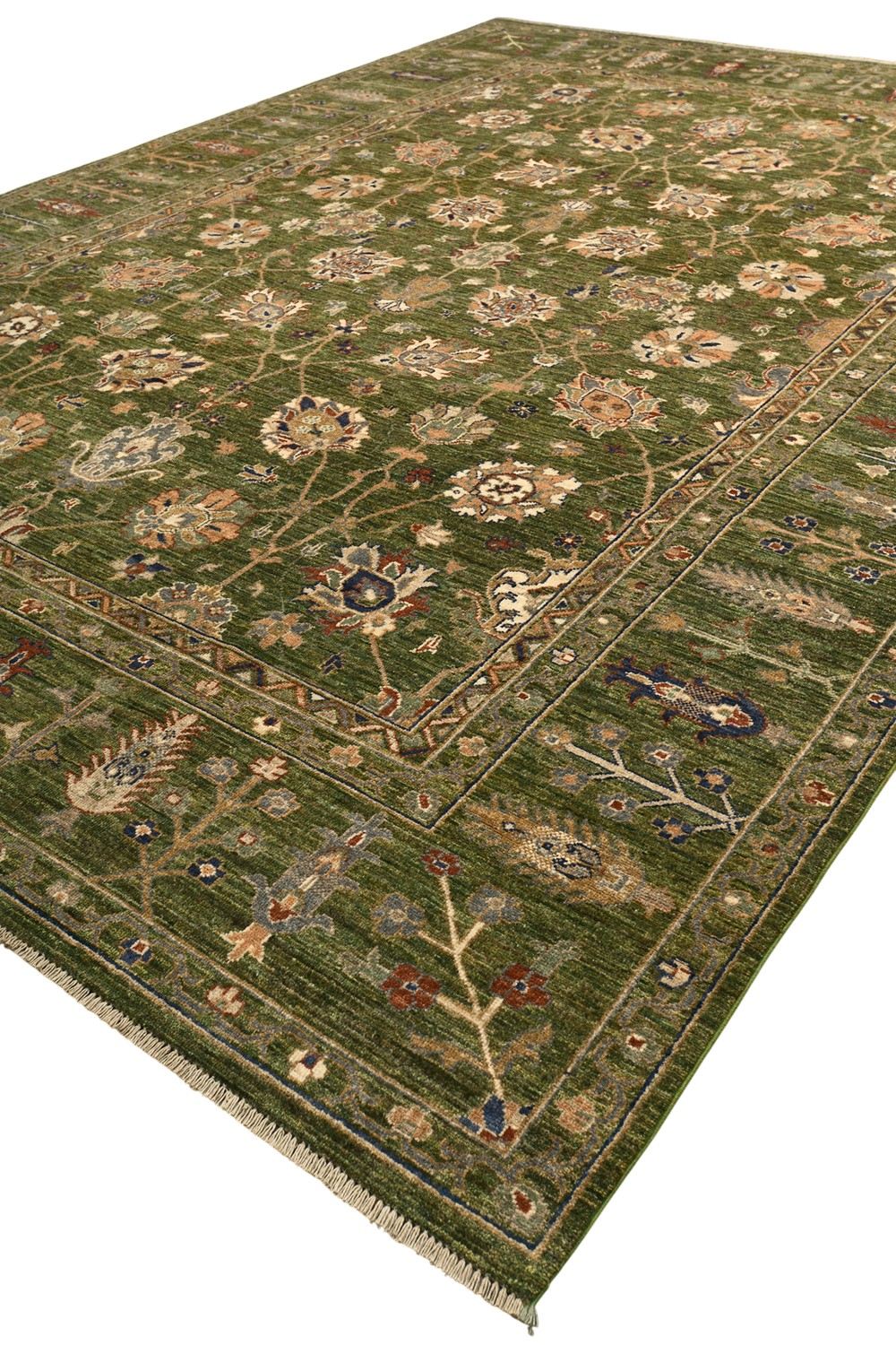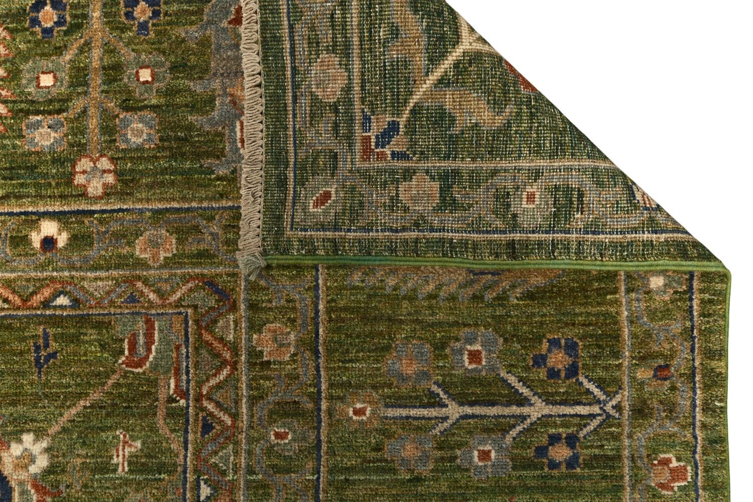 Роскошный ковер Ziegler выполнен в классической технике ручного ткачества и украшен утонченным растительным орнаментом. Глубокий зеленый фон гармонично сочетается с мягкими бежевыми, терракотовыми и синими акцентами, создавая изысканную и теплую цветовую гамму. Изготовленный по старинной технологии из шерстяной нити веретенной крутки с применением натуральных красителей, этот ковер станет элегантным украшением интерьера.