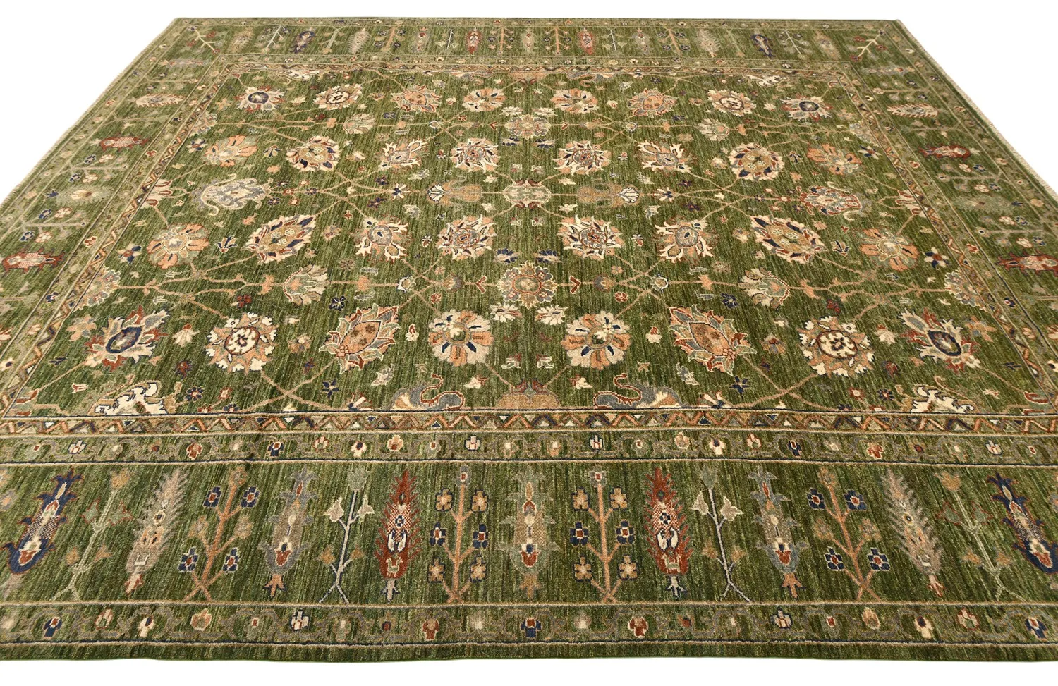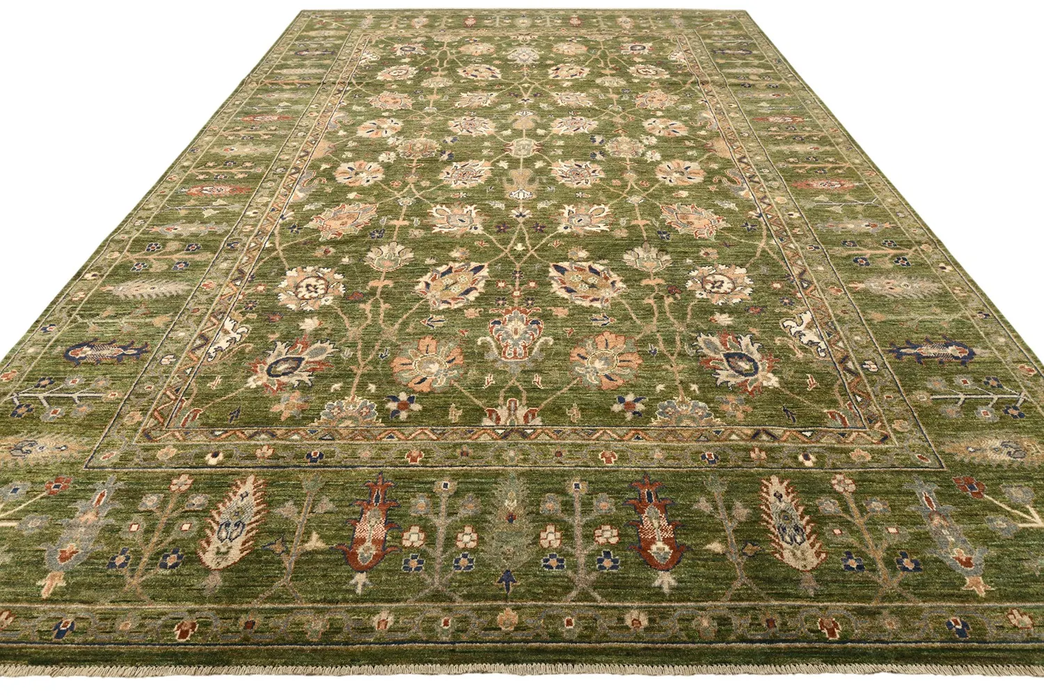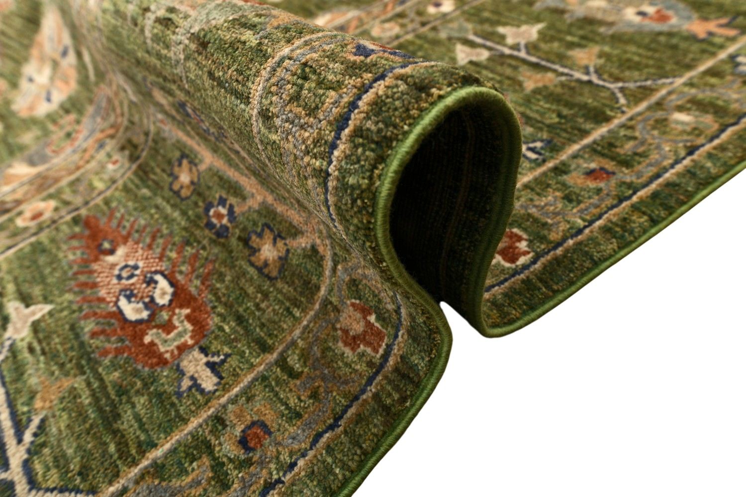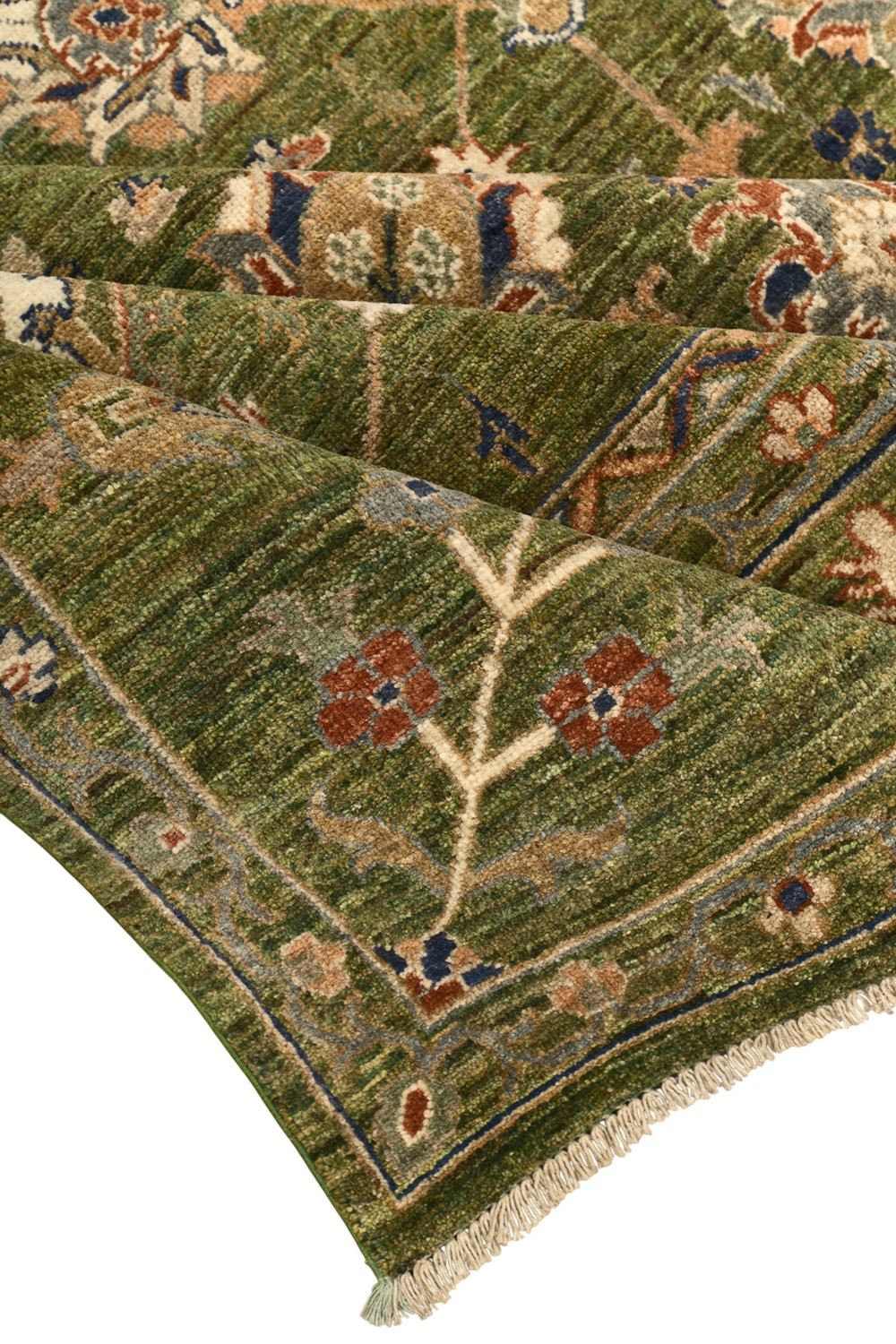 Роскошный ковер Ziegler выполнен в классической технике ручного ткачества и украшен утонченным растительным орнаментом. Глубокий зеленый фон гармонично сочетается с мягкими бежевыми, терракотовыми и синими акцентами, создавая изысканную и теплую цветовую гамму. Изготовленный по старинной технологии из шерстяной нити веретенной крутки с применением натуральных красителей, этот ковер станет элегантным украшением интерьера.