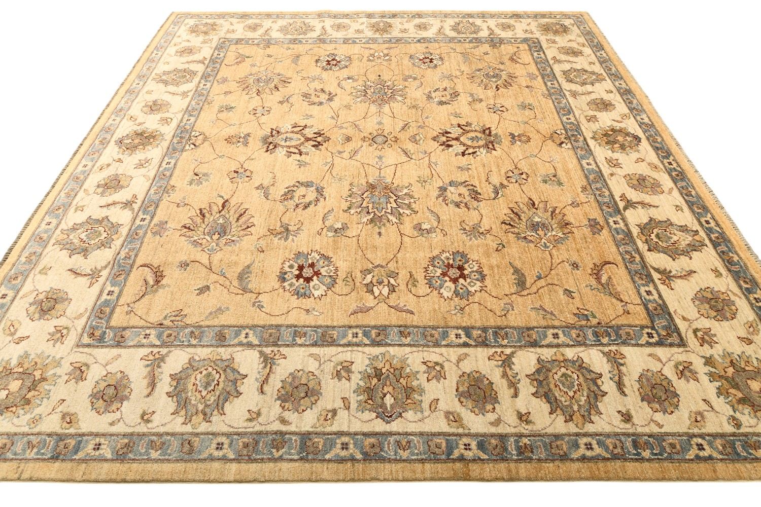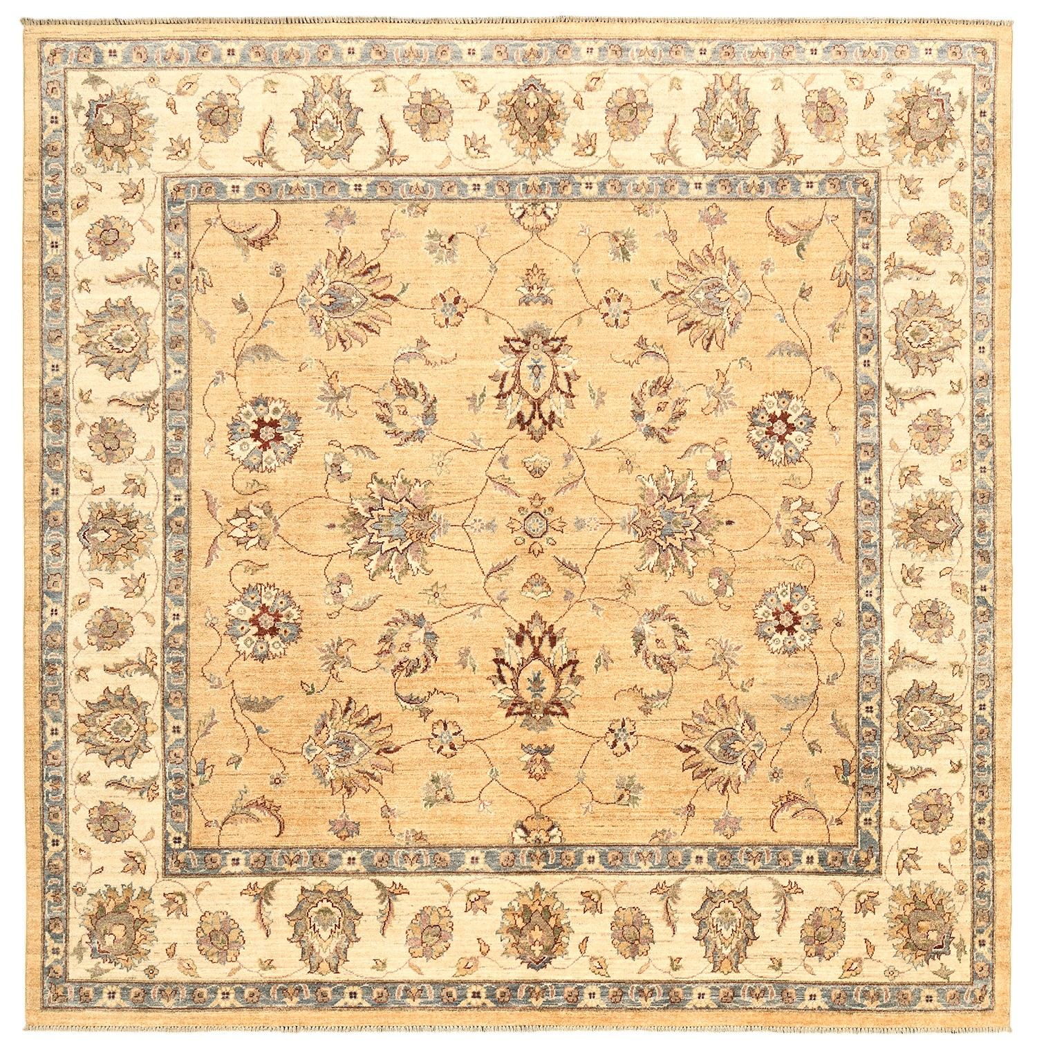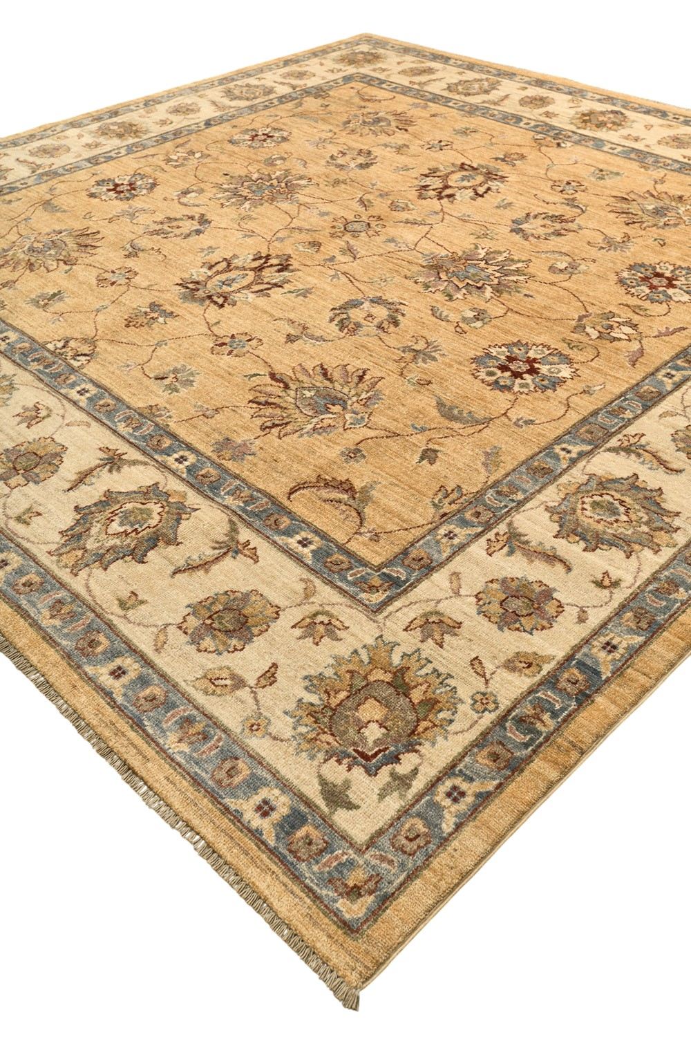 Этот ковер Ziegler ручной работы из Пакистана выполнен в благородной золотисто-бежевой гамме с акцентами кремового и нежно-голубого в изящной кайме. Узор в виде цветочных мотивов и тонкой растительной сетки придает ковру легкость и гармонию. Сотканный из шерсти веретенной крутки и окрашенный натуральными красителями, он сочетает в себе древние традиции и утончённую эстетику.